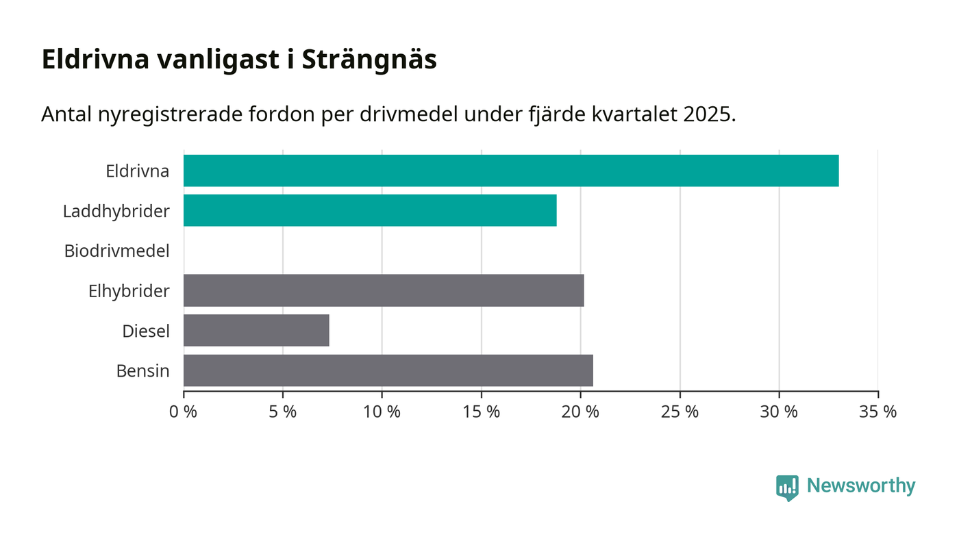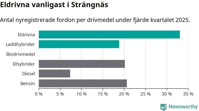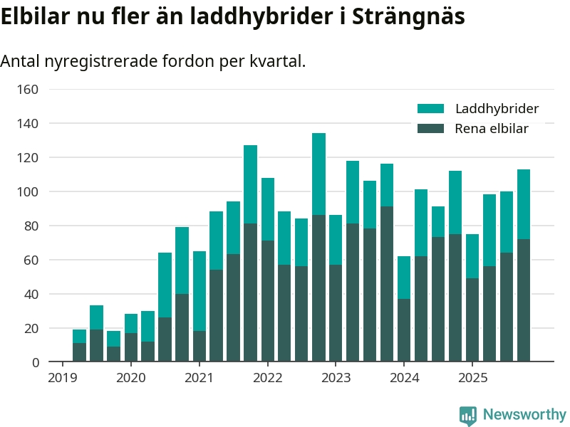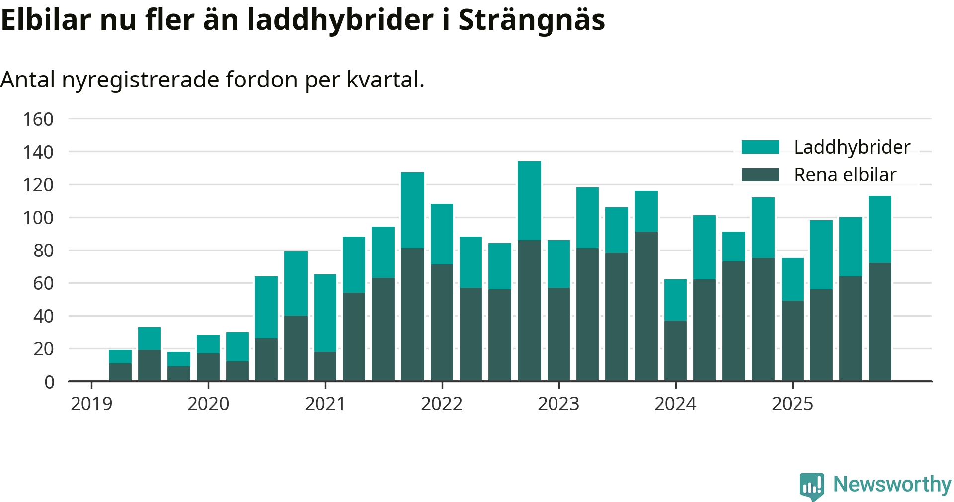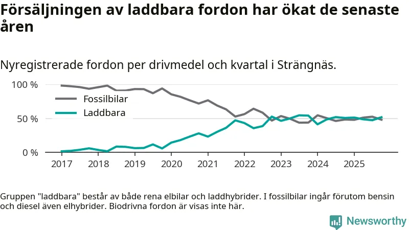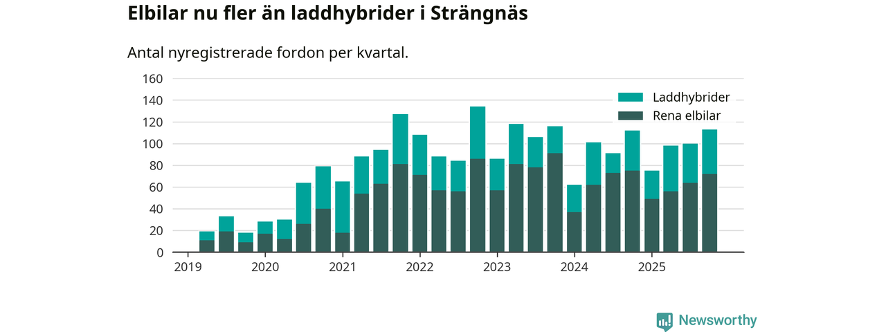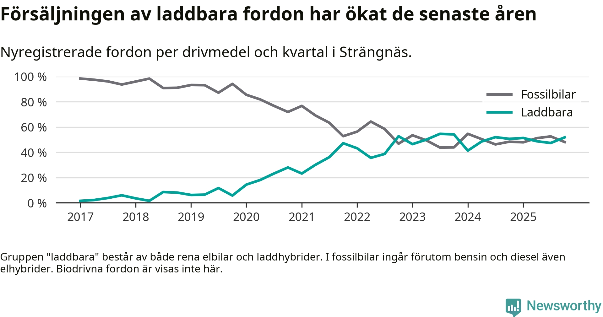 Under fjärde kvartalet 2025 var 52 procent av alla nyregistrerade personbilar i Strängnäs laddbara (sammanlagt registrerades 218 nya bilar). Merparten av de laddbara bilarna var rena elbilar (33 procent av alla).