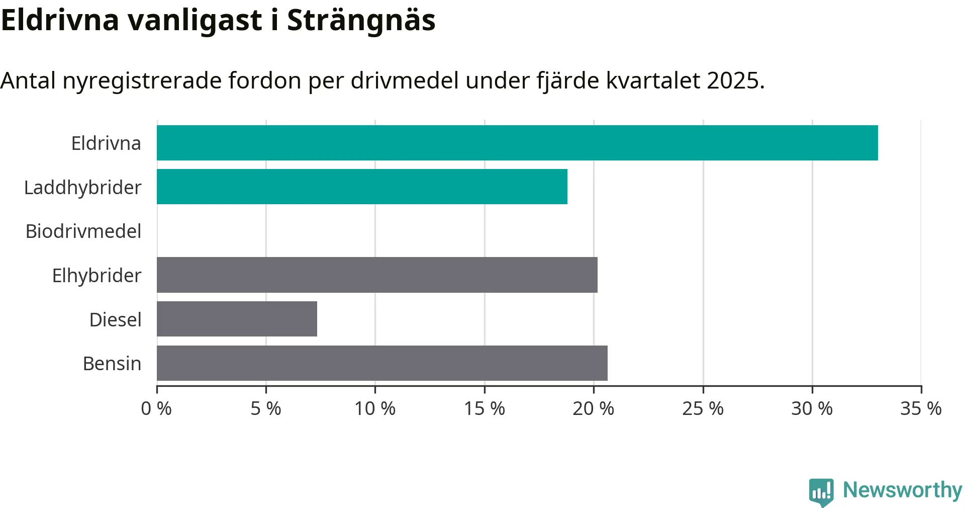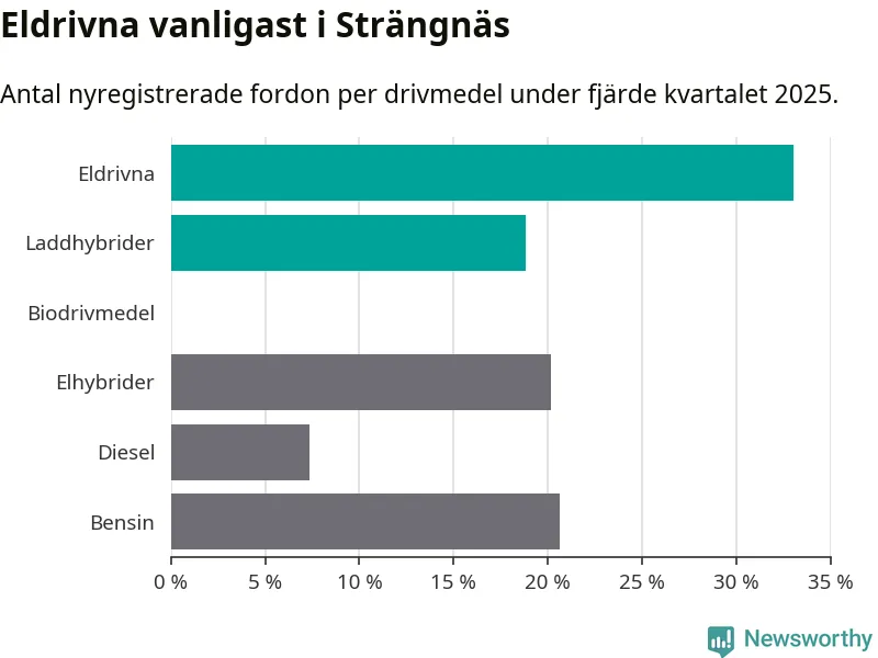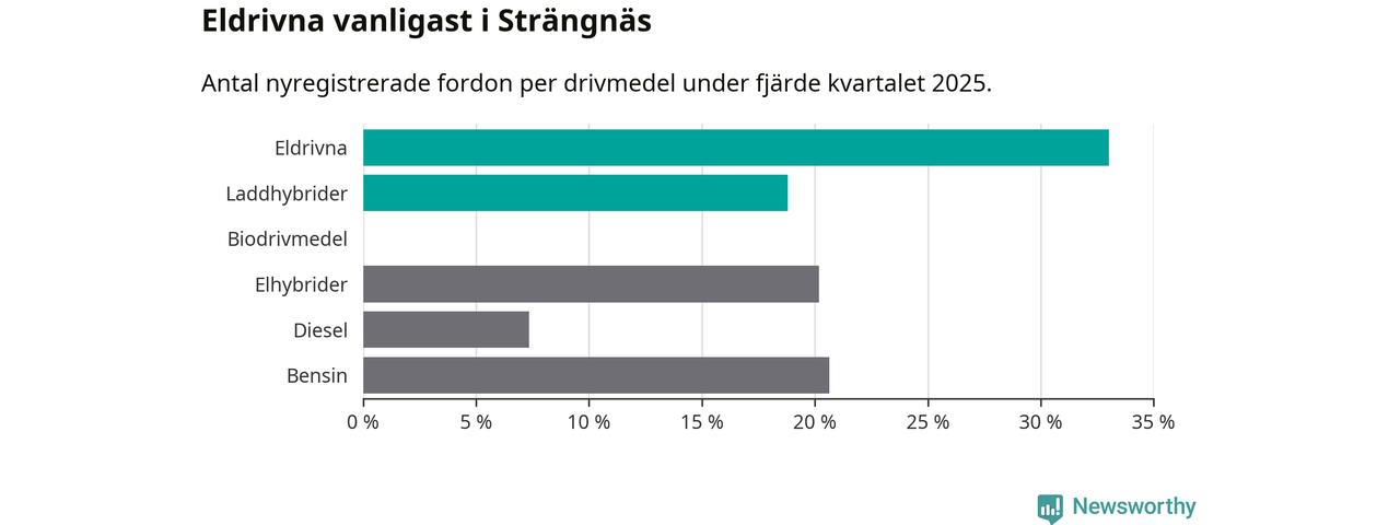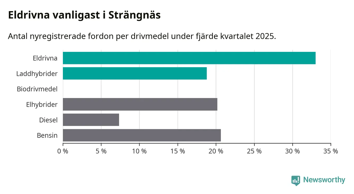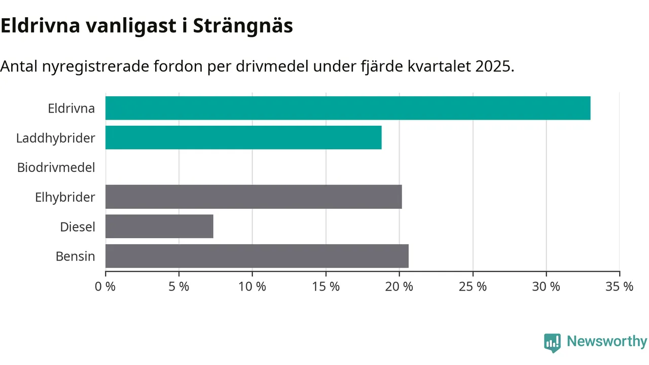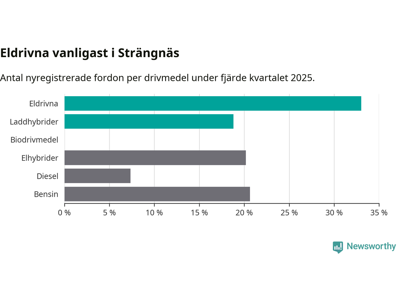 Under fjärde kvartalet 2025 var 52 procent av alla nyregistrerade personbilar i Strängnäs laddbara (sammanlagt registrerades 218 nya bilar). Merparten av de laddbara bilarna var rena elbilar (33 procent av alla).