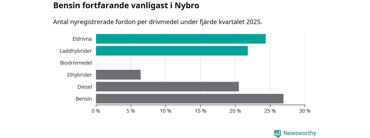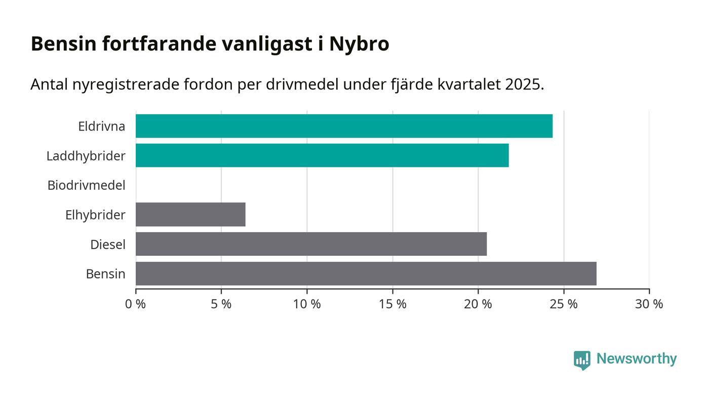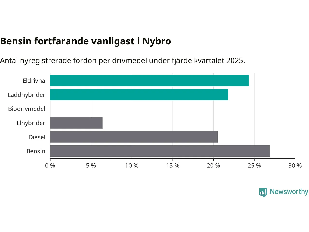 Under fjärde kvartalet 2025 var 46 procent av alla nyregistrerade personbilar i Nybro laddbara (sammanlagt registrerades 78 nya bilar). Merparten av de laddbara bilarna var rena elbilar (24 procent av alla).