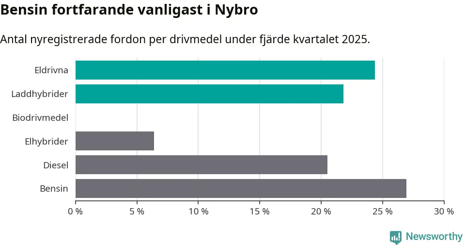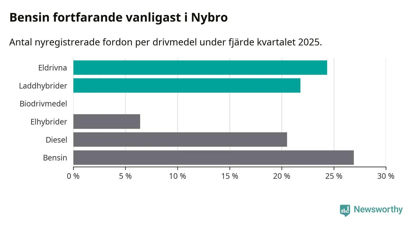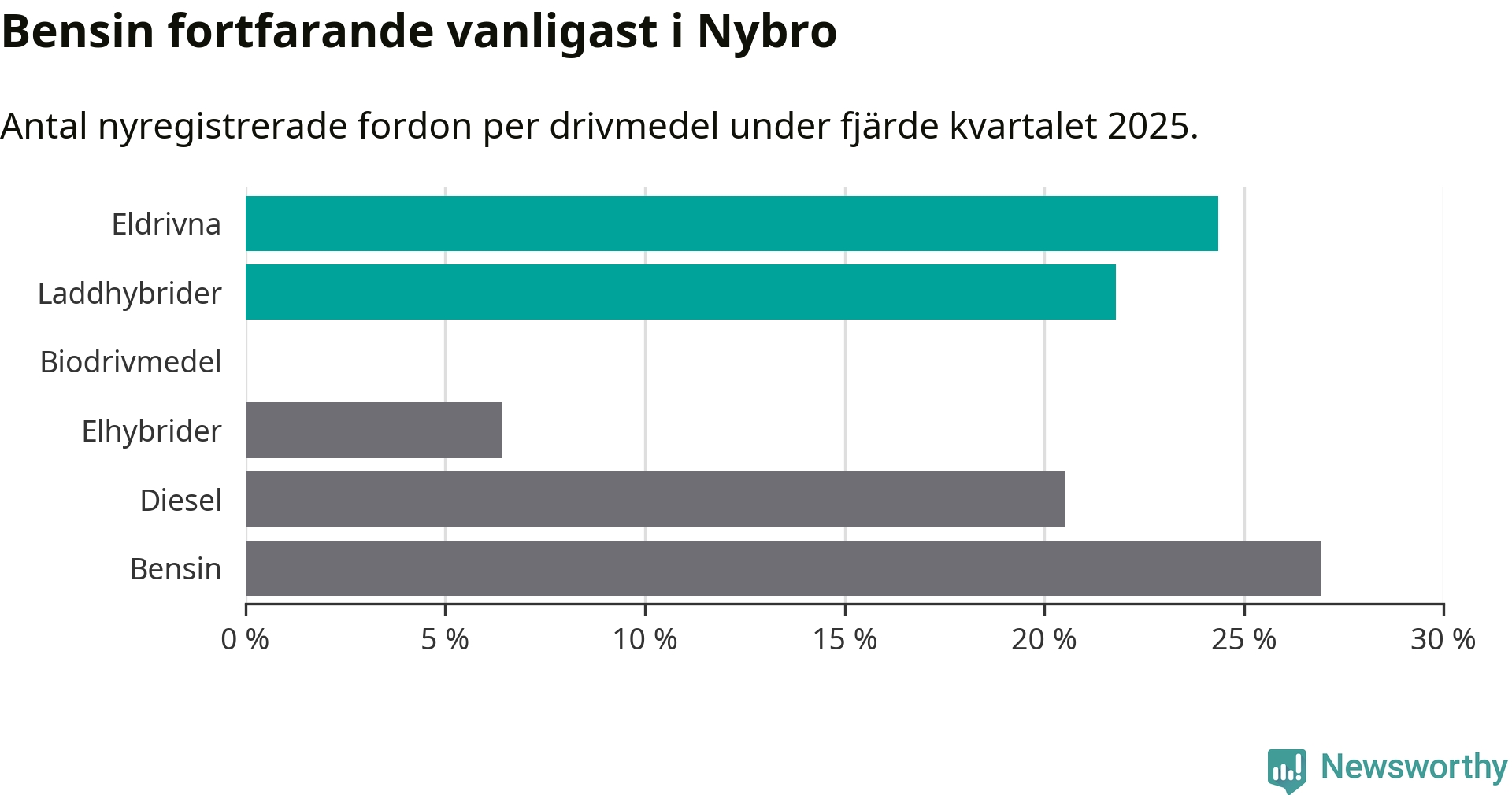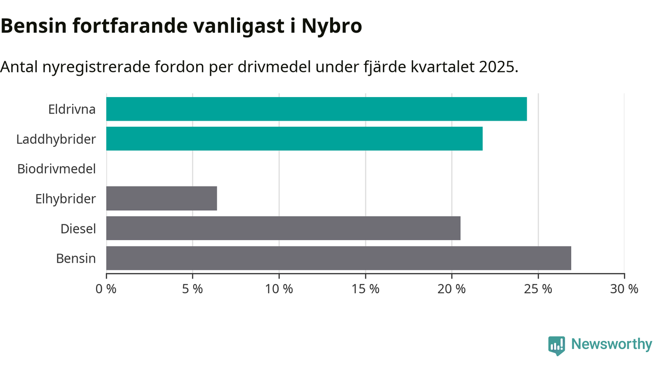Under fjärde kvartalet 2025 var 46 procent av alla nyregistrerade personbilar i Nybro laddbara (sammanlagt registrerades 78 nya bilar). Merparten av de laddbara bilarna var rena elbilar (24 procent av alla).