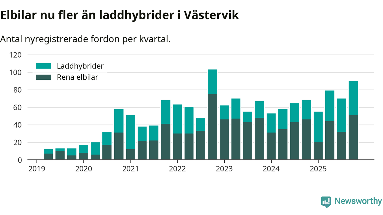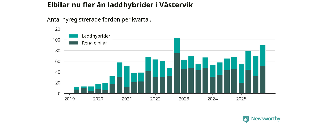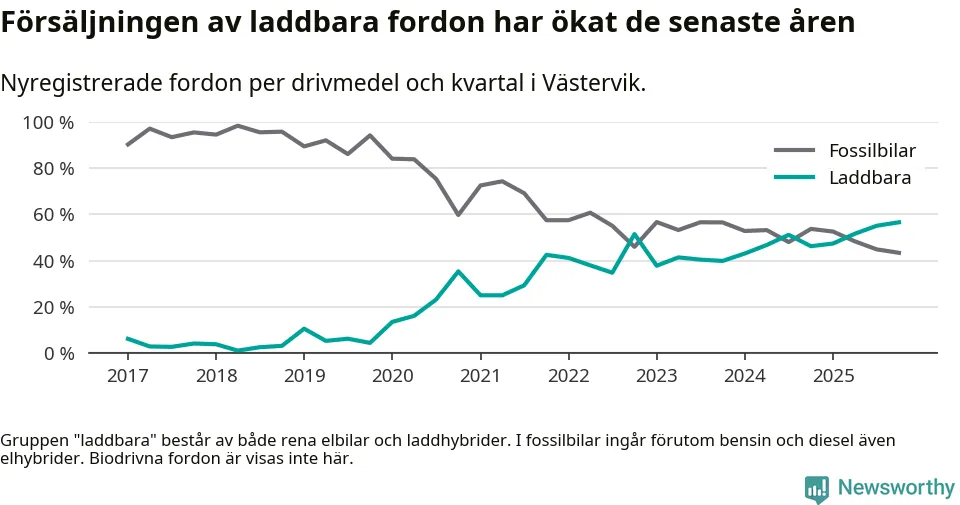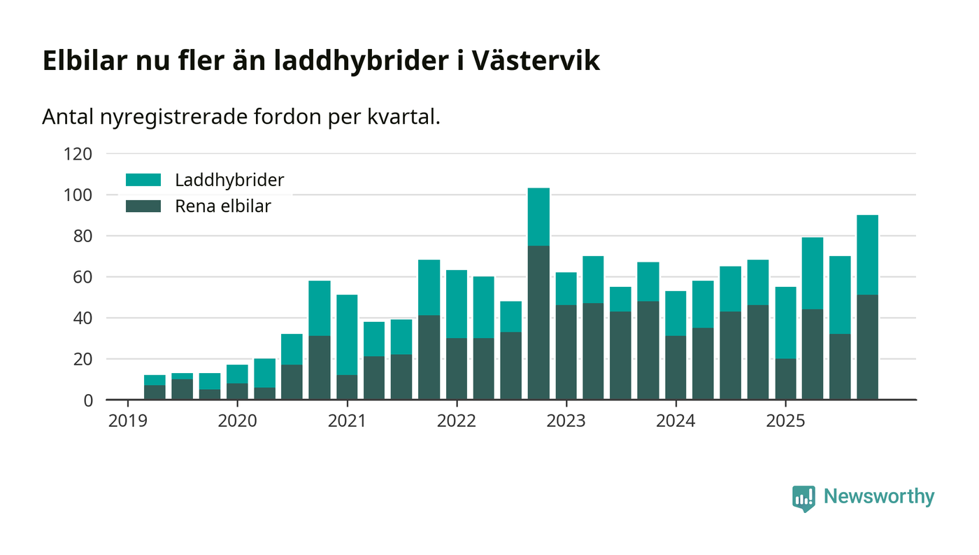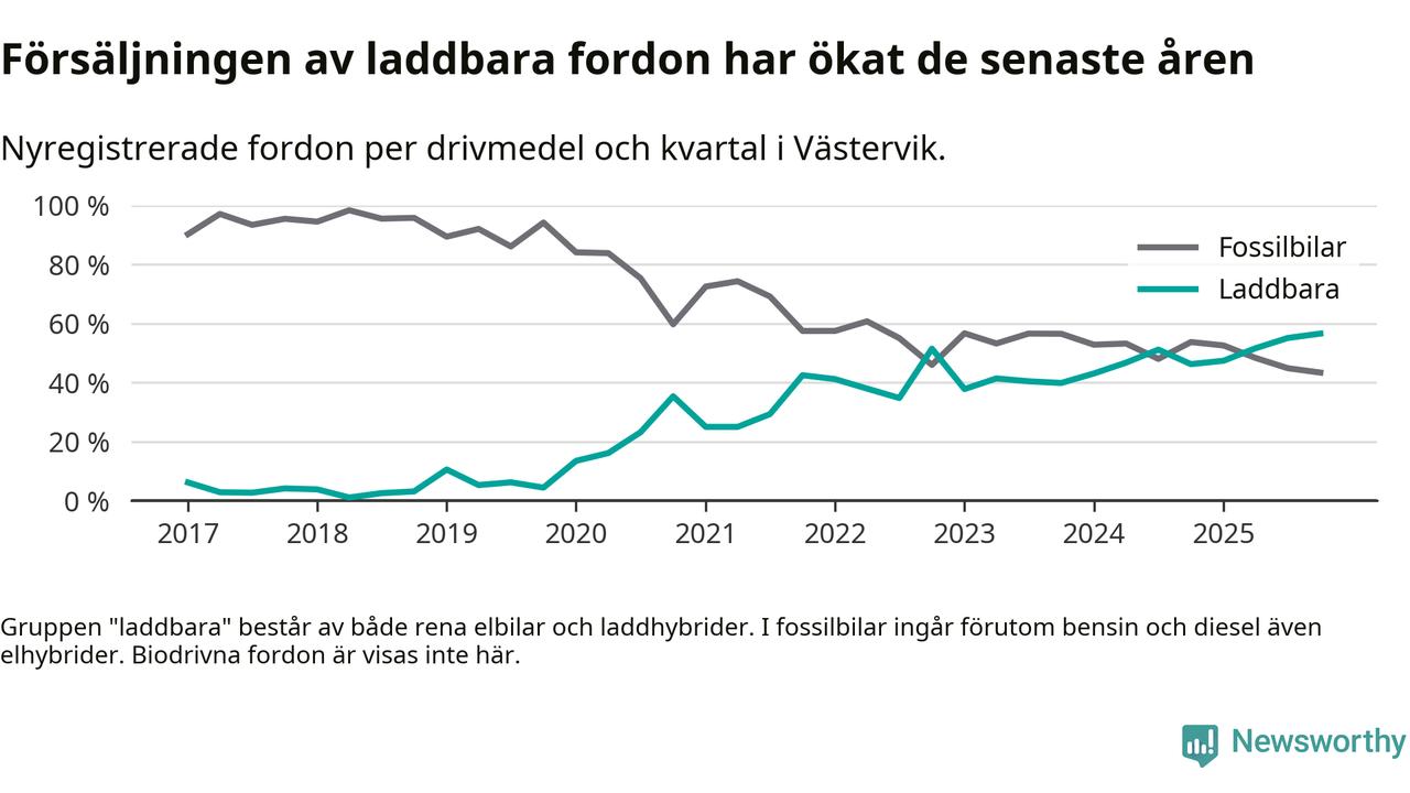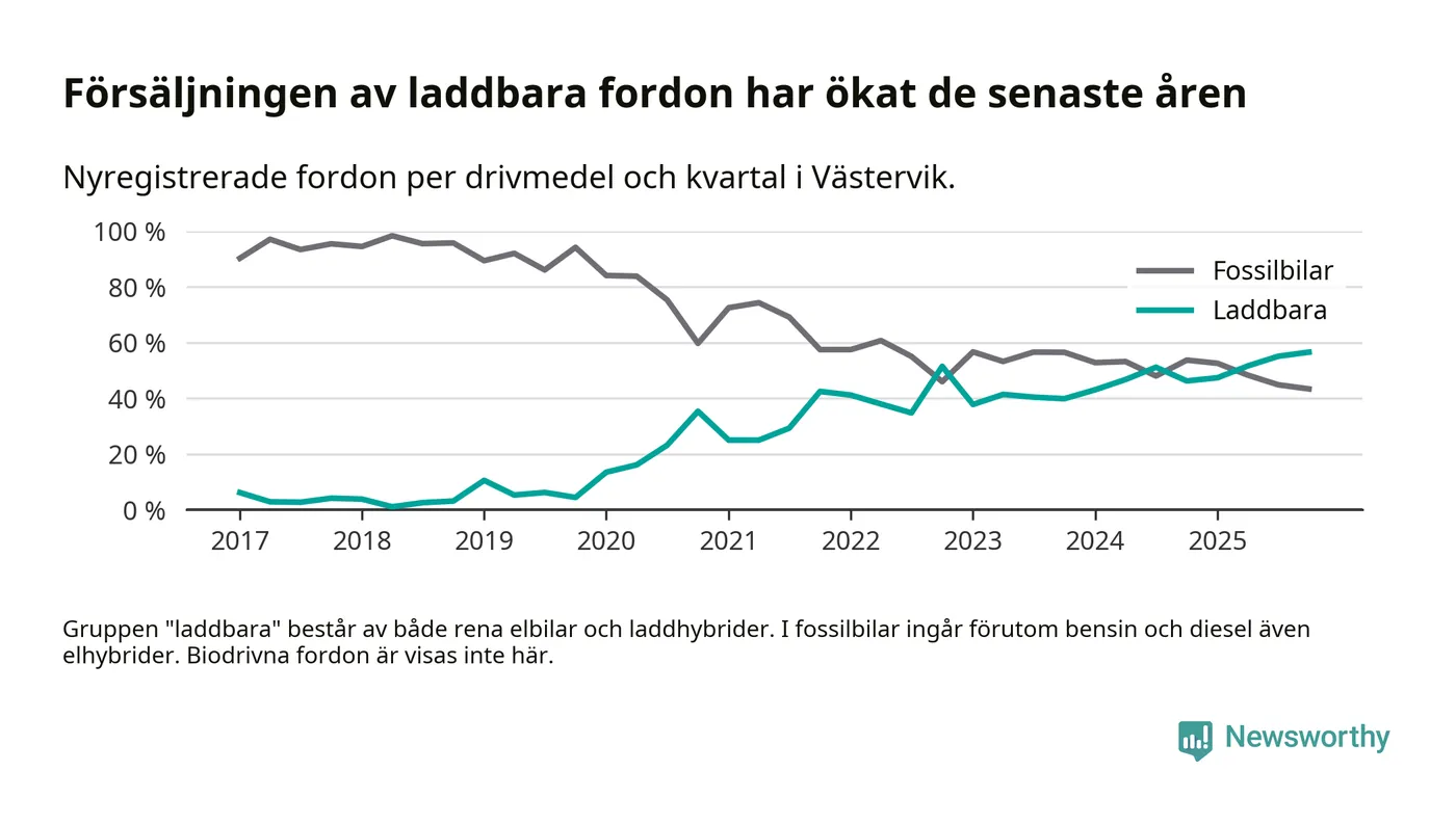 Under fjärde kvartalet 2025 var 57 procent av alla nyregistrerade personbilar i Västervik laddbara (sammanlagt registrerades 159 nya bilar). Merparten av de laddbara bilarna var rena elbilar (32 procent av alla).