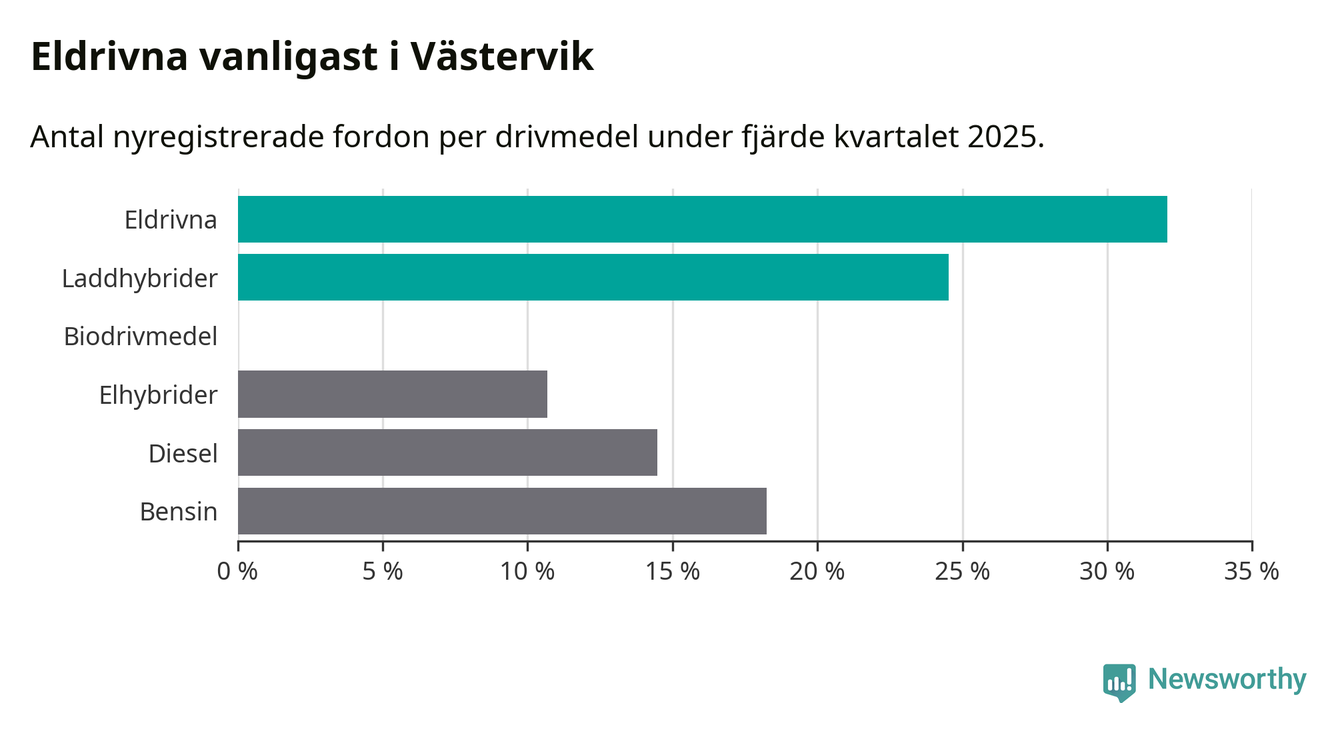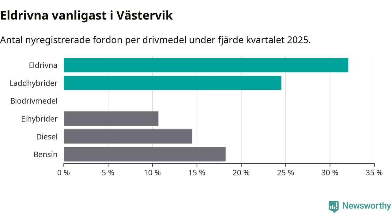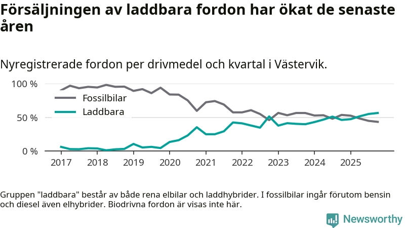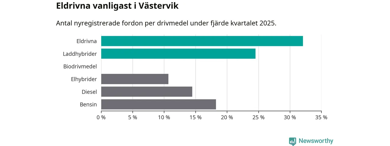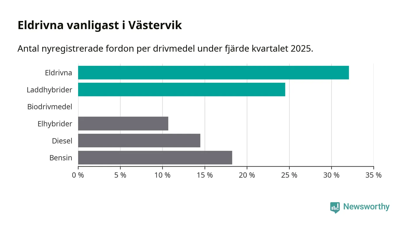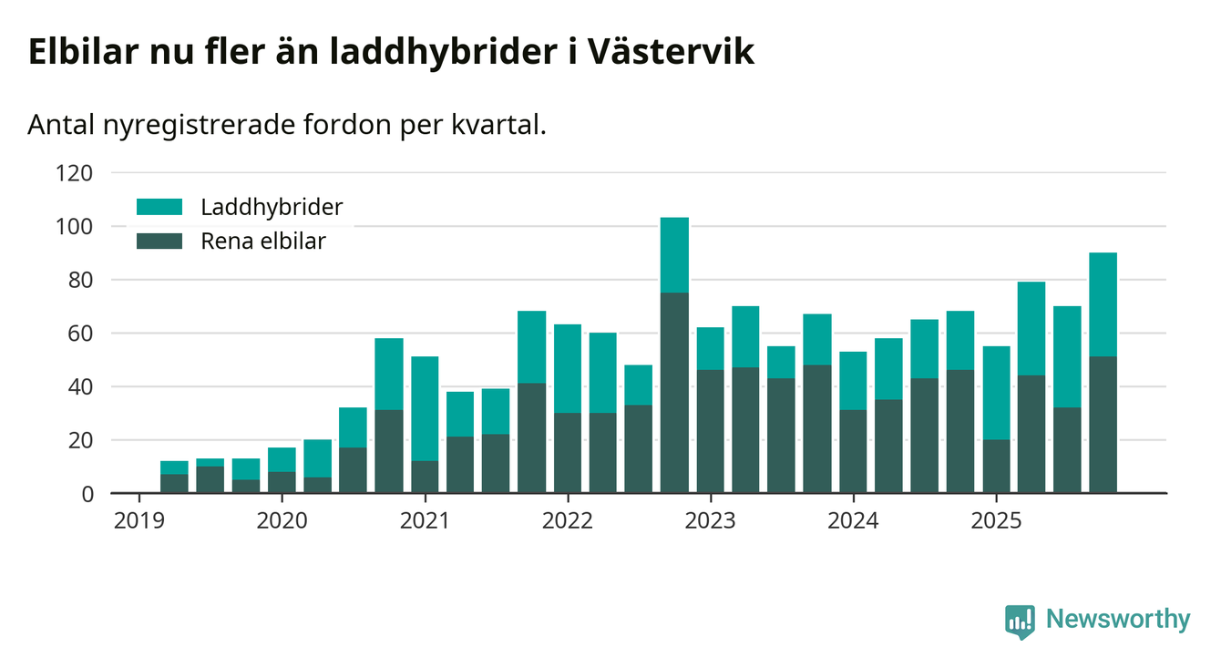 Under fjärde kvartalet 2025 var 57 procent av alla nyregistrerade personbilar i Västervik laddbara (sammanlagt registrerades 159 nya bilar). Merparten av de laddbara bilarna var rena elbilar (32 procent av alla).
