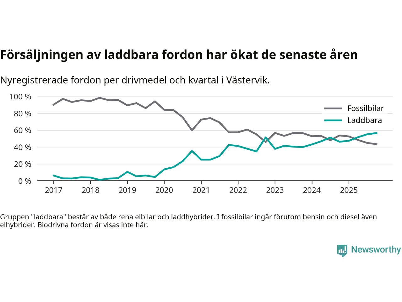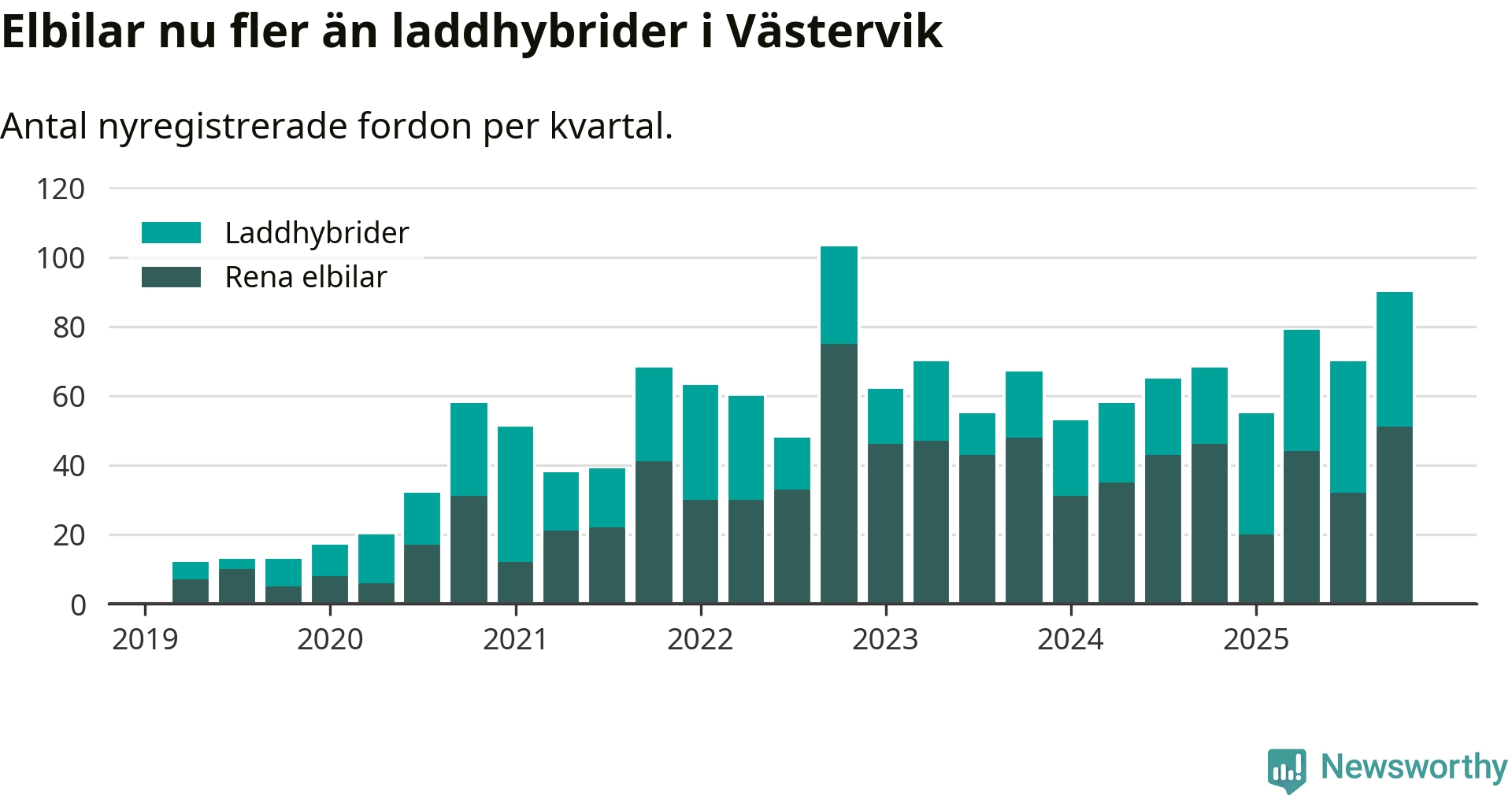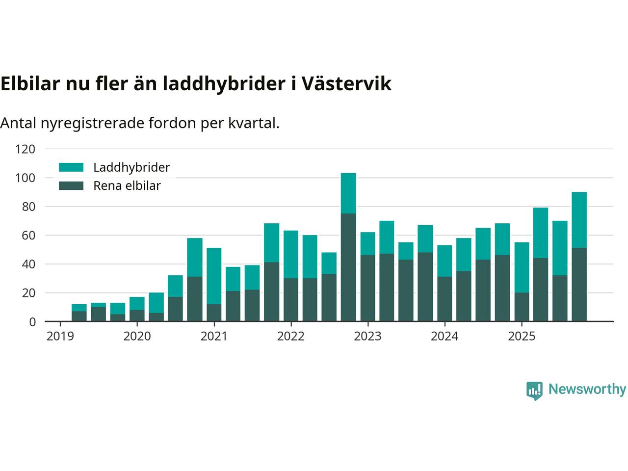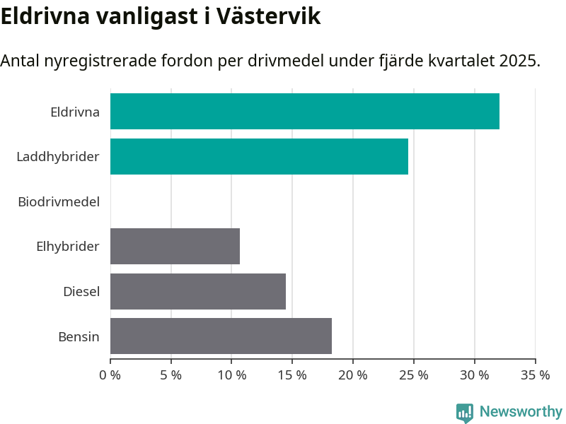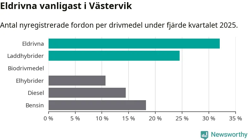 Under fjärde kvartalet 2025 var 57 procent av alla nyregistrerade personbilar i Västervik laddbara (sammanlagt registrerades 159 nya bilar). Merparten av de laddbara bilarna var rena elbilar (32 procent av alla).