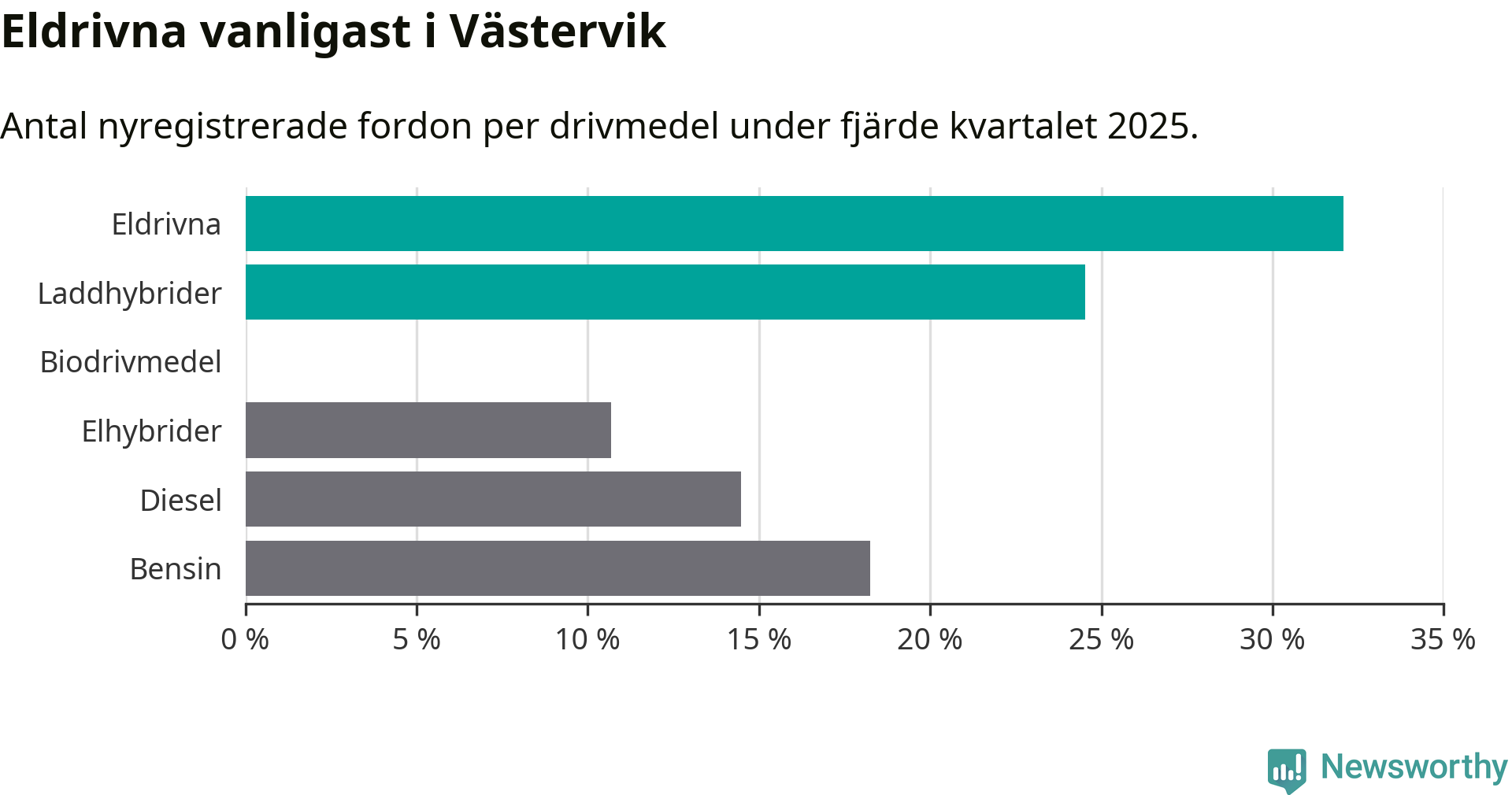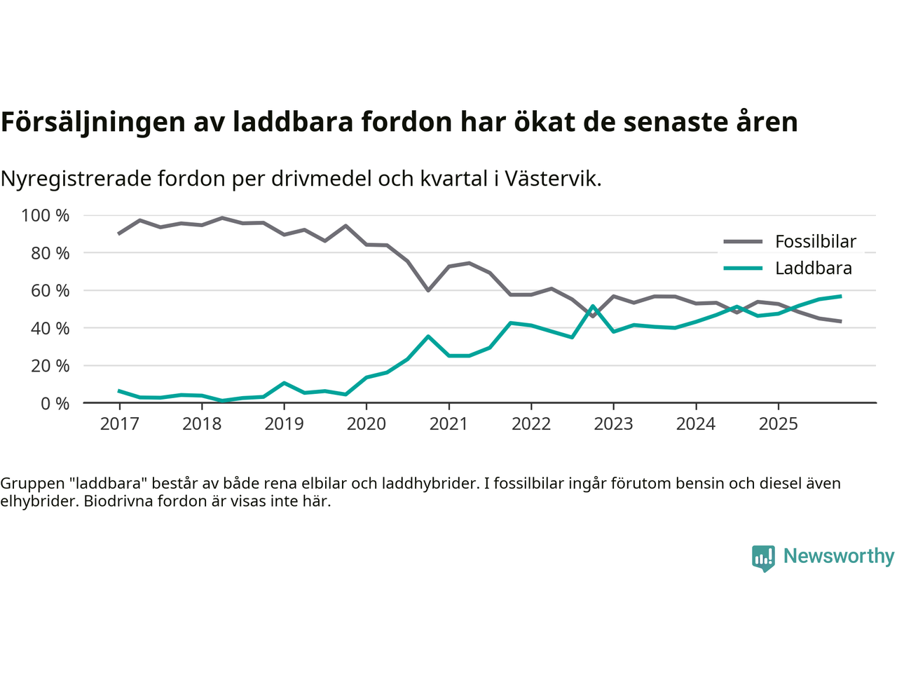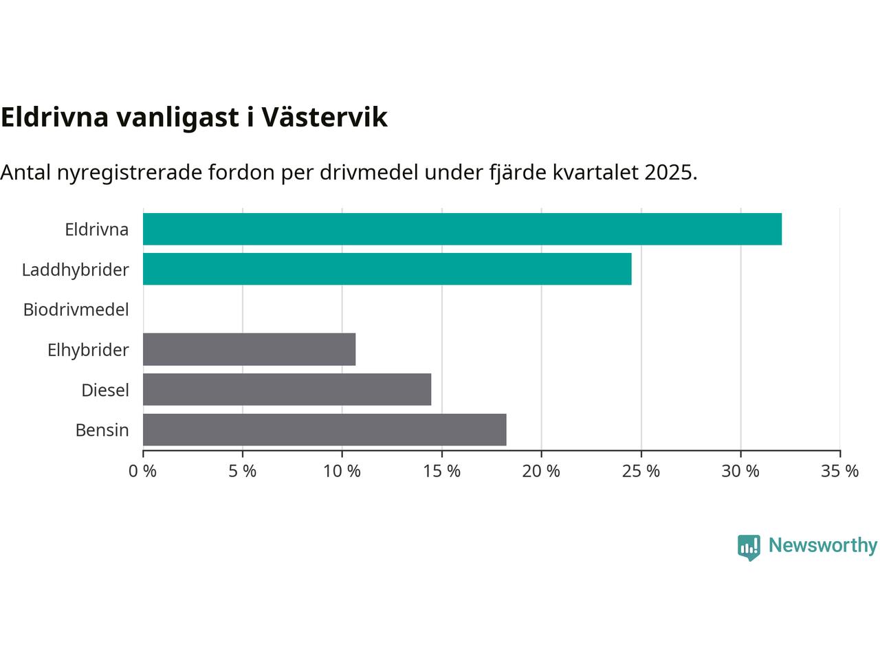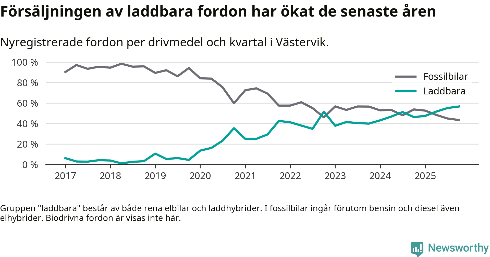 Under fjärde kvartalet 2025 var 57 procent av alla nyregistrerade personbilar i Västervik laddbara (sammanlagt registrerades 159 nya bilar). Merparten av de laddbara bilarna var rena elbilar (32 procent av alla).
