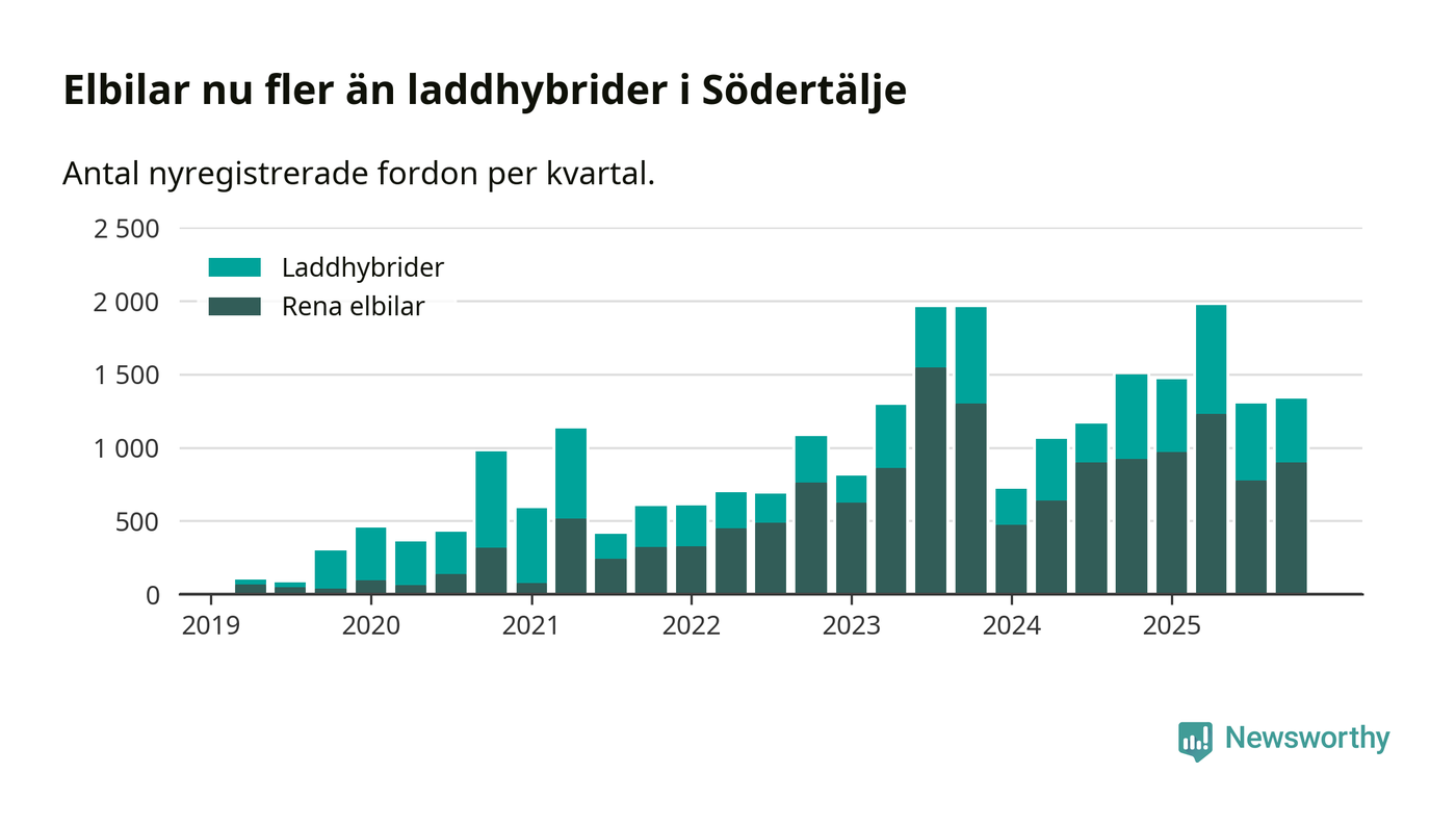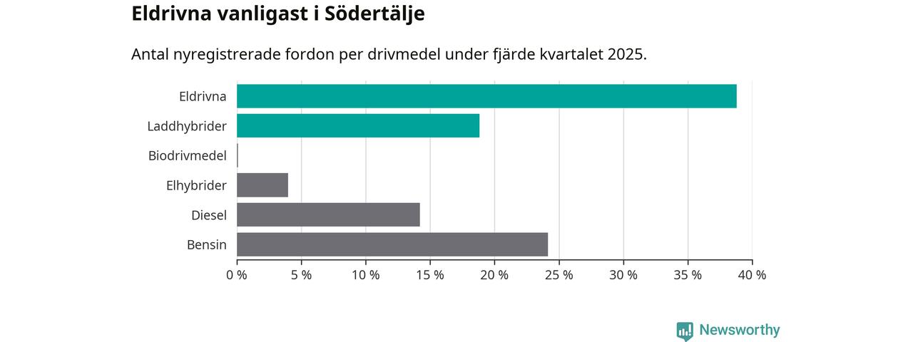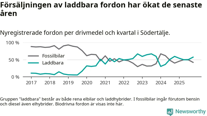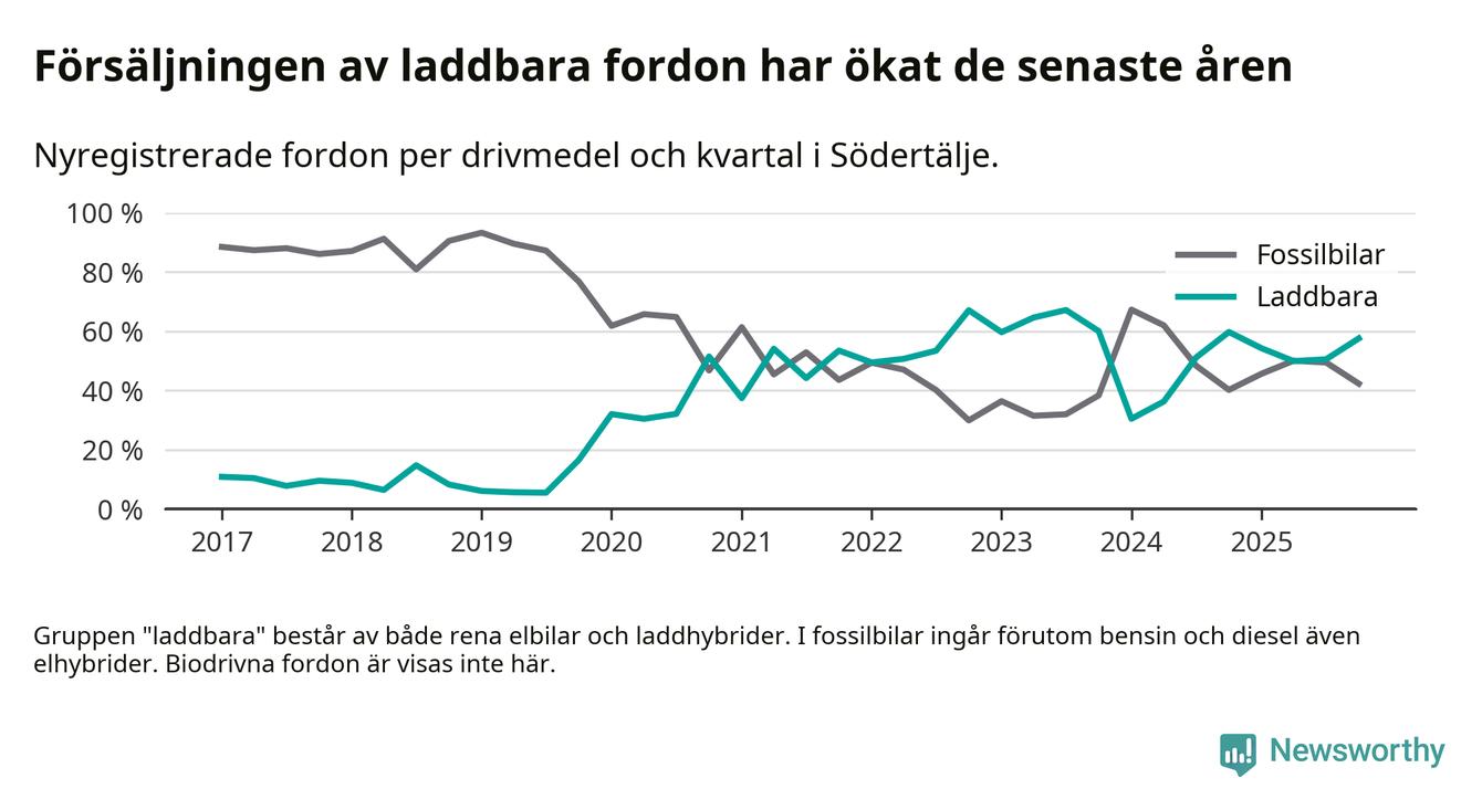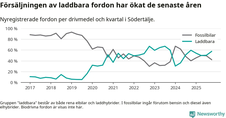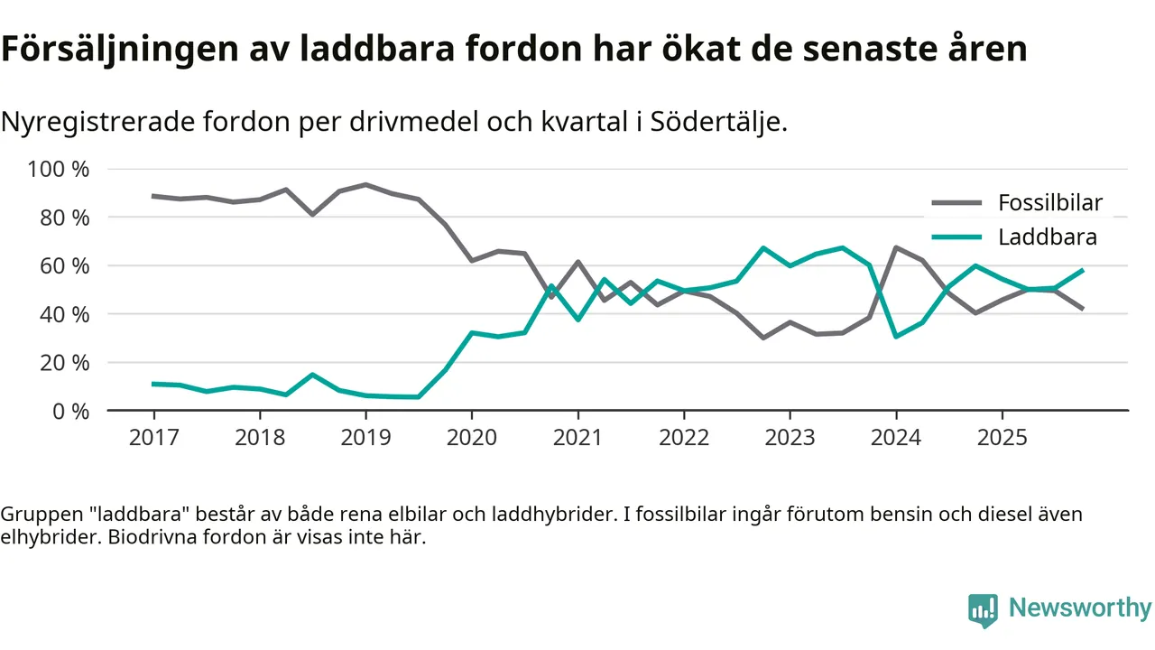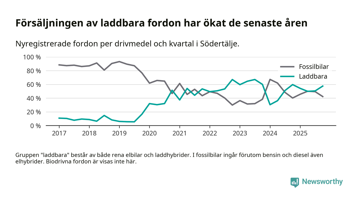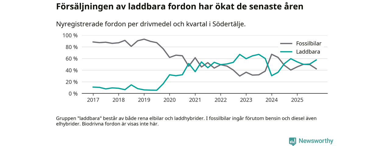Under fjärde kvartalet 2025 var 58 procent av alla nyregistrerade personbilar i Södertälje laddbara (sammanlagt registrerades 2 316 nya bilar). Merparten av de laddbara bilarna var rena elbilar (39 procent av alla).