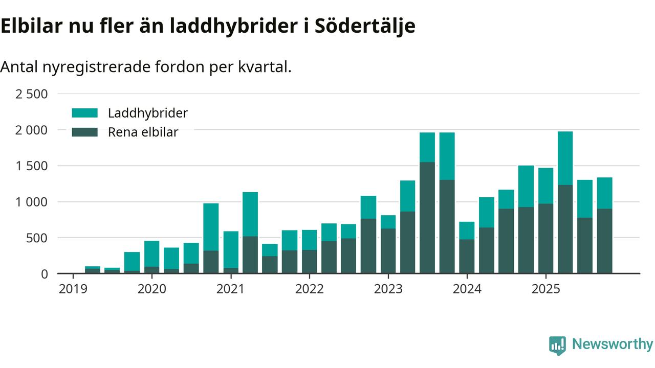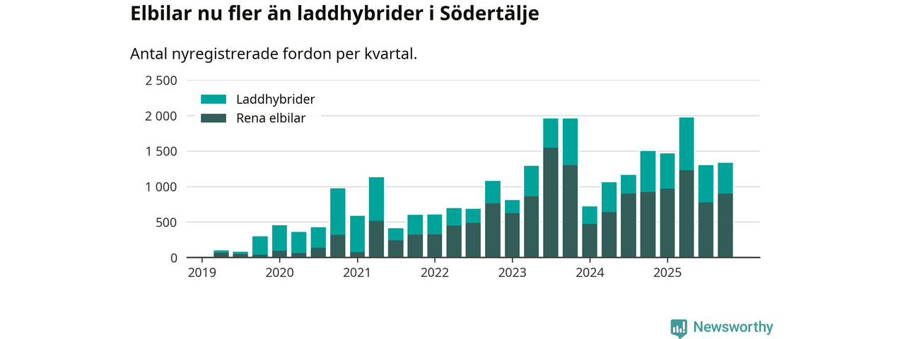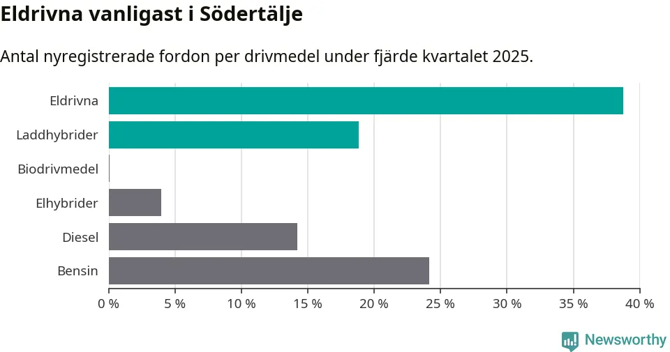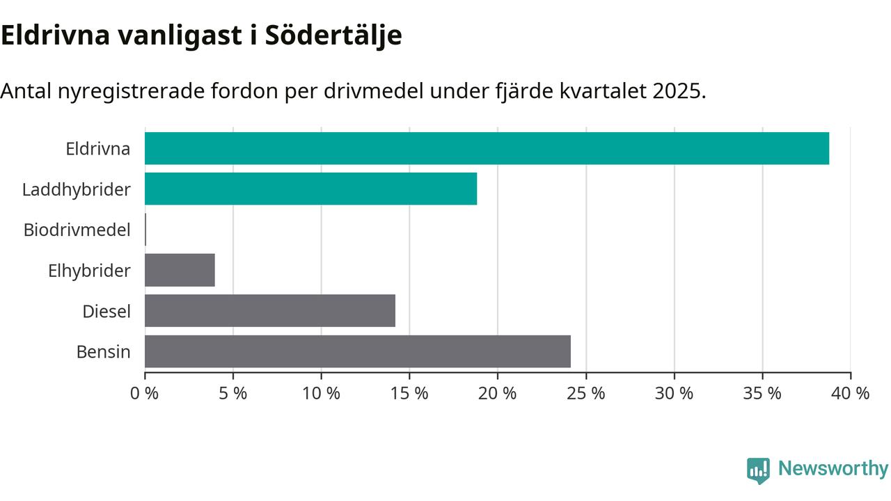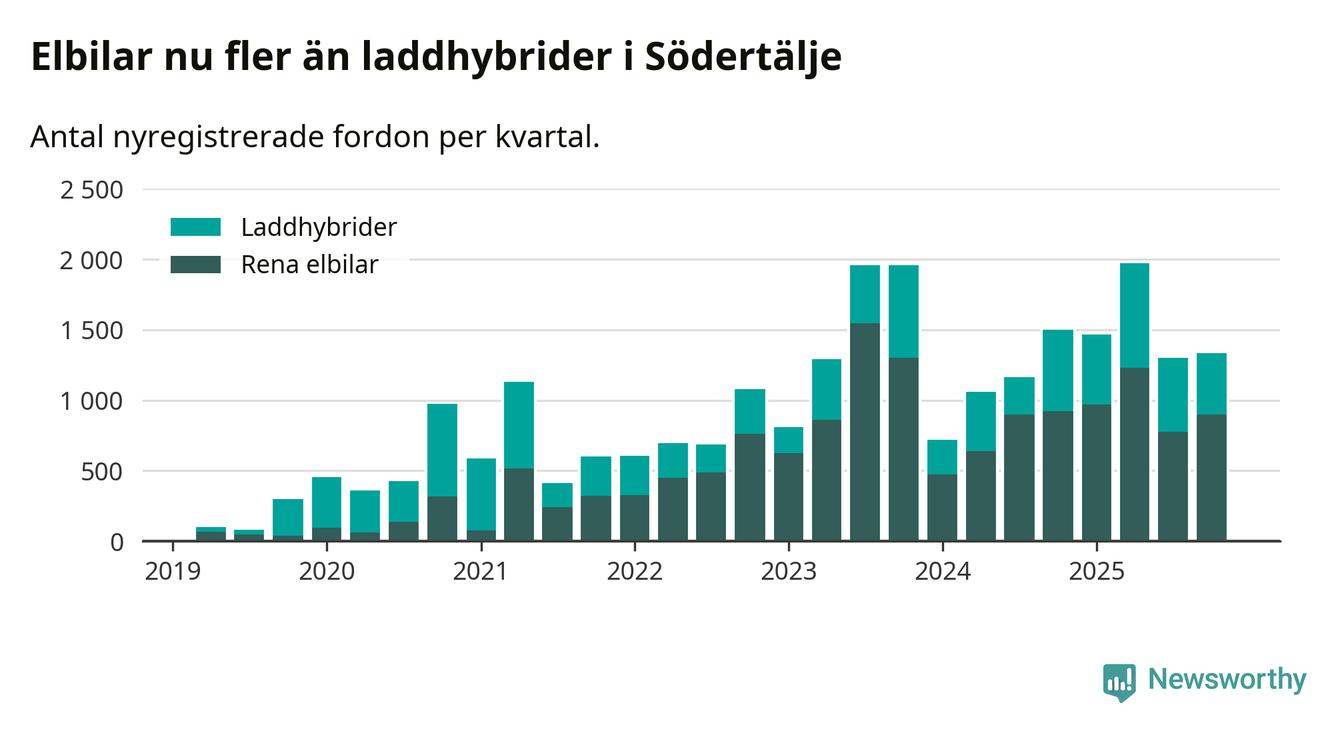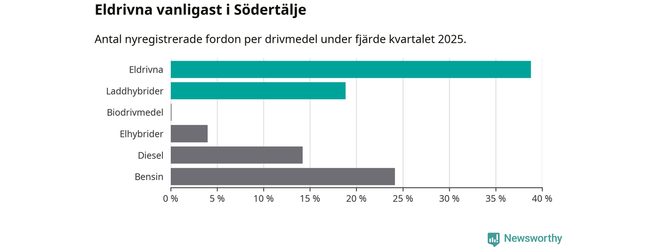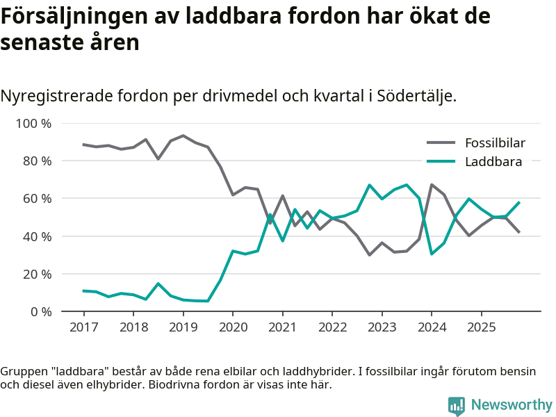 Under fjärde kvartalet 2025 var 58 procent av alla nyregistrerade personbilar i Södertälje laddbara (sammanlagt registrerades 2 316 nya bilar). Merparten av de laddbara bilarna var rena elbilar (39 procent av alla).