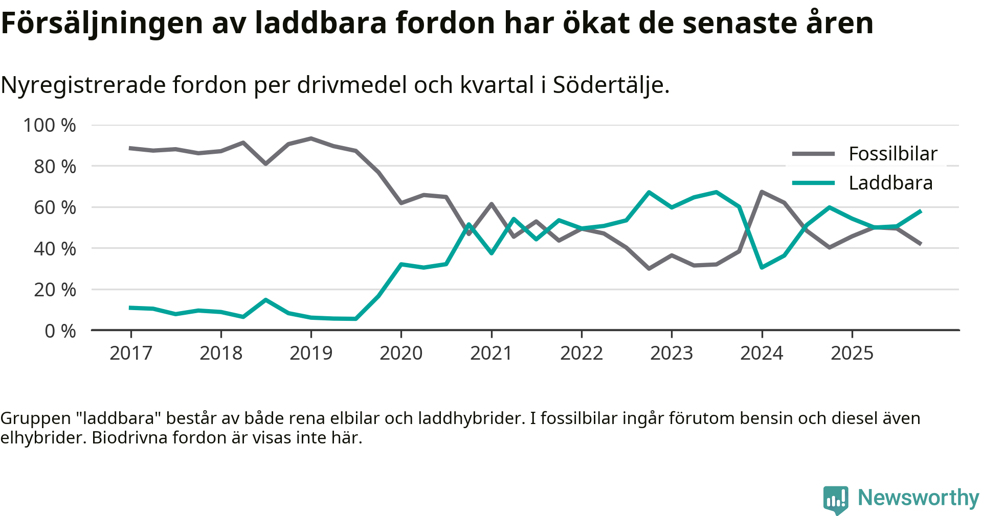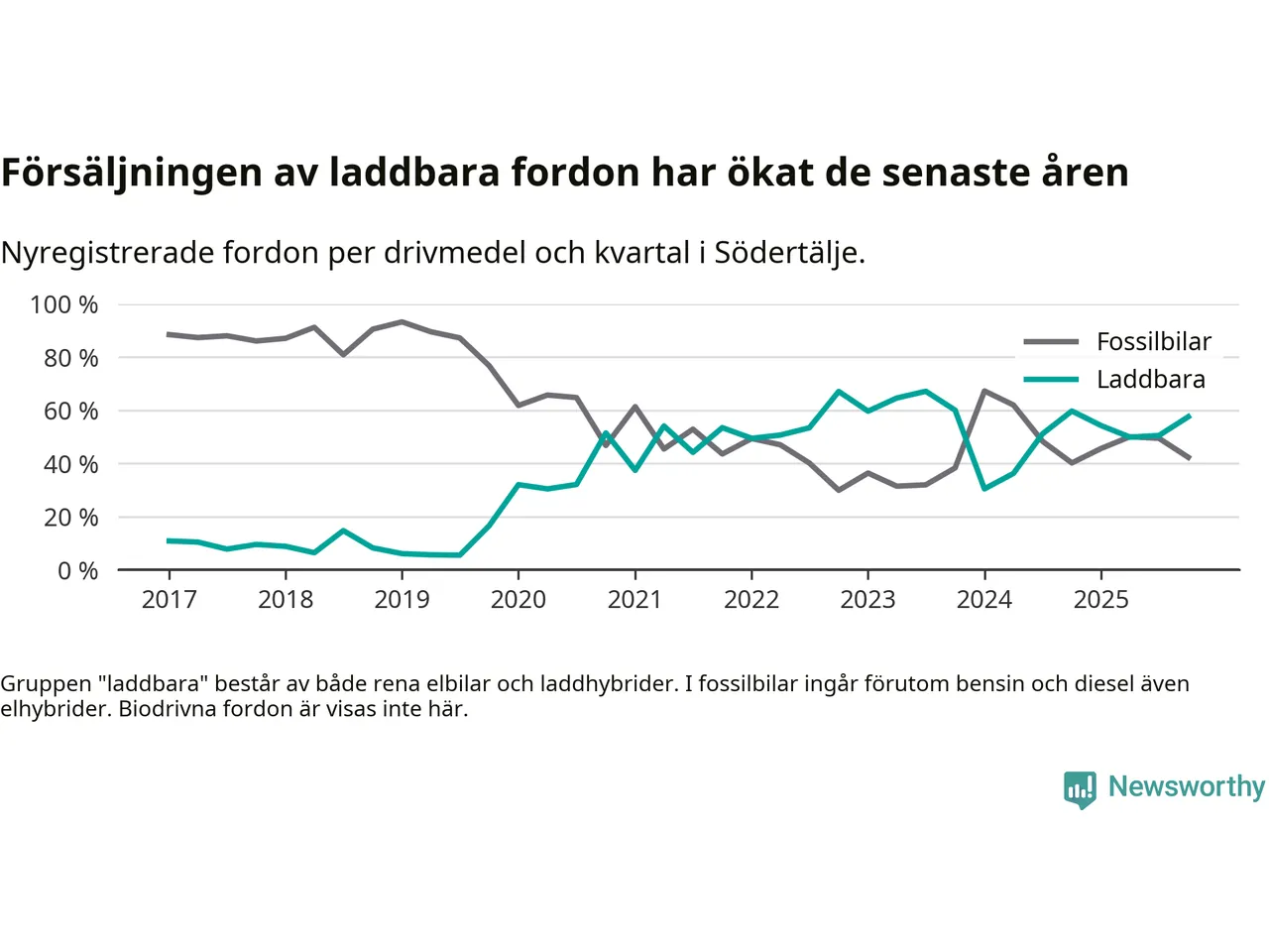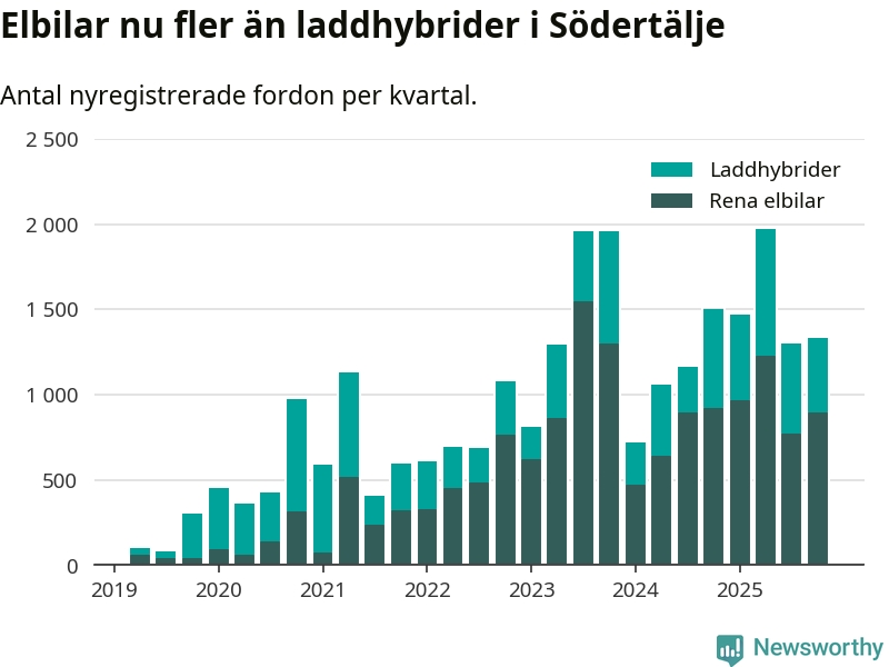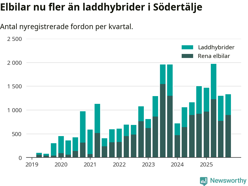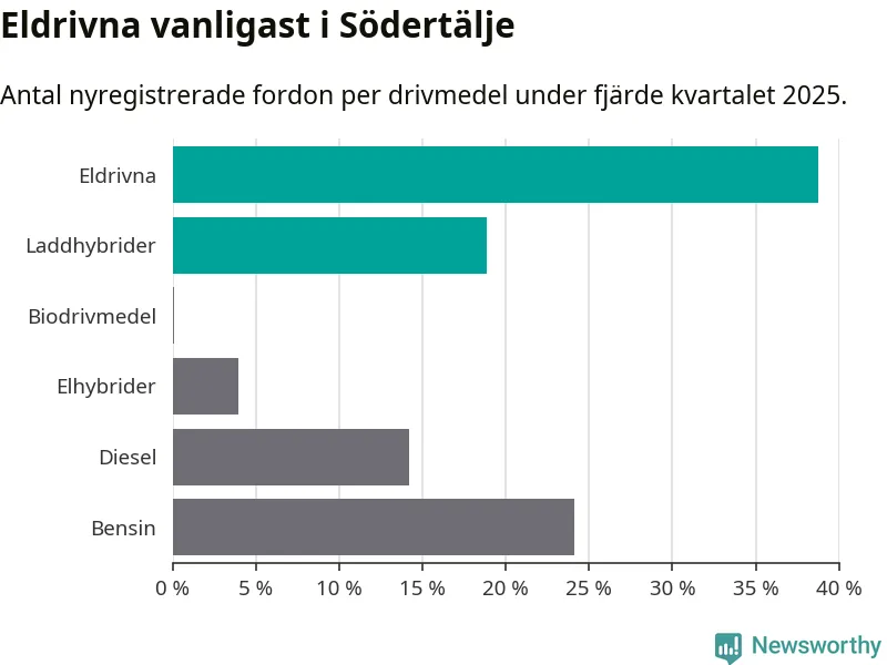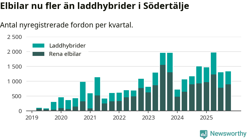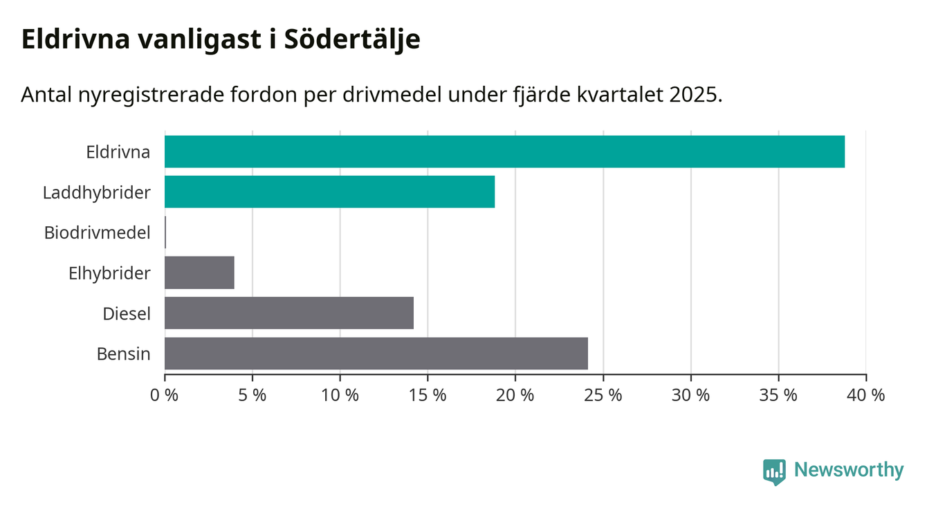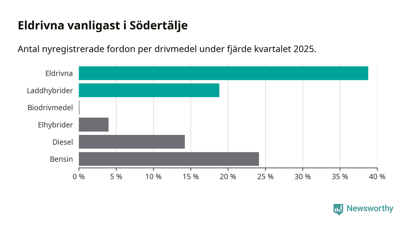 Under fjärde kvartalet 2025 var 58 procent av alla nyregistrerade personbilar i Södertälje laddbara (sammanlagt registrerades 2 316 nya bilar). Merparten av de laddbara bilarna var rena elbilar (39 procent av alla).