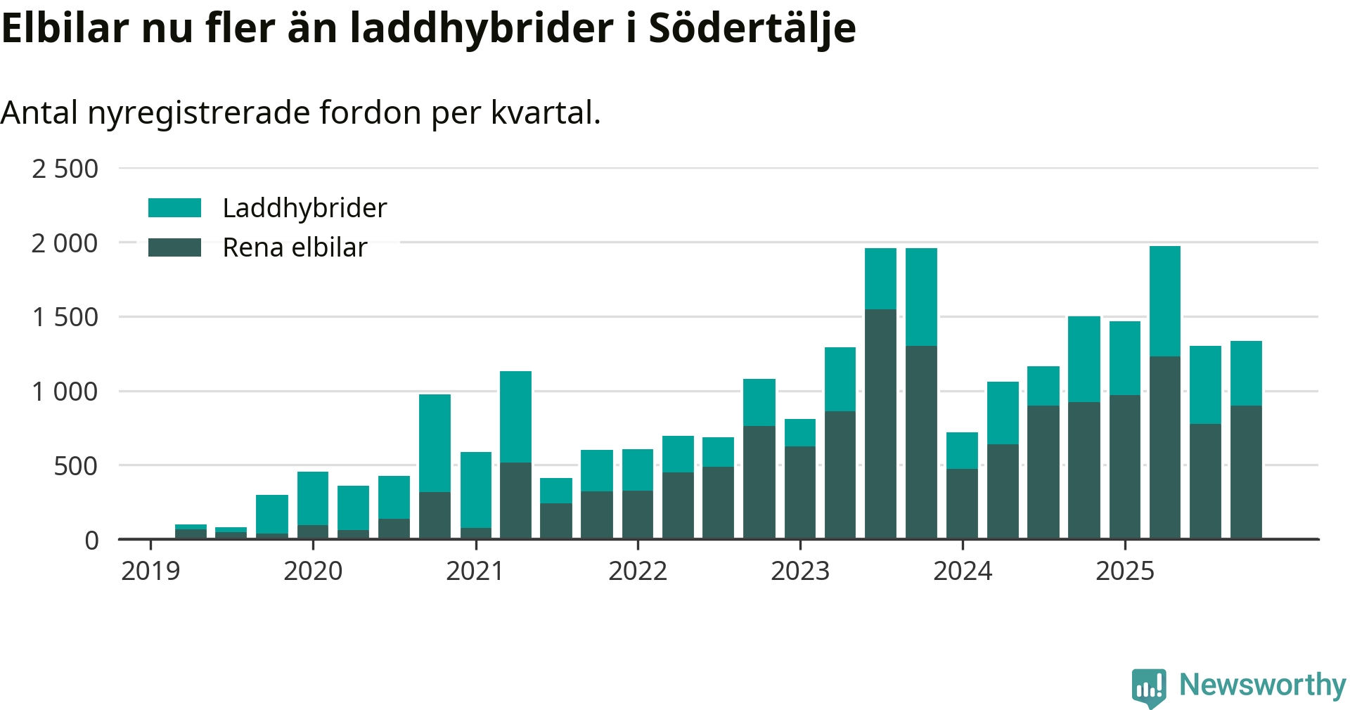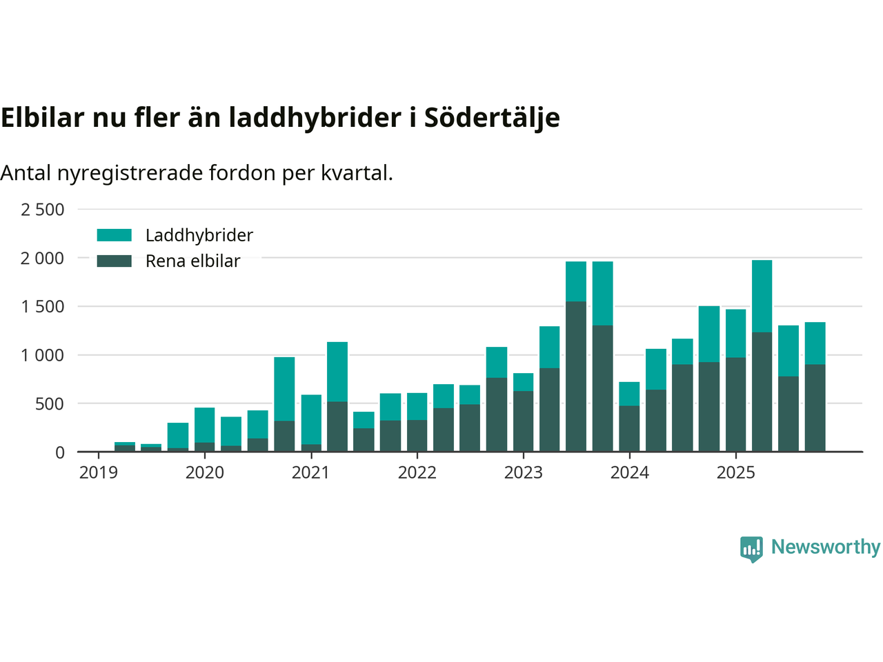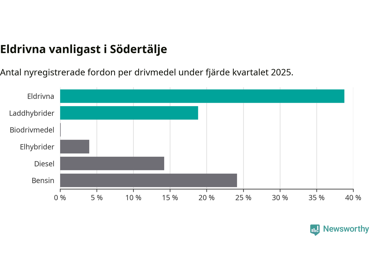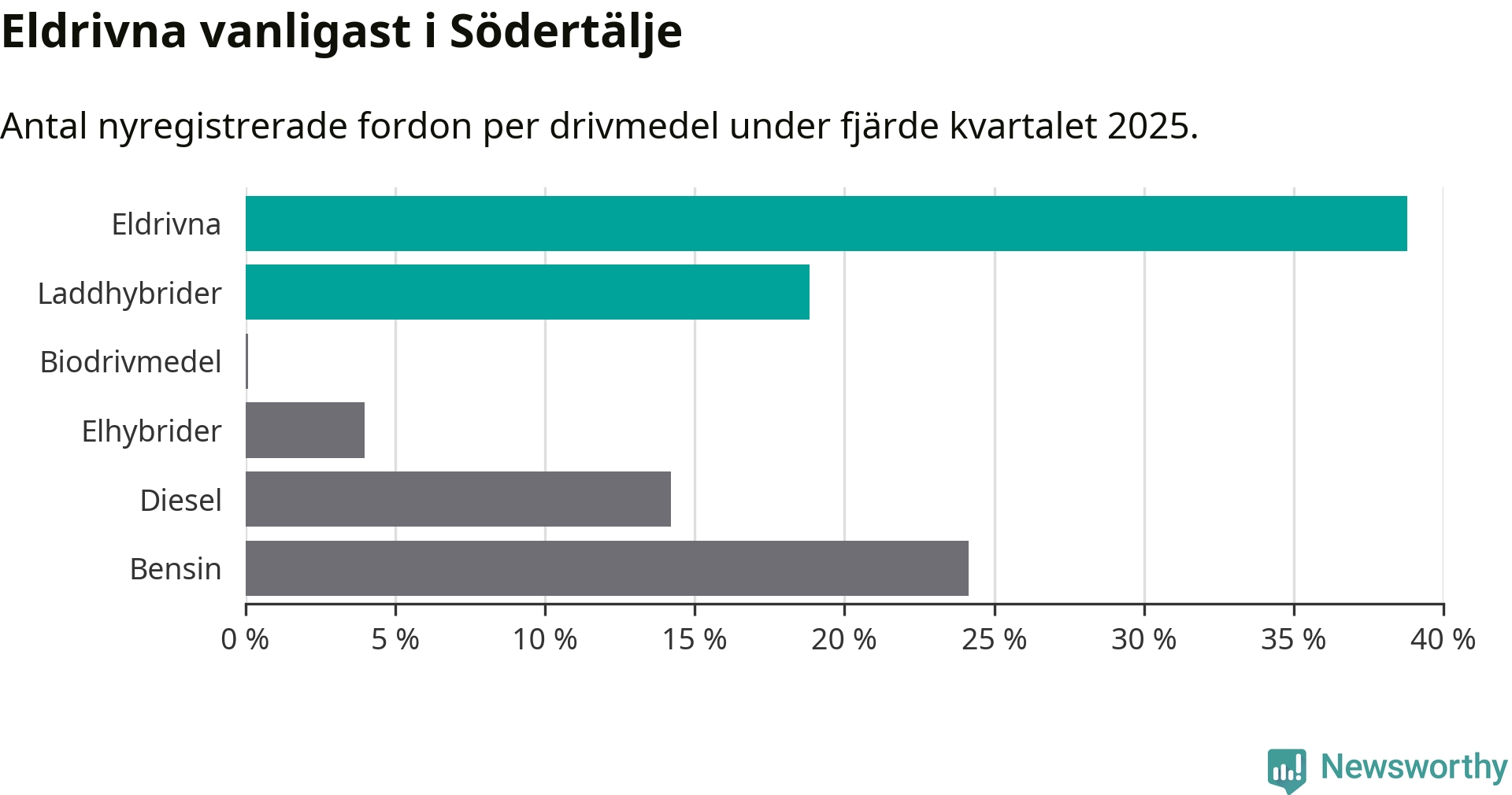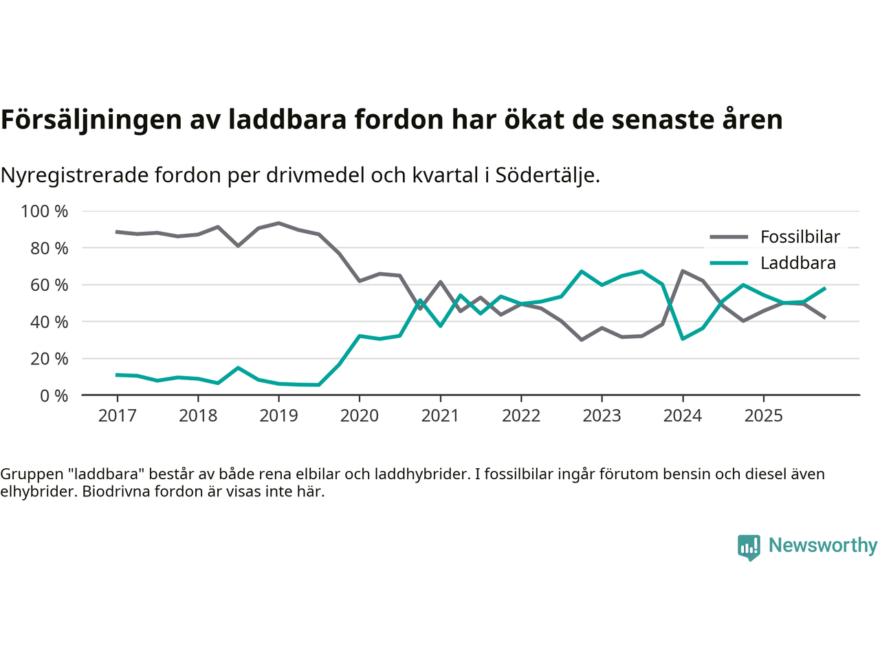 Under fjärde kvartalet 2025 var 58 procent av alla nyregistrerade personbilar i Södertälje laddbara (sammanlagt registrerades 2 316 nya bilar). Merparten av de laddbara bilarna var rena elbilar (39 procent av alla).