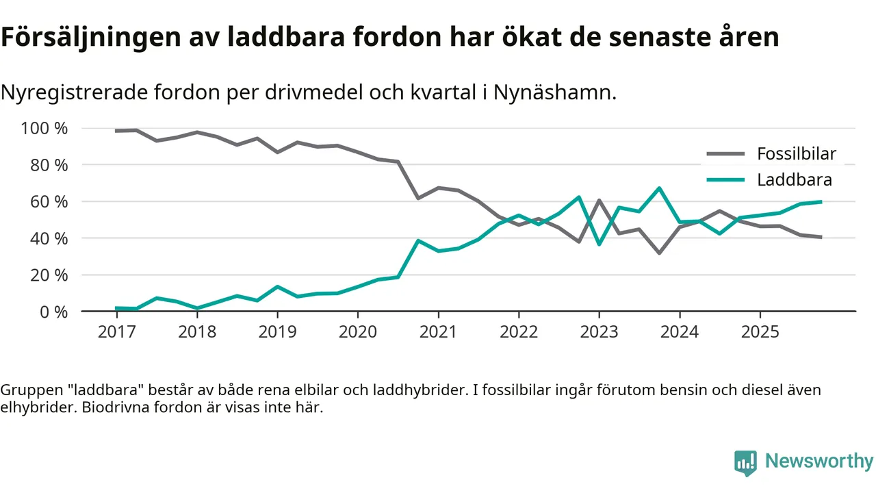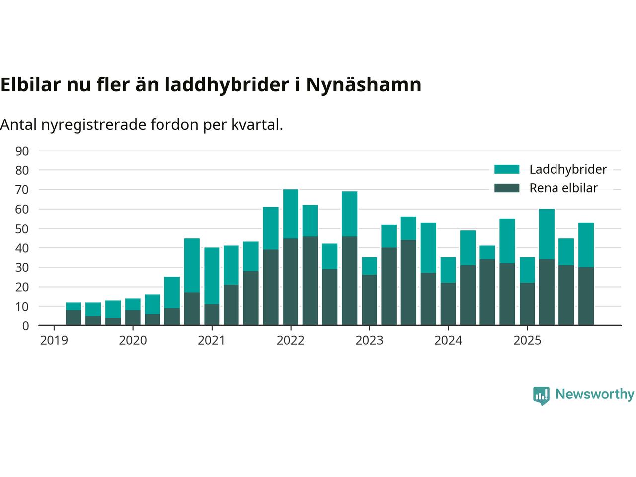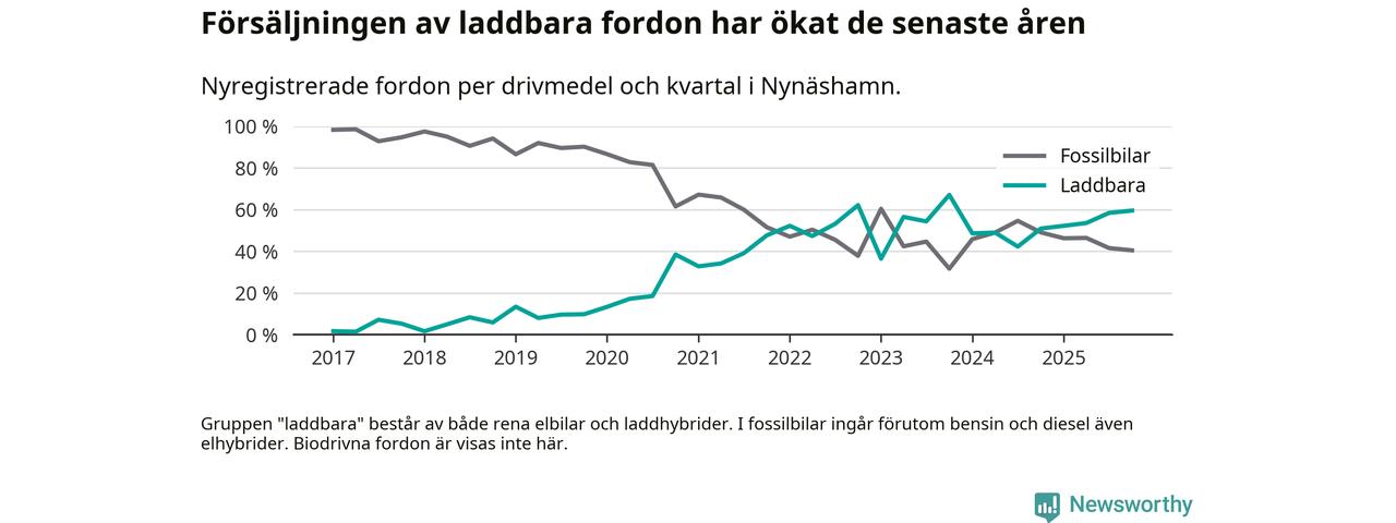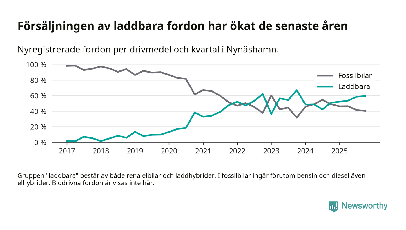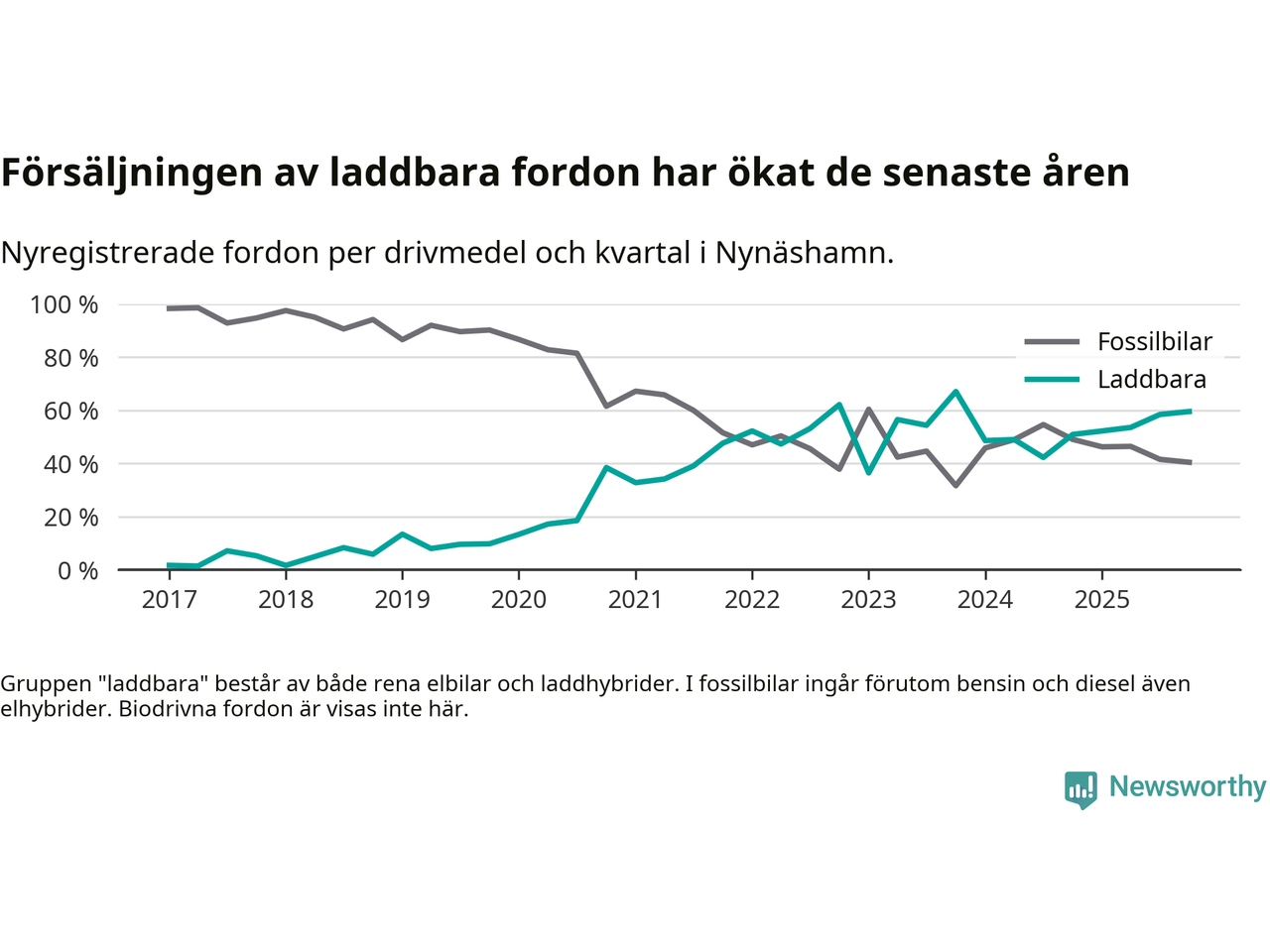 Under fjärde kvartalet 2025 var 60 procent av alla nyregistrerade personbilar i Nynäshamn laddbara (sammanlagt registrerades 89 nya bilar). Merparten av de laddbara bilarna var rena elbilar (34 procent av alla).