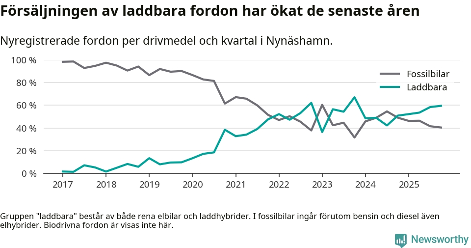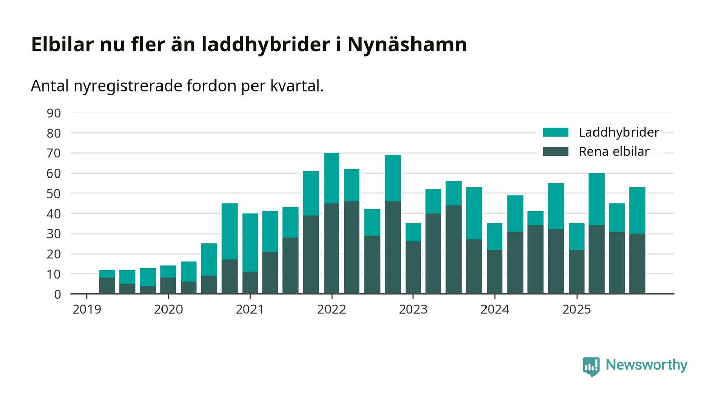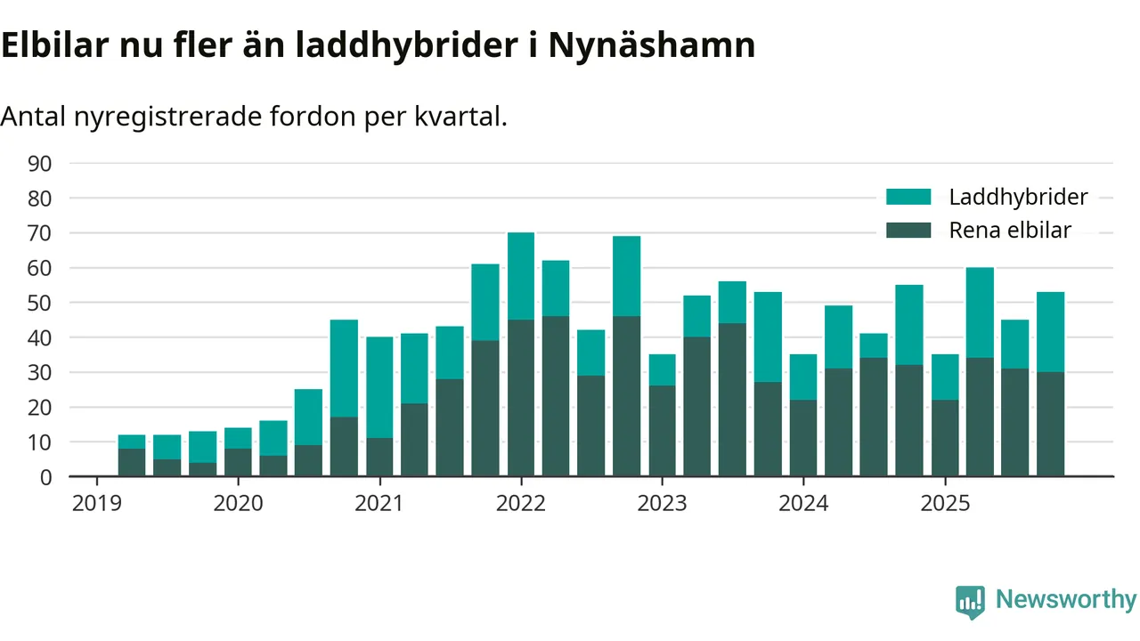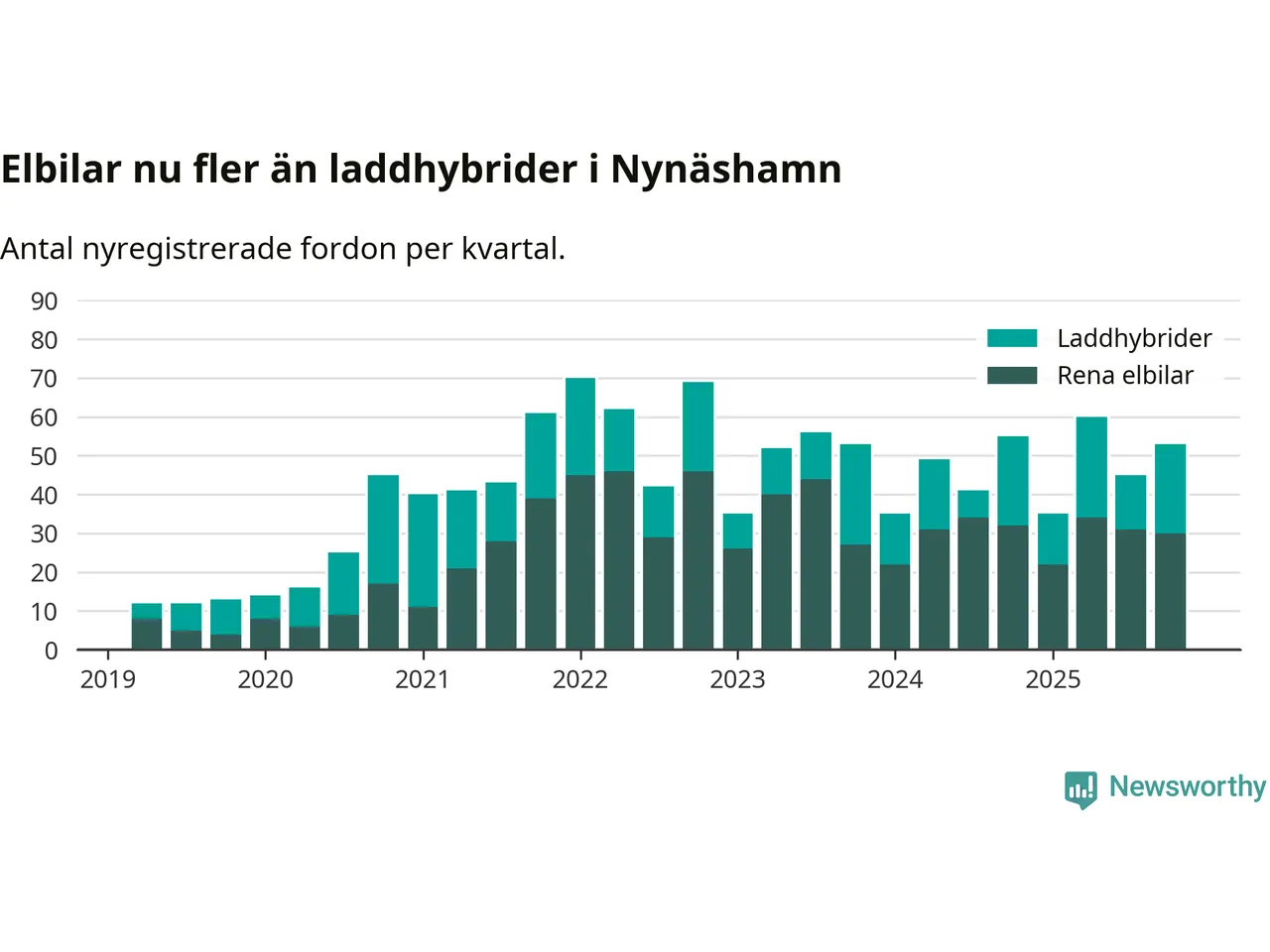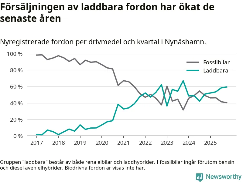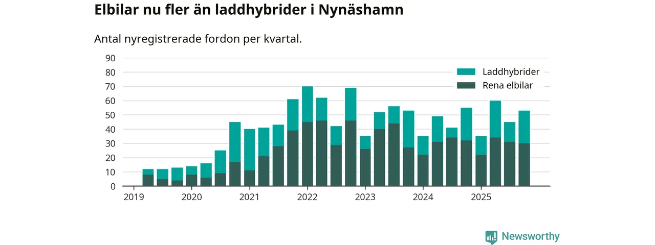 Under fjärde kvartalet 2025 var 60 procent av alla nyregistrerade personbilar i Nynäshamn laddbara (sammanlagt registrerades 89 nya bilar). Merparten av de laddbara bilarna var rena elbilar (34 procent av alla).
