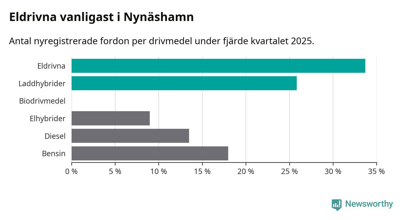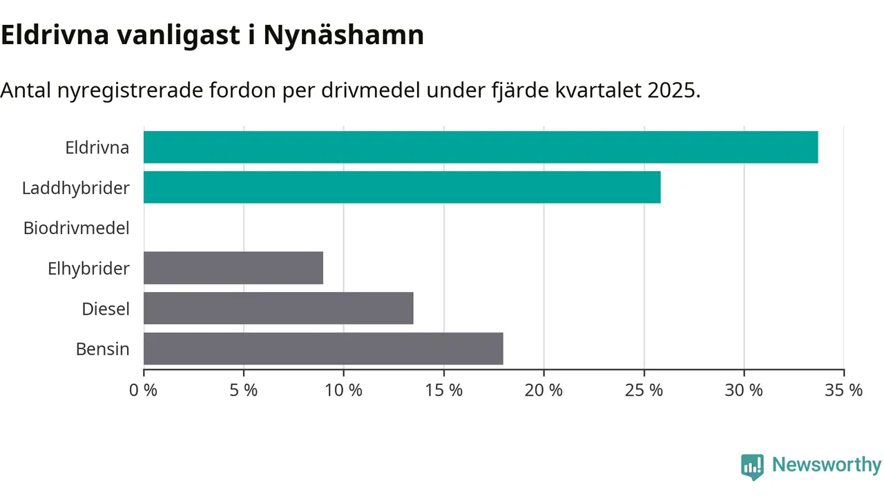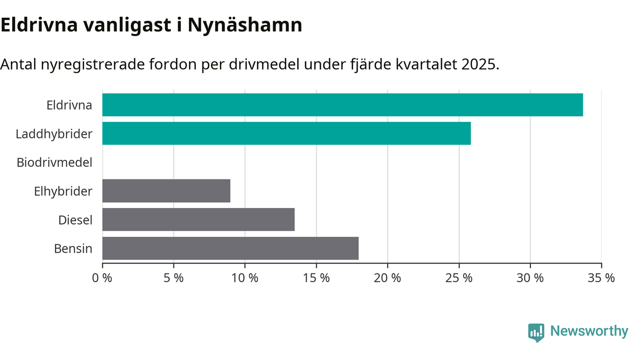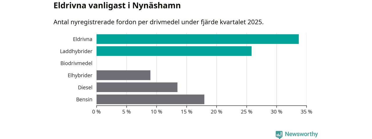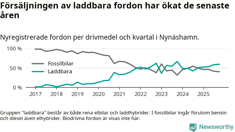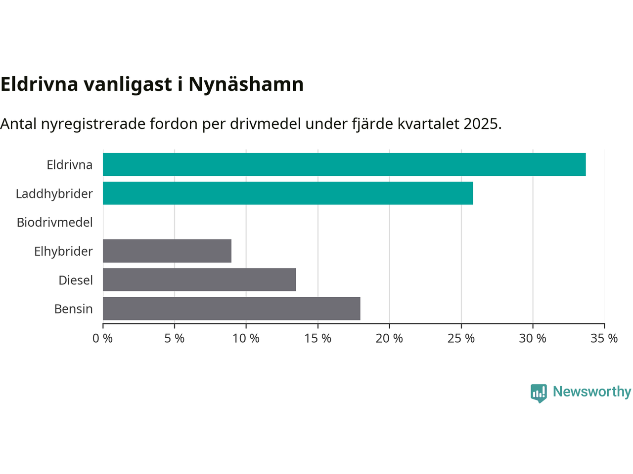 Under fjärde kvartalet 2025 var 60 procent av alla nyregistrerade personbilar i Nynäshamn laddbara (sammanlagt registrerades 89 nya bilar). Merparten av de laddbara bilarna var rena elbilar (34 procent av alla).