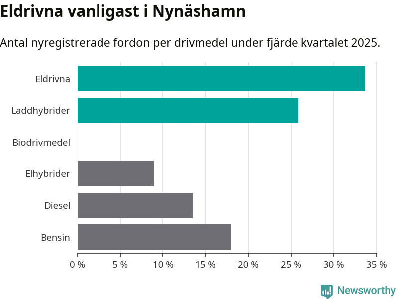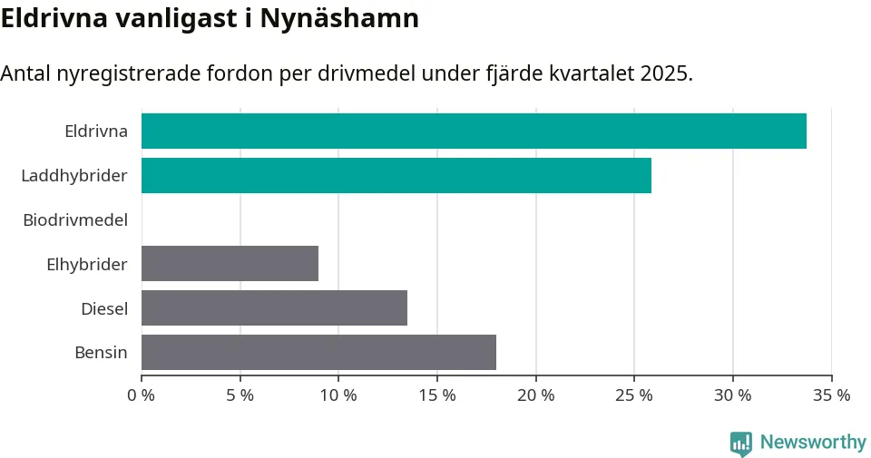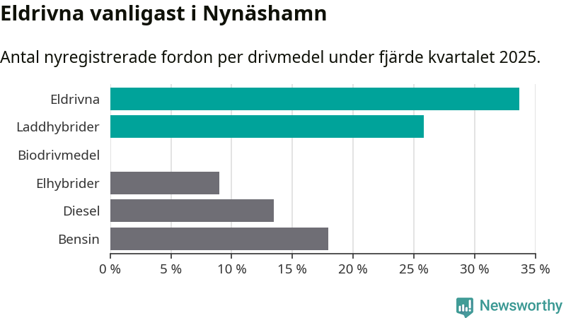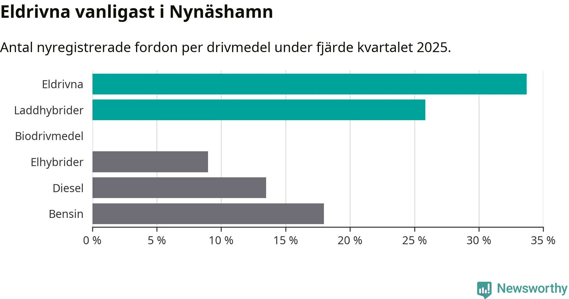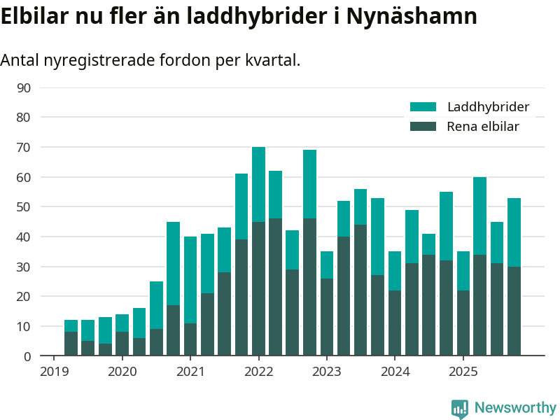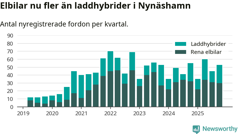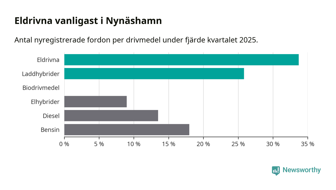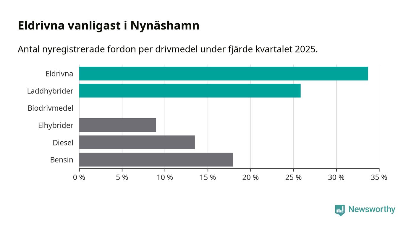 Under fjärde kvartalet 2025 var 60 procent av alla nyregistrerade personbilar i Nynäshamn laddbara (sammanlagt registrerades 89 nya bilar). Merparten av de laddbara bilarna var rena elbilar (34 procent av alla).