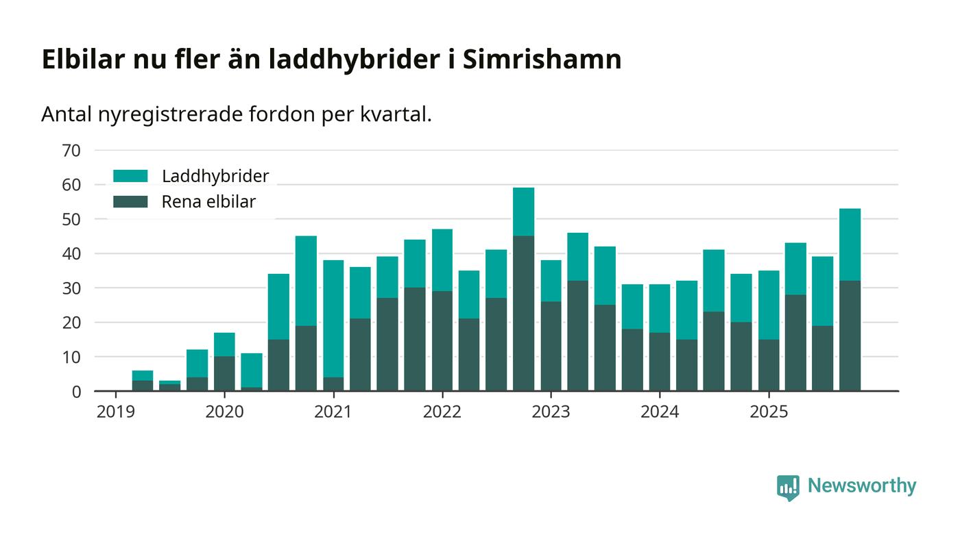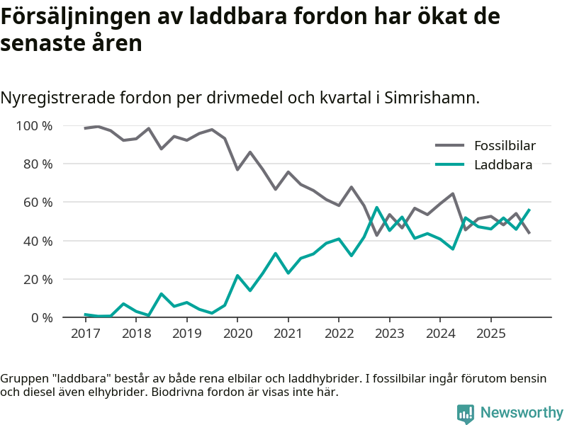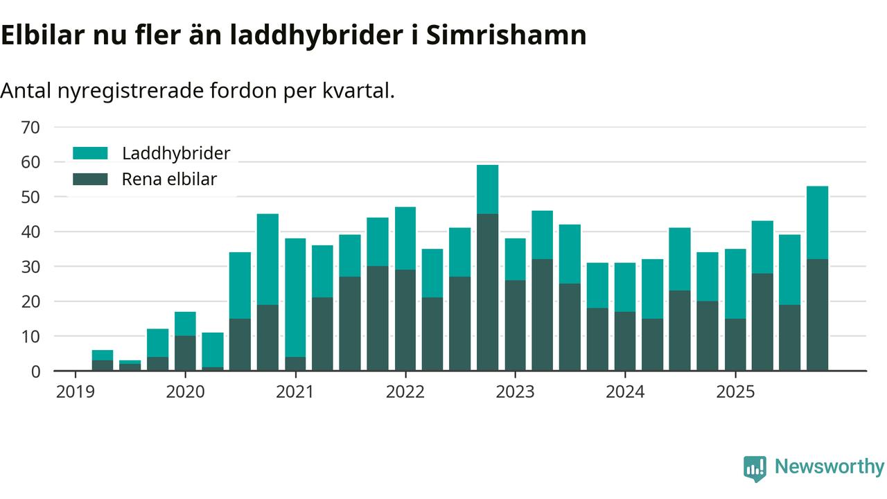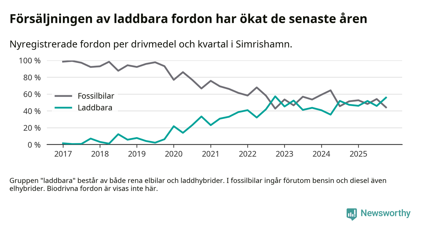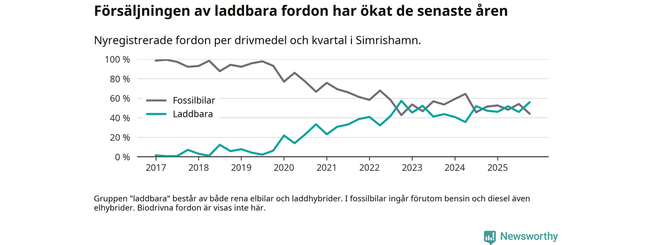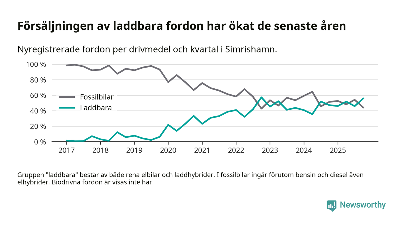 Under fjärde kvartalet 2025 var 56 procent av alla nyregistrerade personbilar i Simrishamn laddbara (sammanlagt registrerades 95 nya bilar). Merparten av de laddbara bilarna var rena elbilar (34 procent av alla).