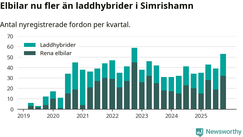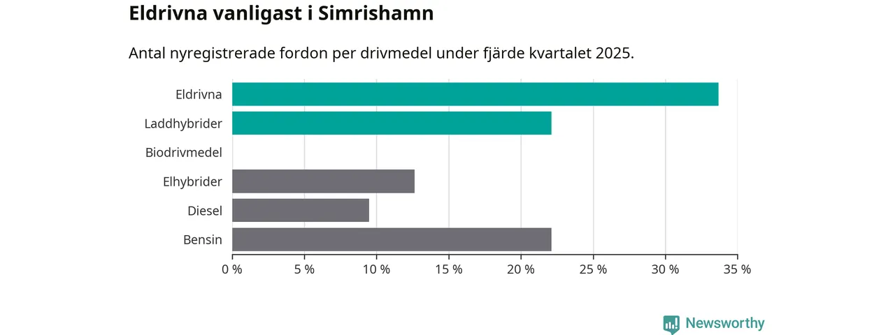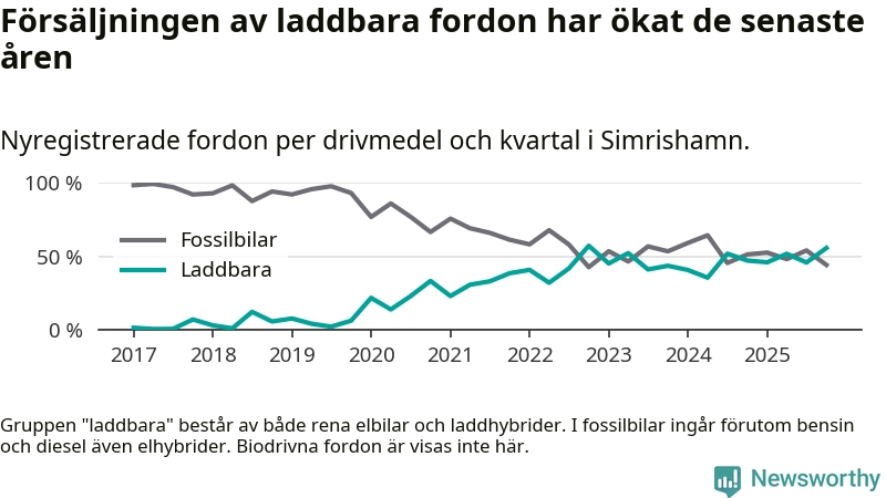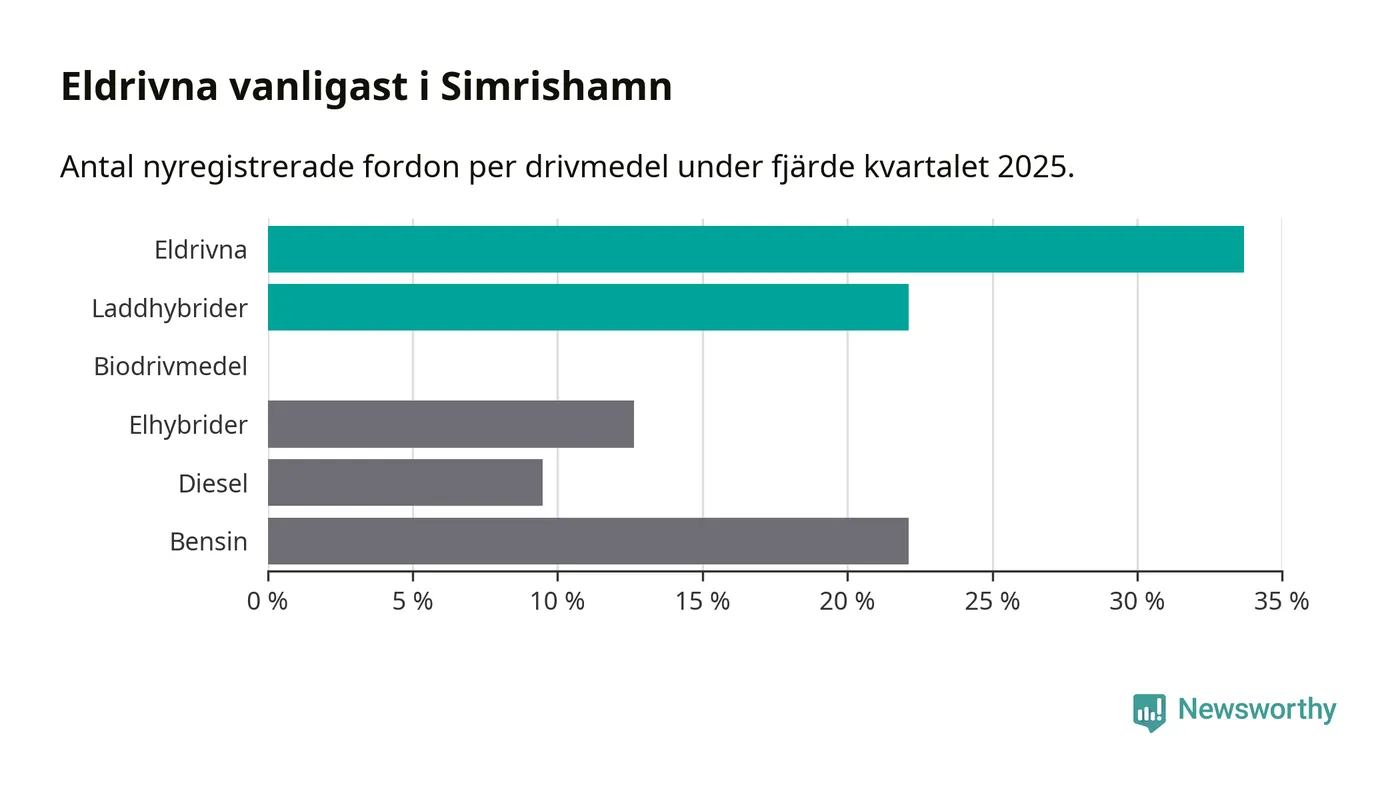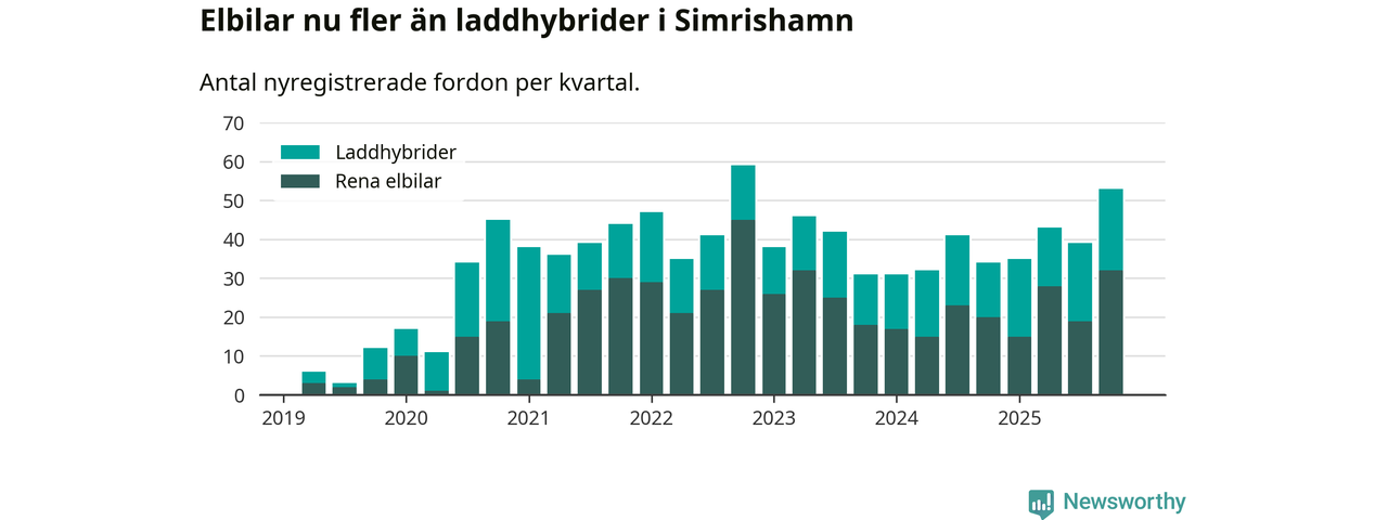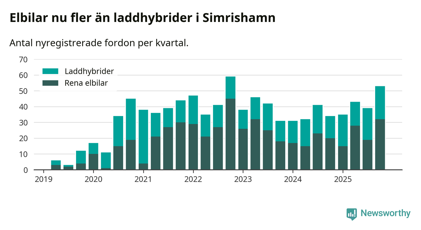 Under fjärde kvartalet 2025 var 56 procent av alla nyregistrerade personbilar i Simrishamn laddbara (sammanlagt registrerades 95 nya bilar). Merparten av de laddbara bilarna var rena elbilar (34 procent av alla).