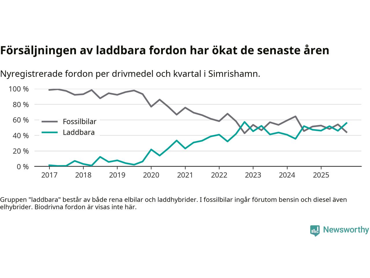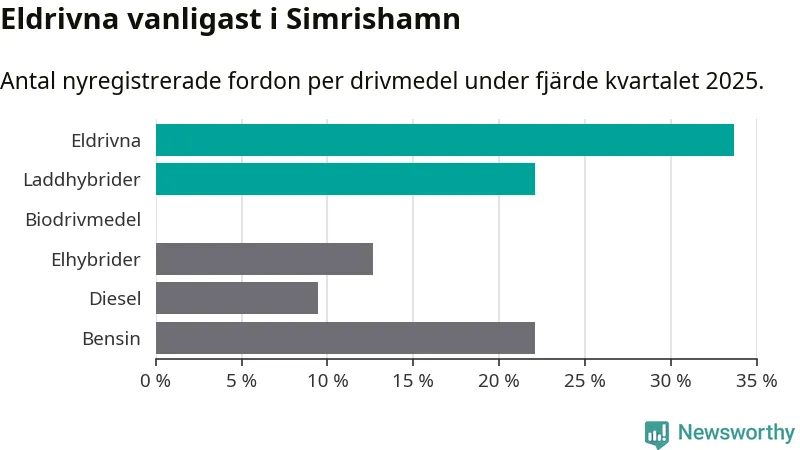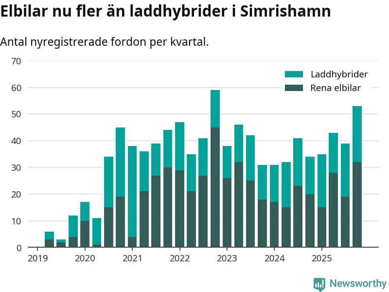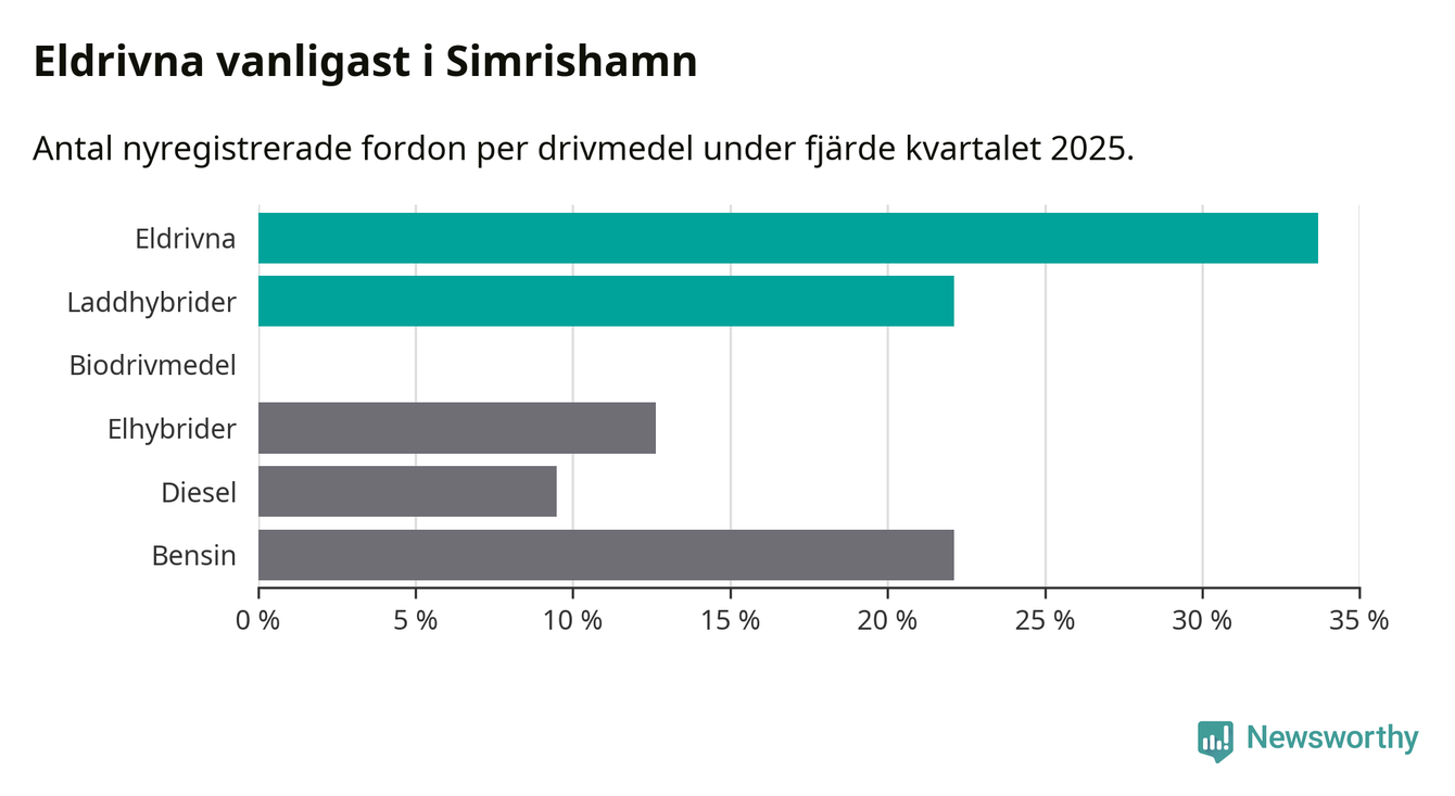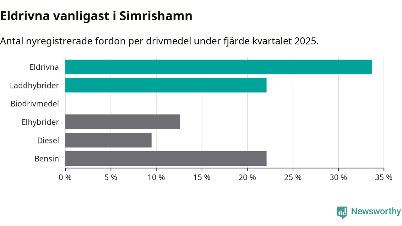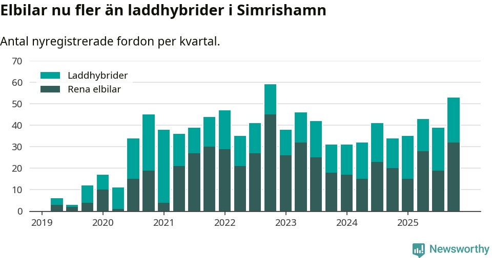 Under fjärde kvartalet 2025 var 56 procent av alla nyregistrerade personbilar i Simrishamn laddbara (sammanlagt registrerades 95 nya bilar). Merparten av de laddbara bilarna var rena elbilar (34 procent av alla).