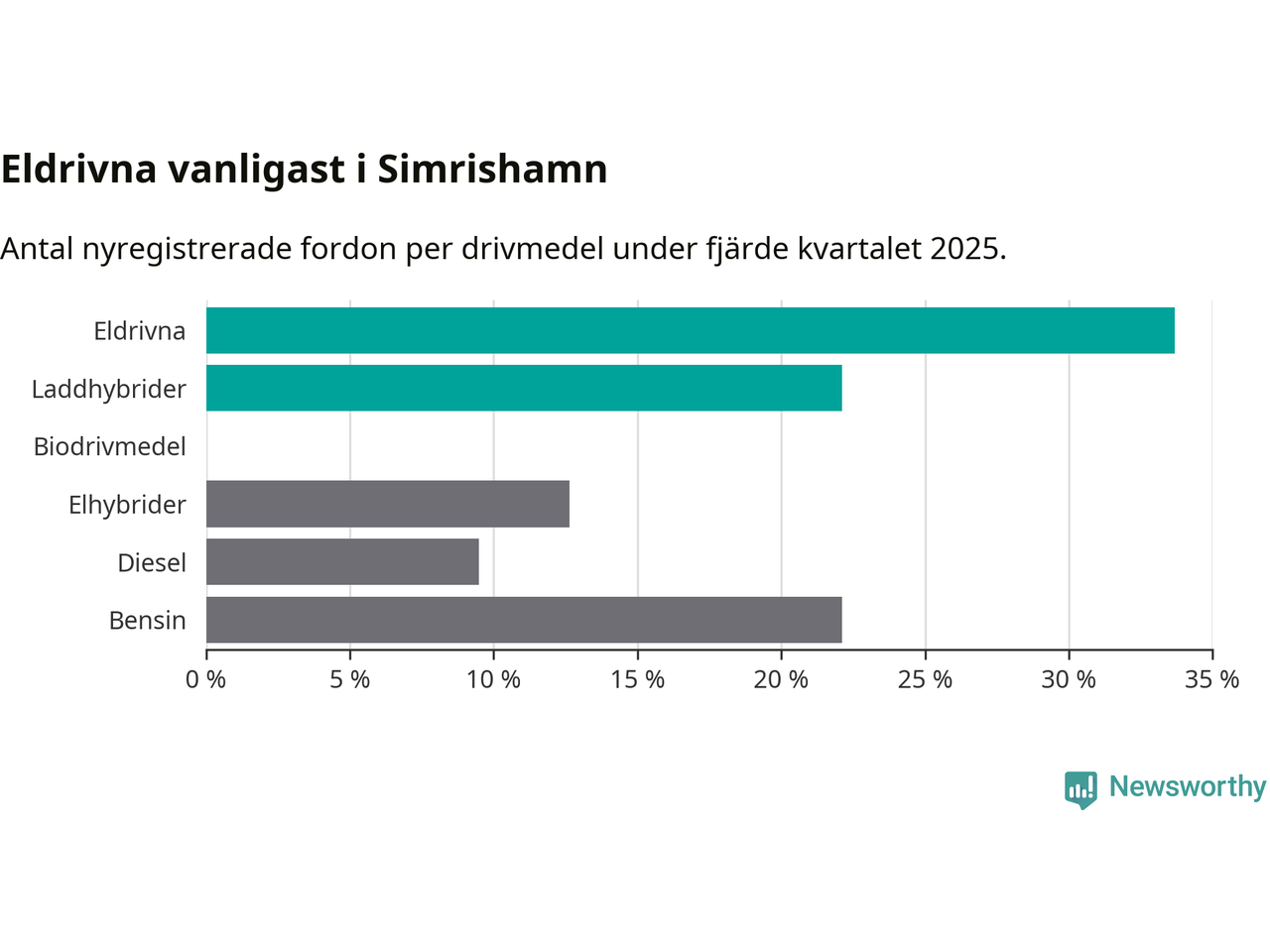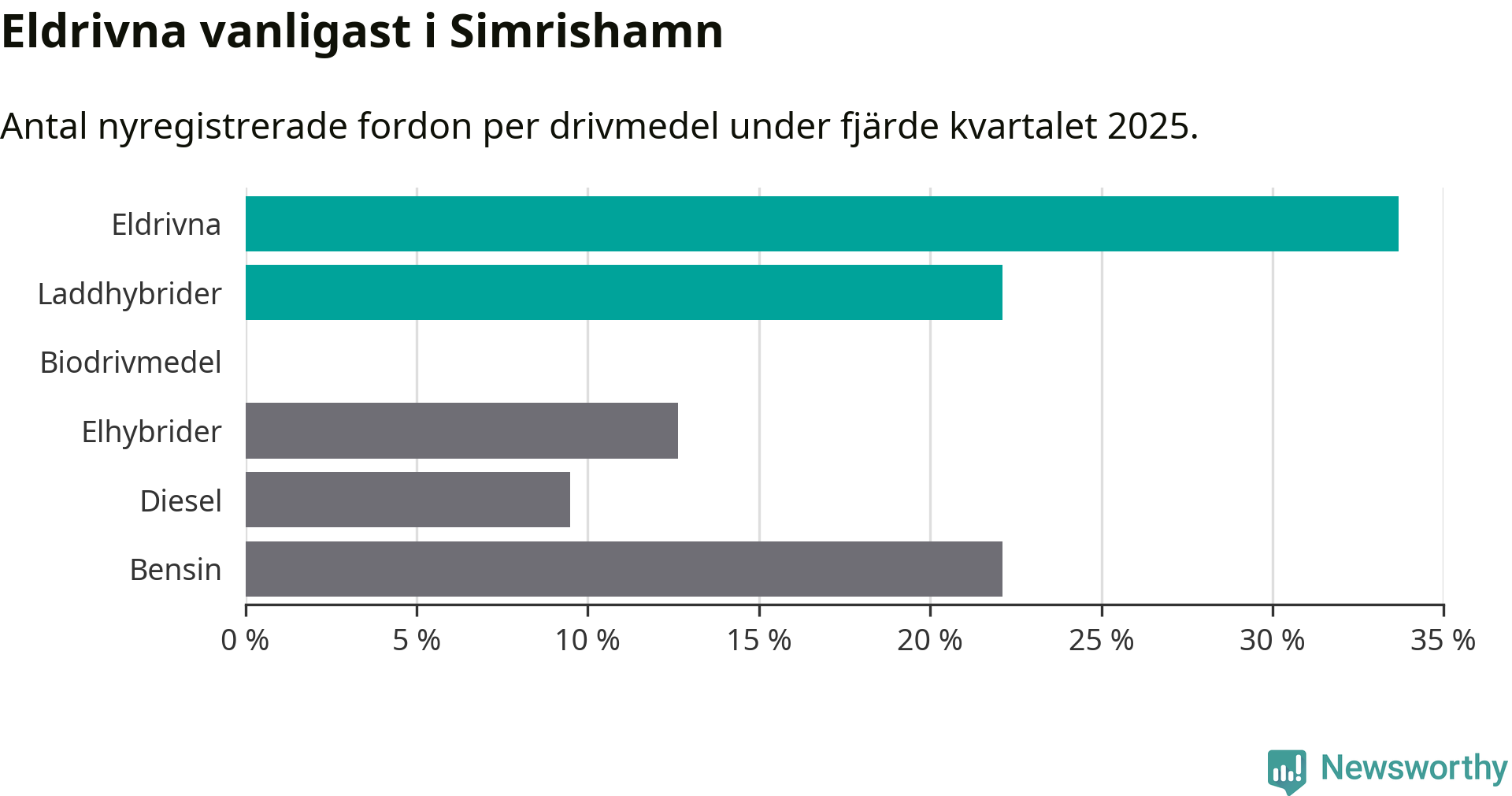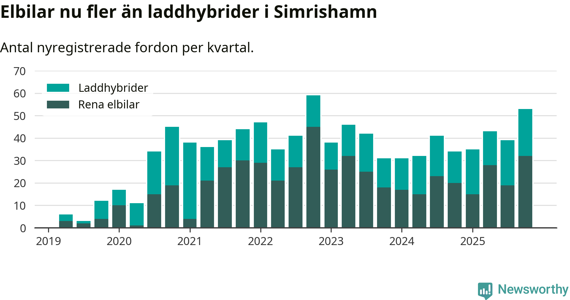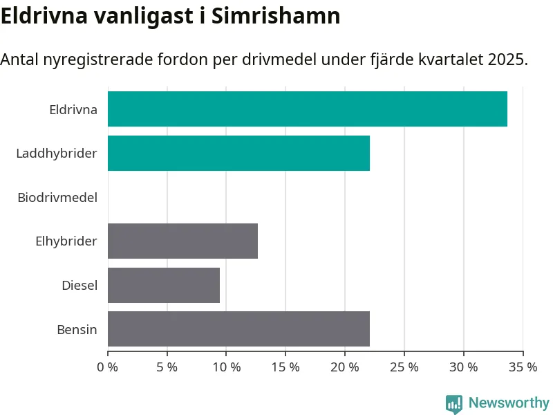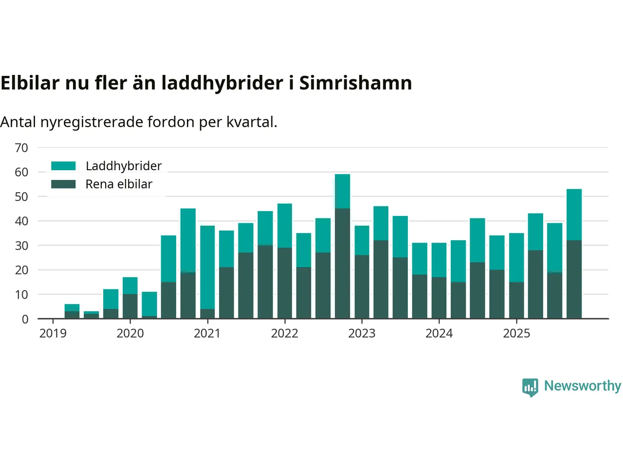 Under fjärde kvartalet 2025 var 56 procent av alla nyregistrerade personbilar i Simrishamn laddbara (sammanlagt registrerades 95 nya bilar). Merparten av de laddbara bilarna var rena elbilar (34 procent av alla).