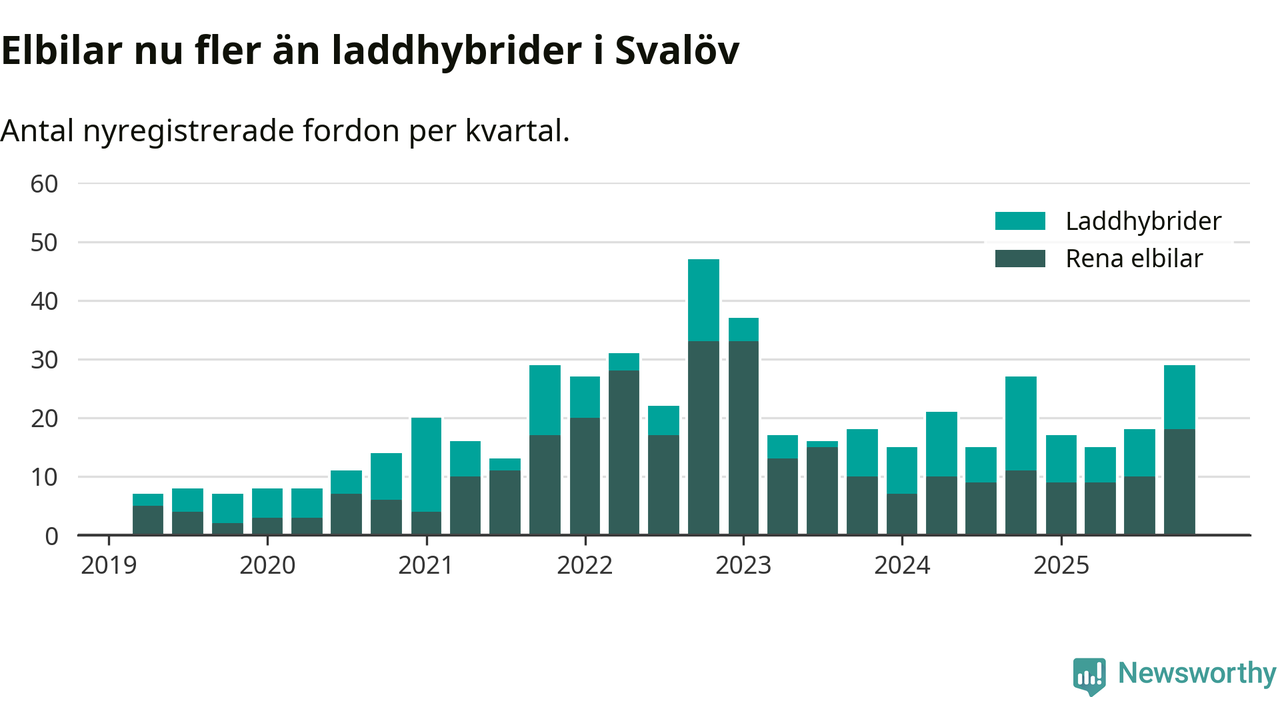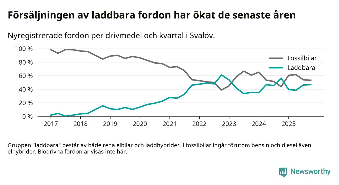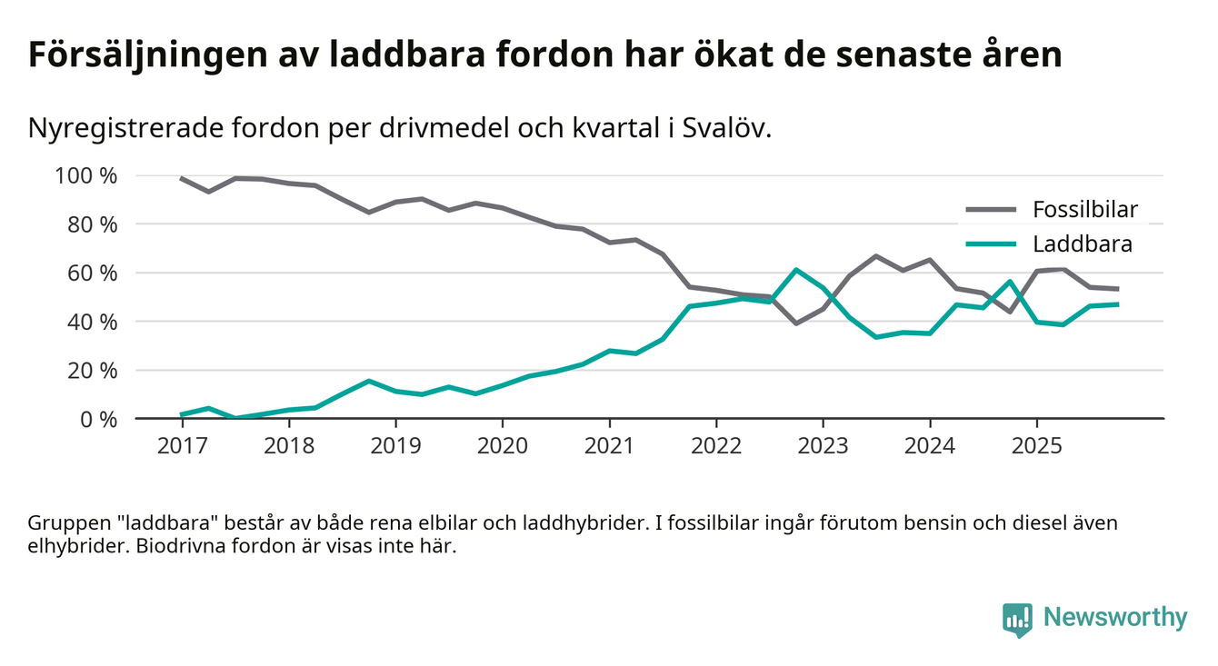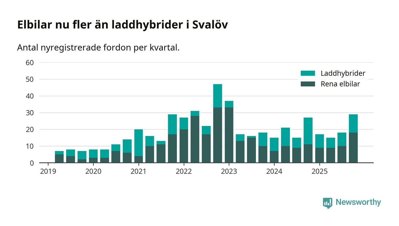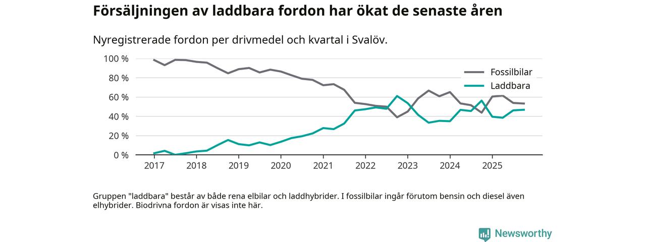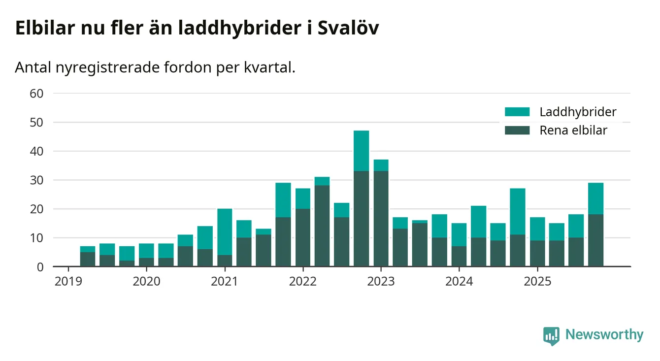 Under fjärde kvartalet 2025 var 47 procent av alla nyregistrerade personbilar i Svalöv laddbara (sammanlagt registrerades 62 nya bilar). Merparten av de laddbara bilarna var rena elbilar (29 procent av alla).