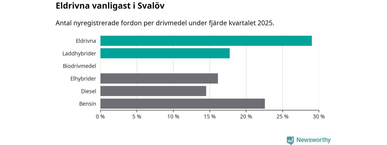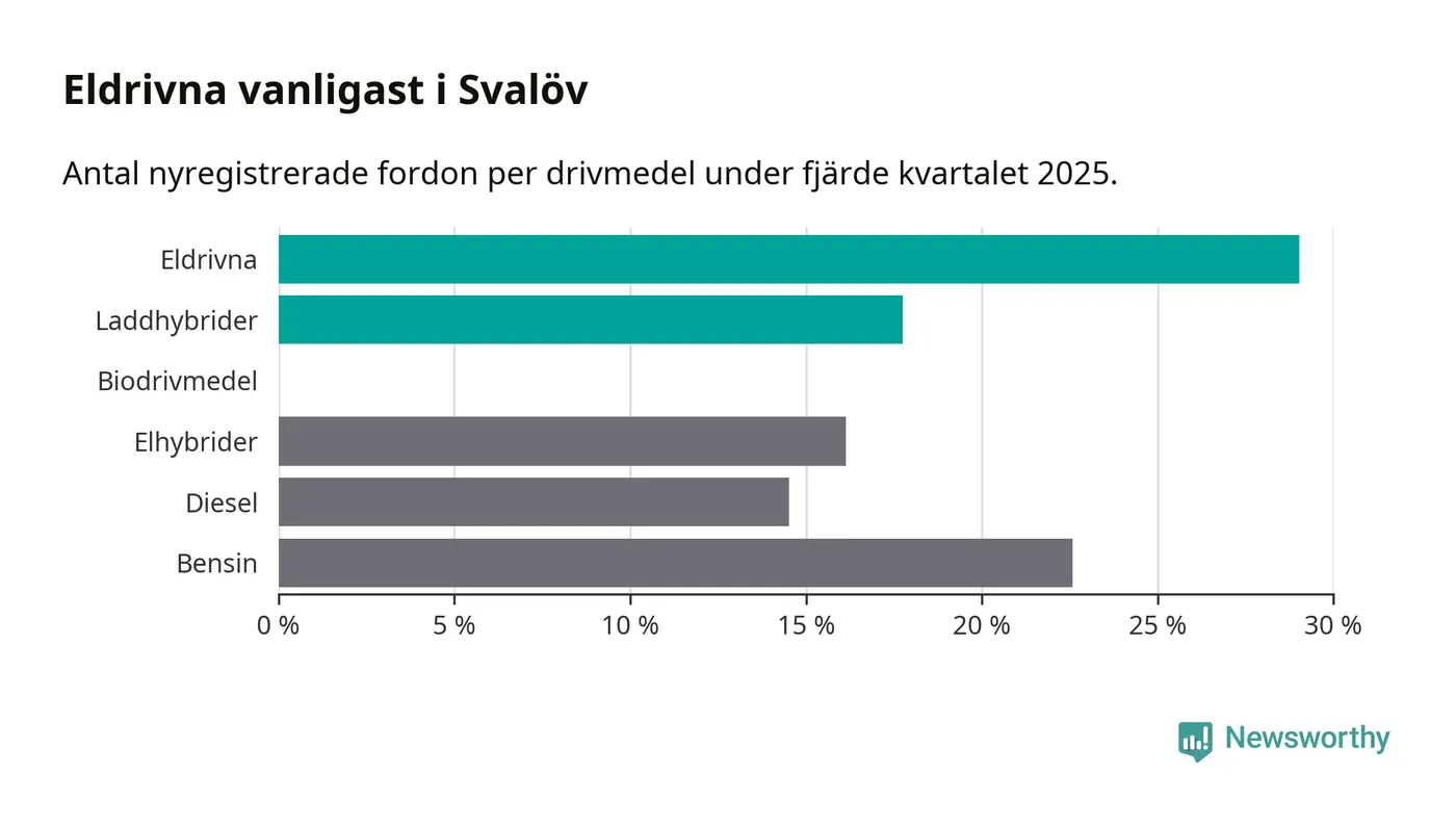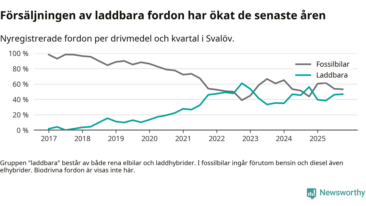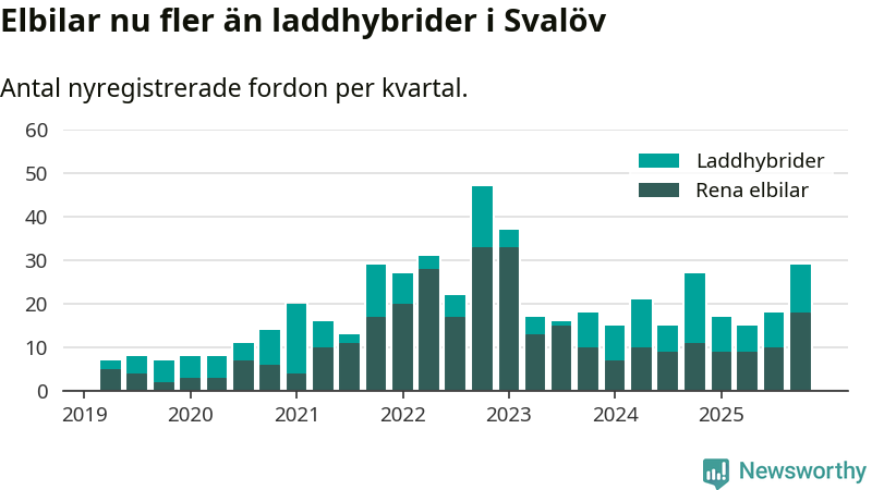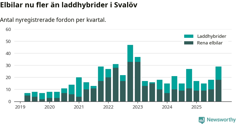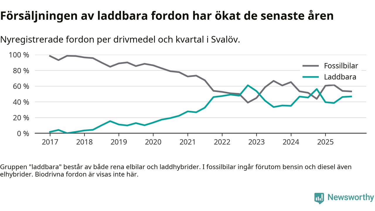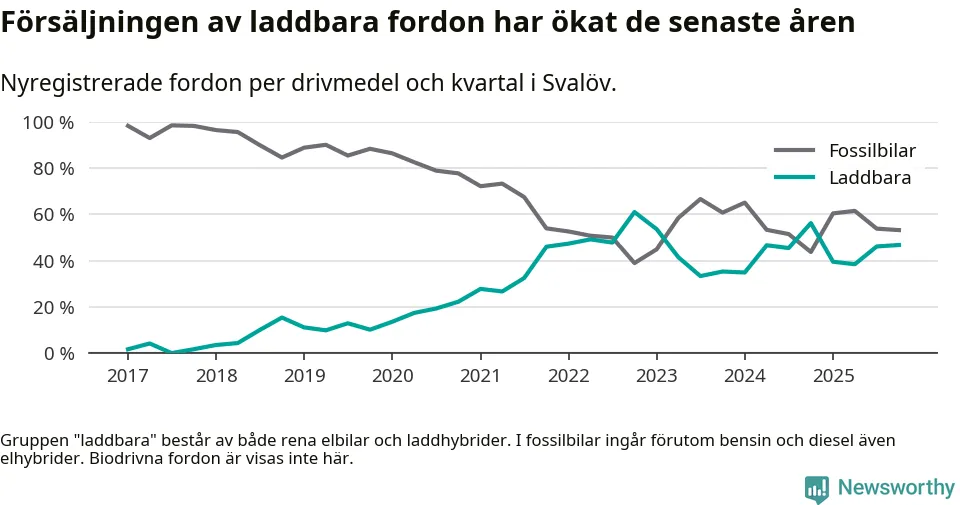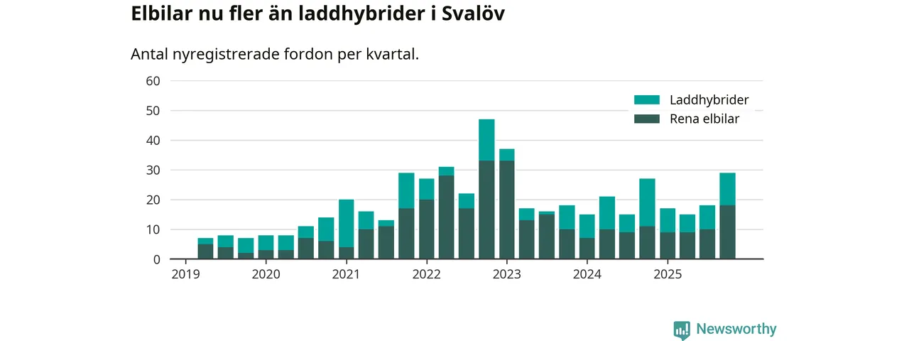 Under fjärde kvartalet 2025 var 47 procent av alla nyregistrerade personbilar i Svalöv laddbara (sammanlagt registrerades 62 nya bilar). Merparten av de laddbara bilarna var rena elbilar (29 procent av alla).