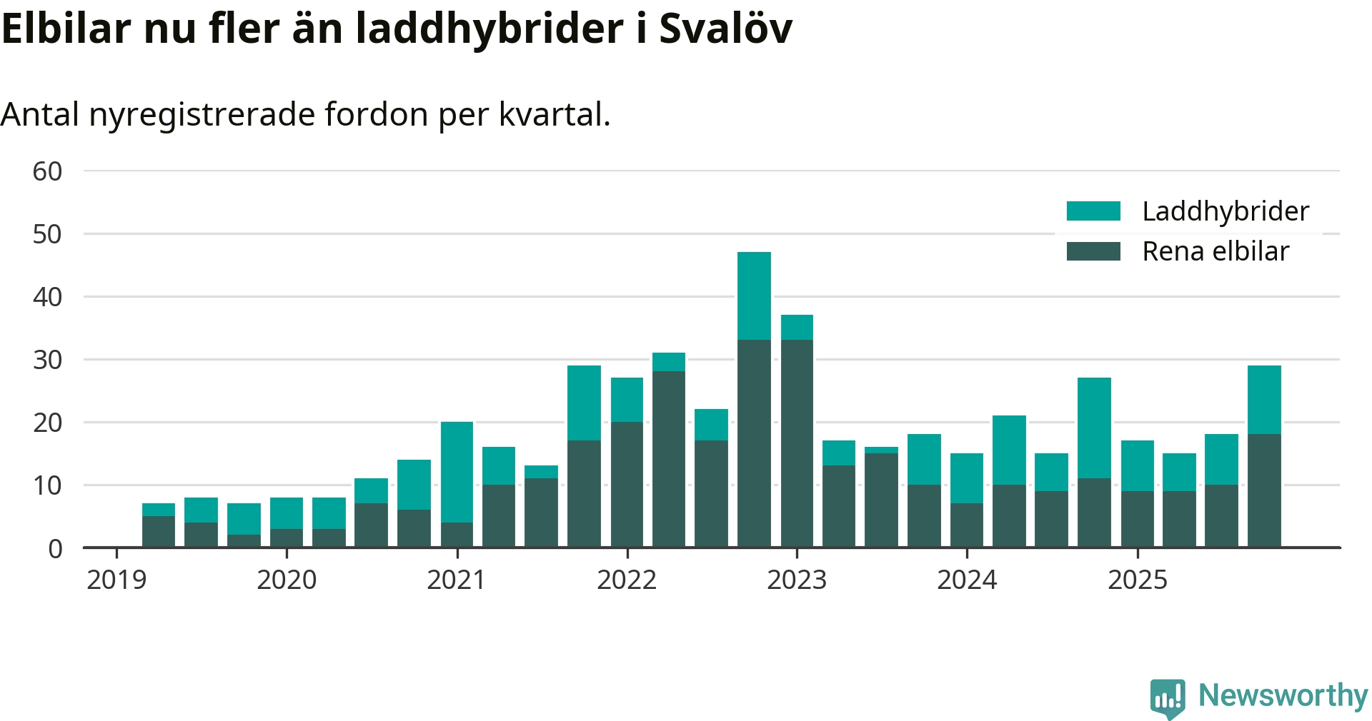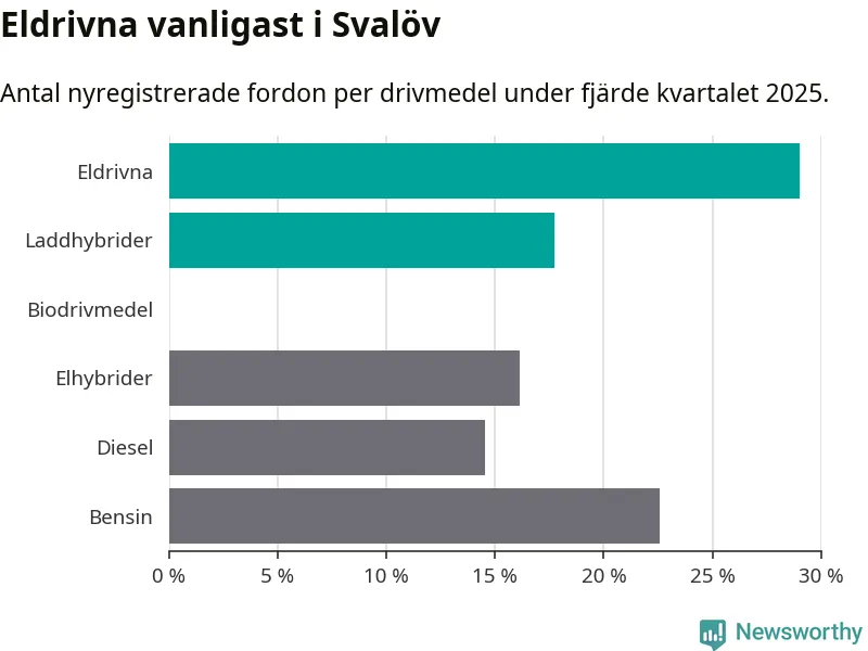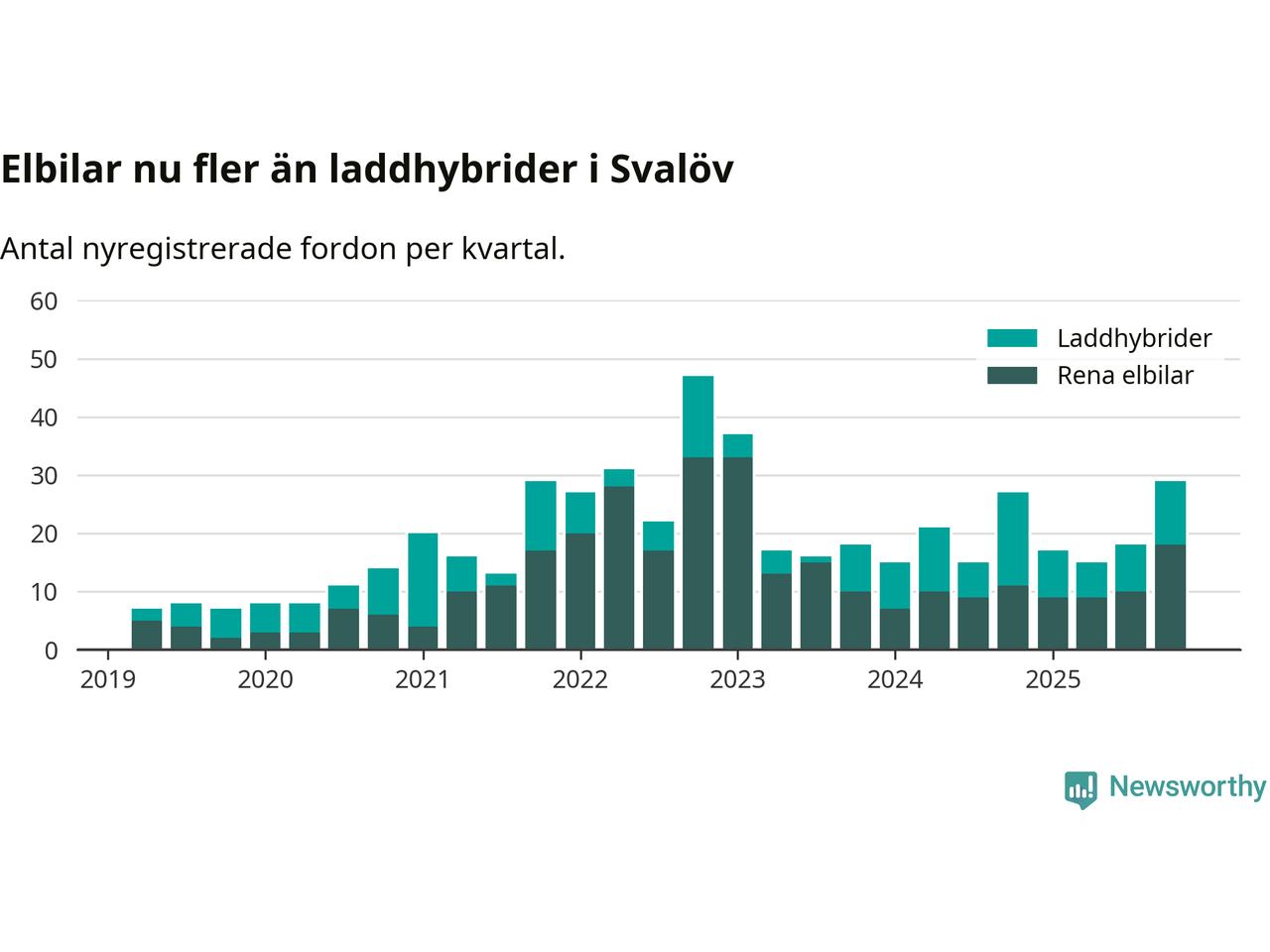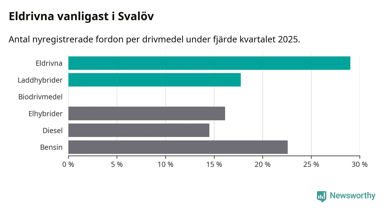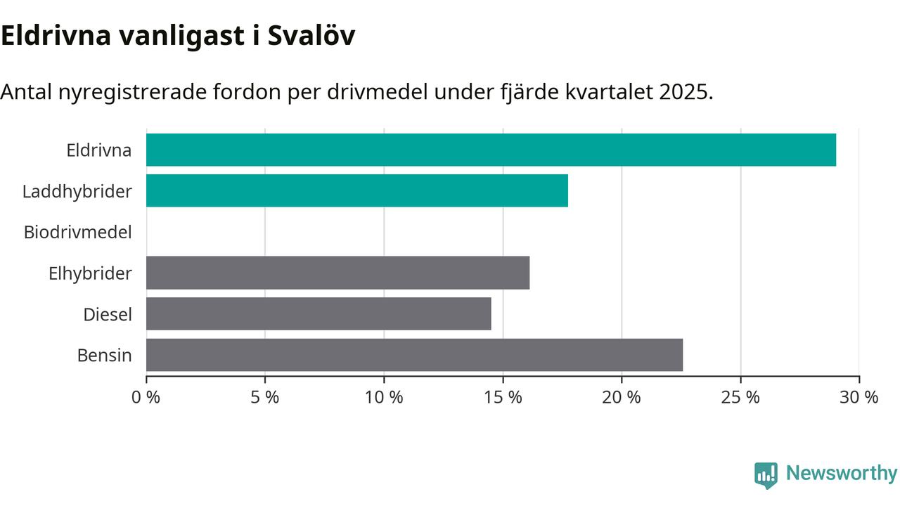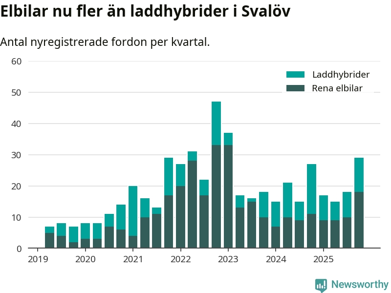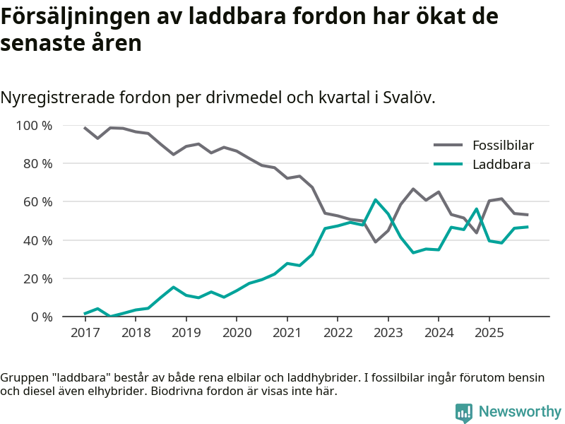 Under fjärde kvartalet 2025 var 47 procent av alla nyregistrerade personbilar i Svalöv laddbara (sammanlagt registrerades 62 nya bilar). Merparten av de laddbara bilarna var rena elbilar (29 procent av alla).