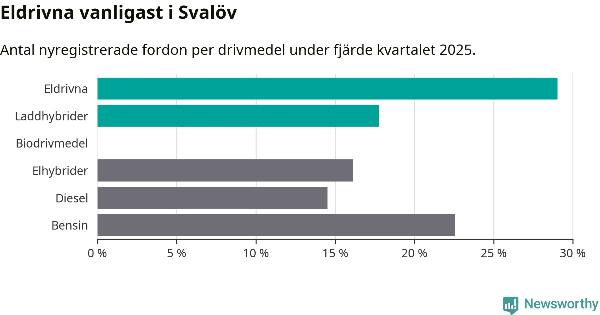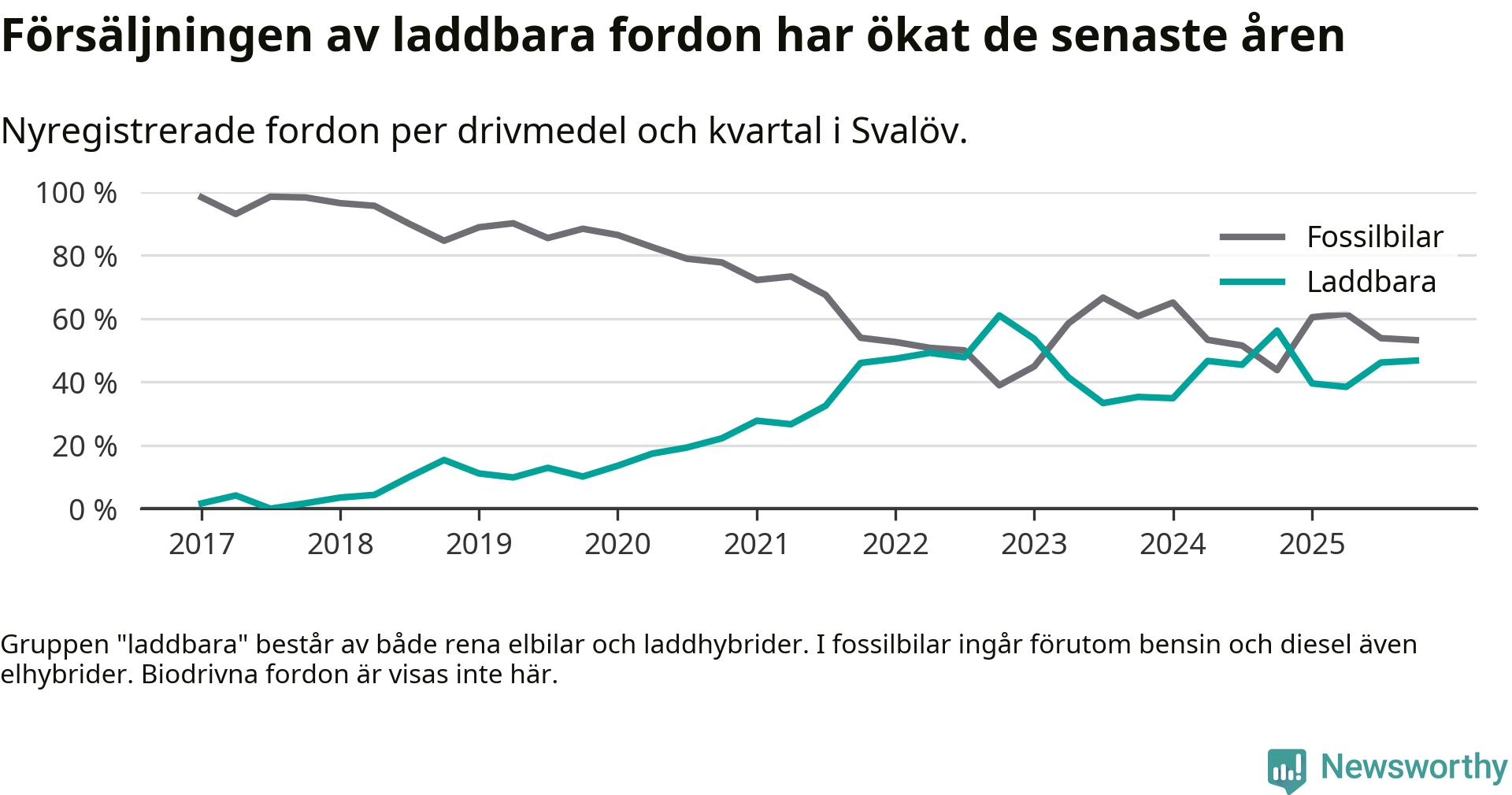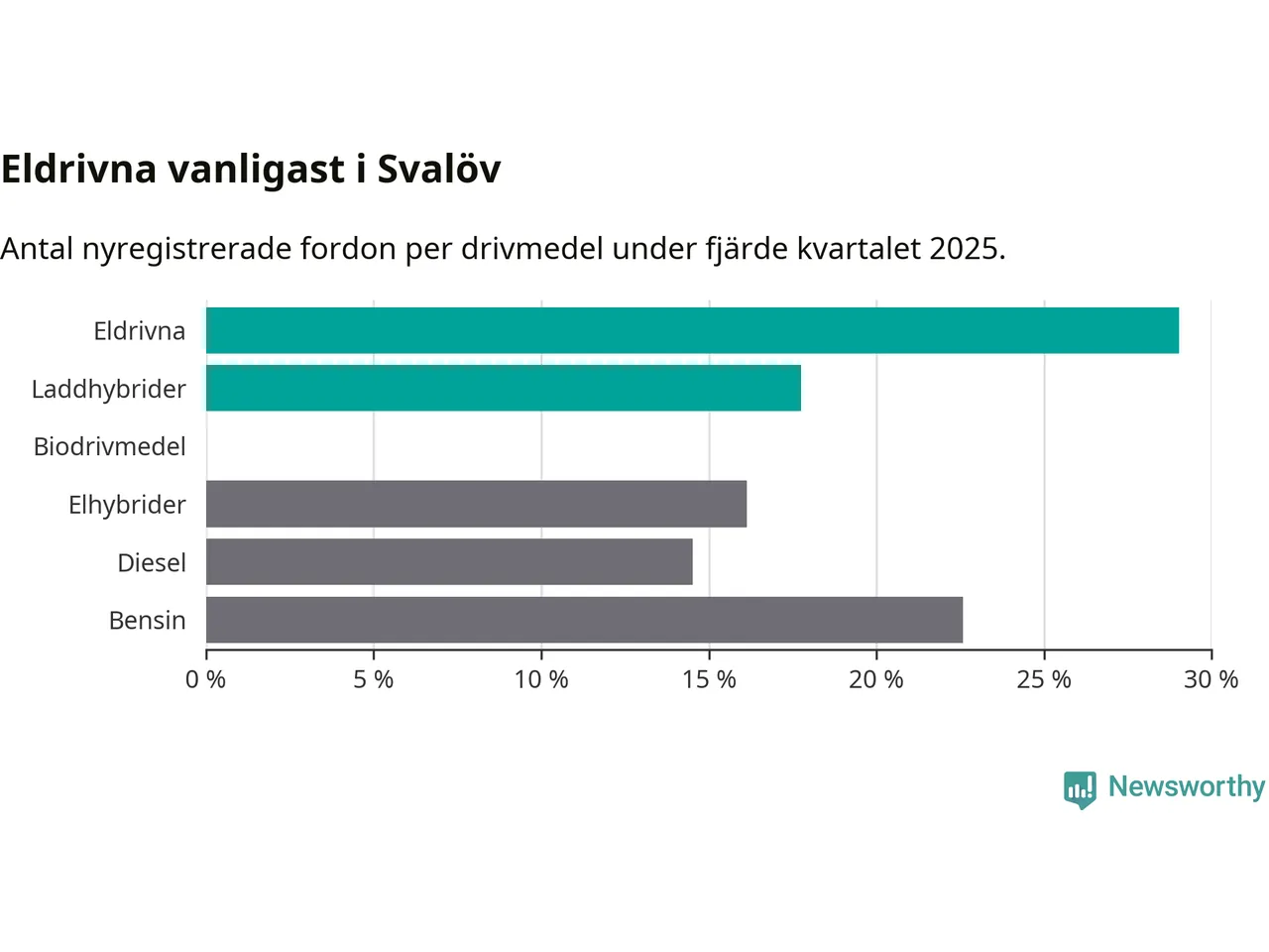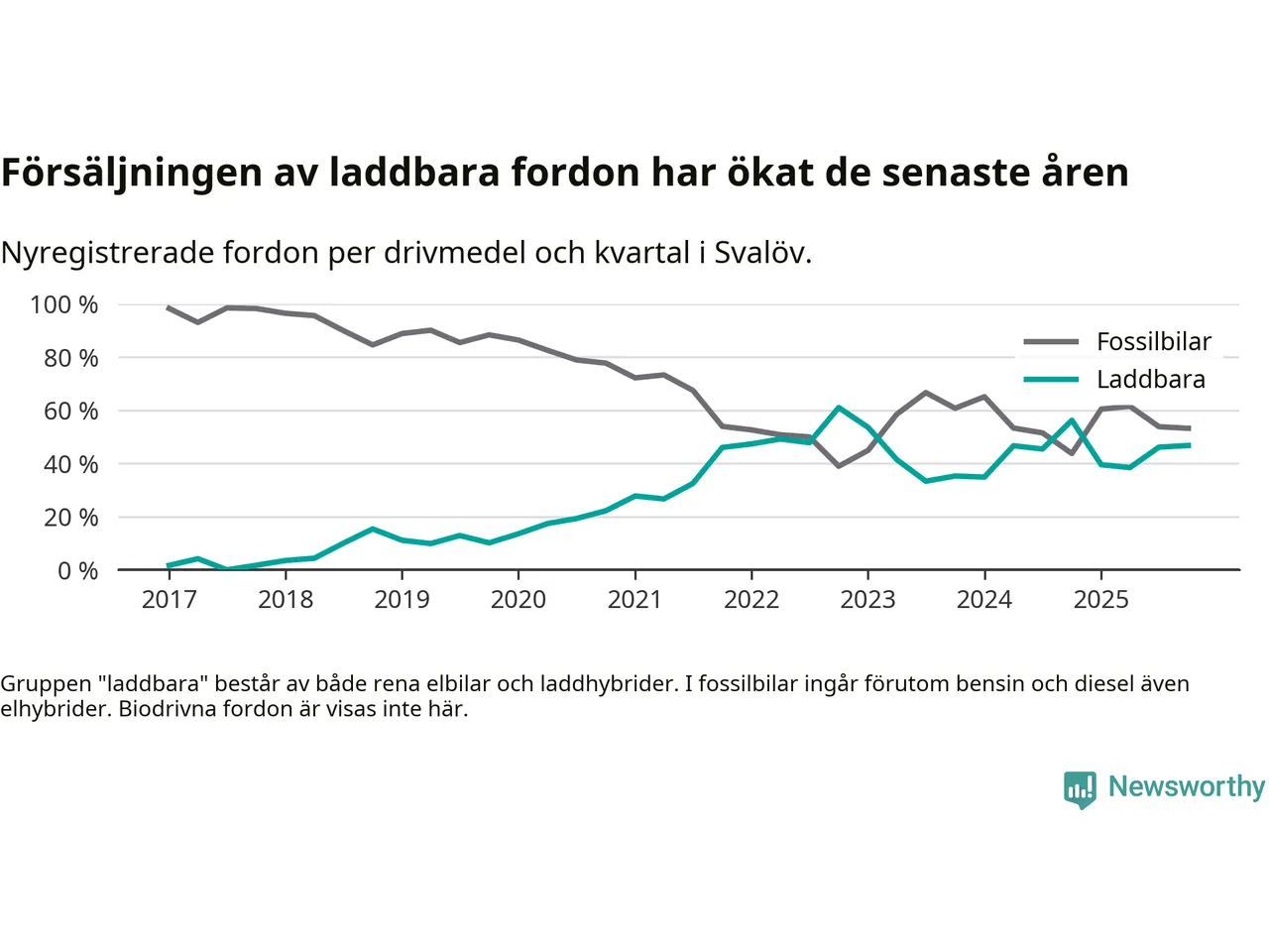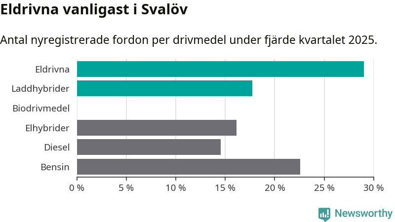 Under fjärde kvartalet 2025 var 47 procent av alla nyregistrerade personbilar i Svalöv laddbara (sammanlagt registrerades 62 nya bilar). Merparten av de laddbara bilarna var rena elbilar (29 procent av alla).