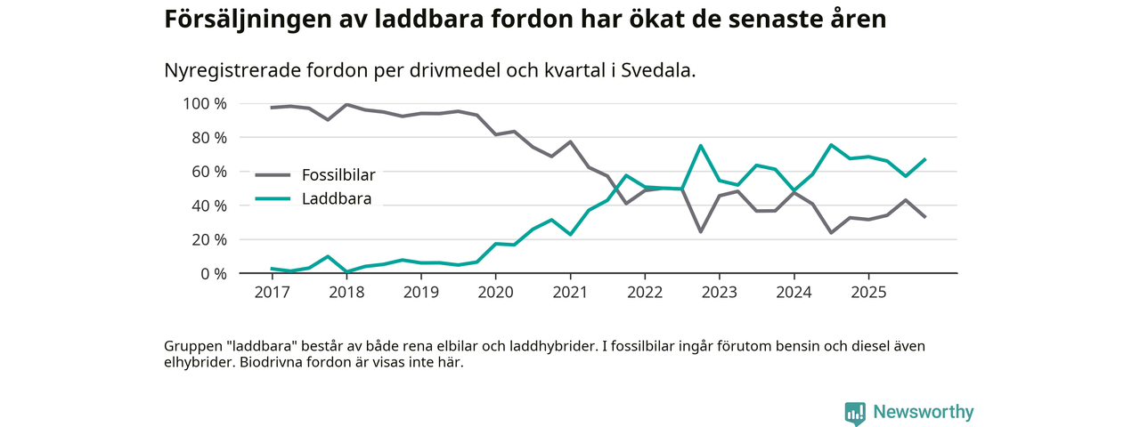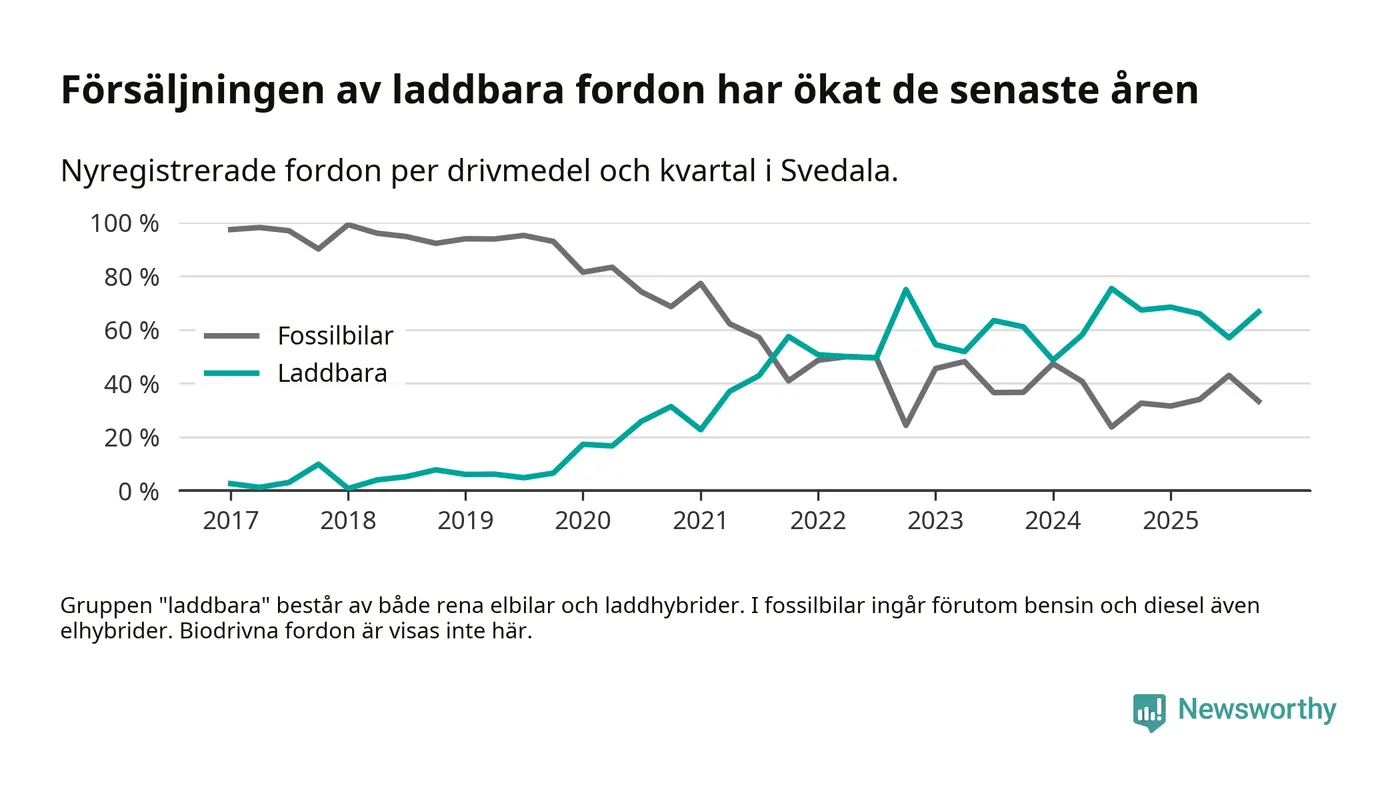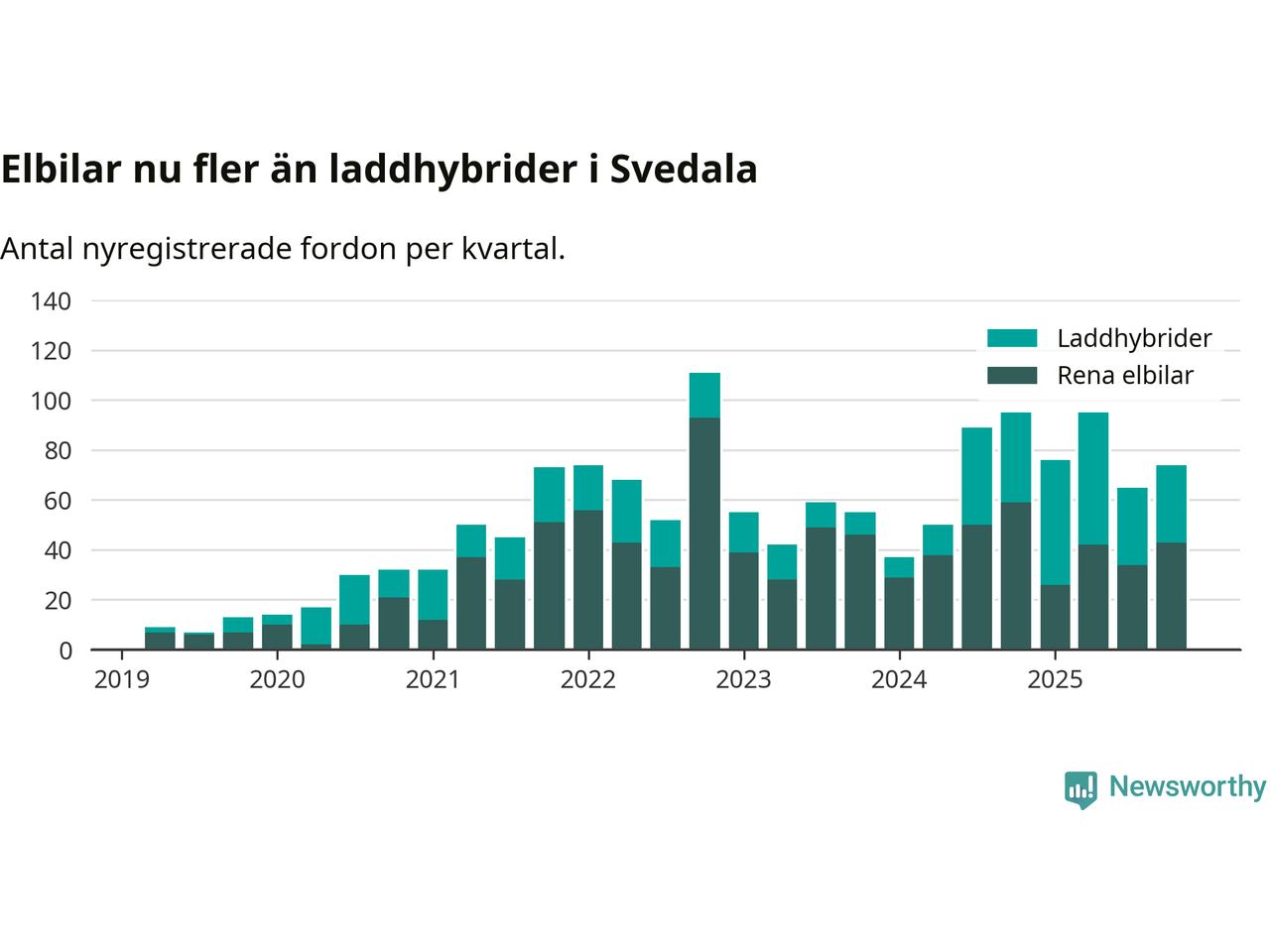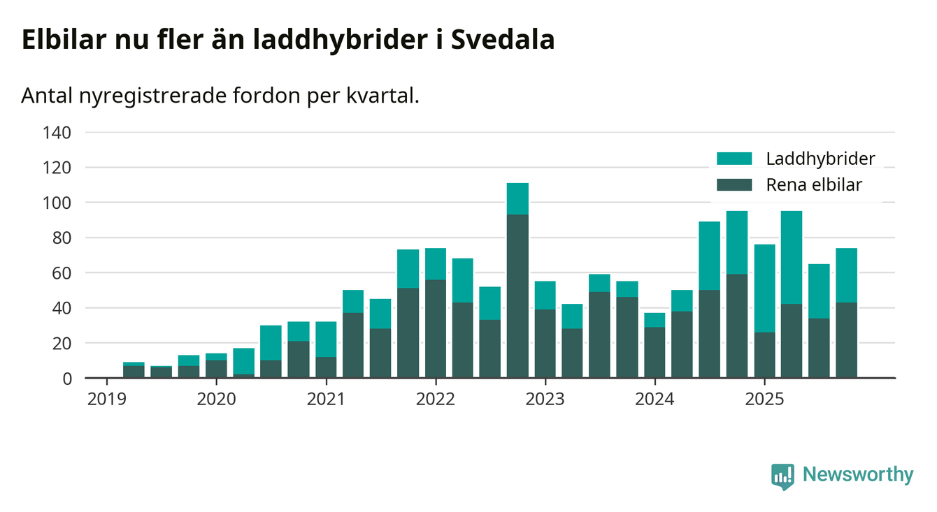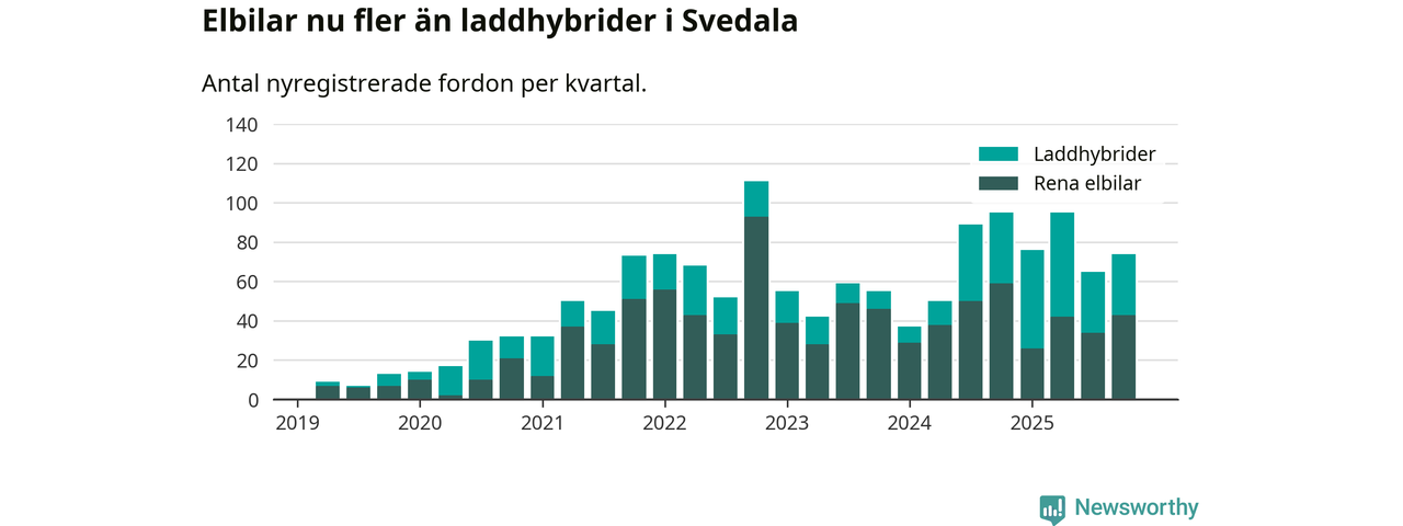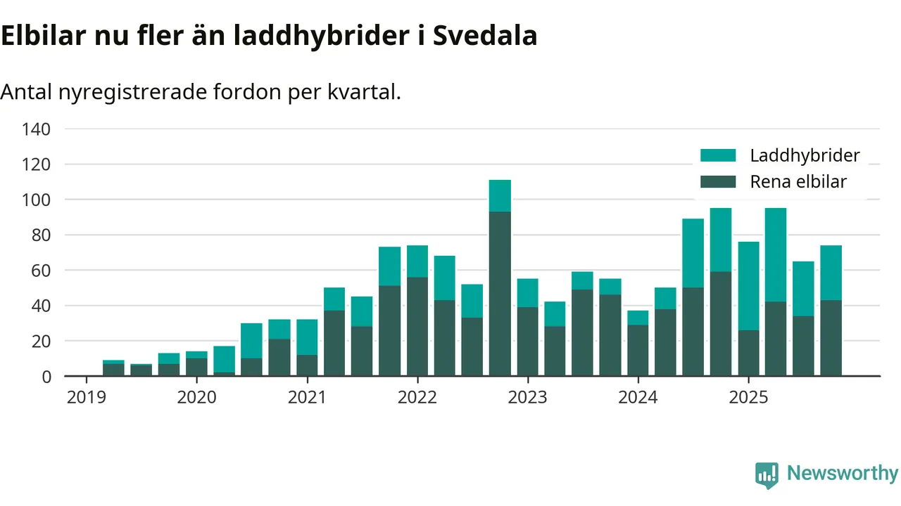 Under fjärde kvartalet 2025 var 67 procent av alla nyregistrerade personbilar i Svedala laddbara (sammanlagt registrerades 111 nya bilar). Merparten av de laddbara bilarna var rena elbilar (39 procent av alla).