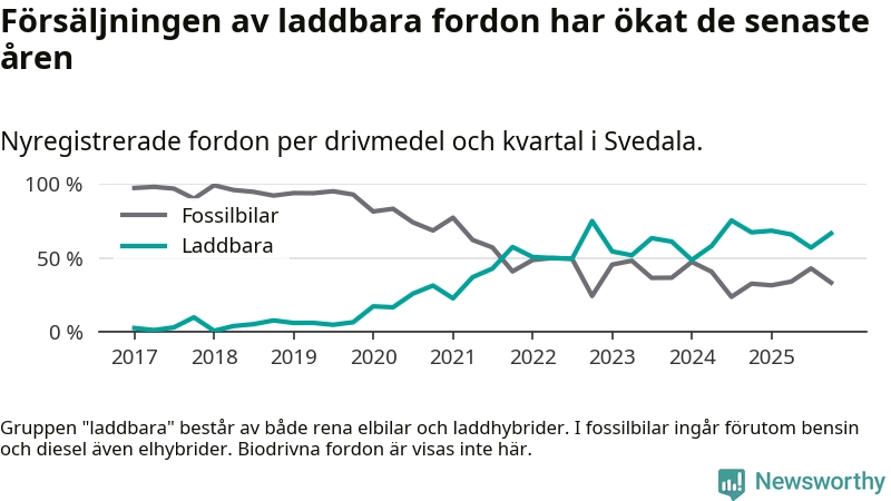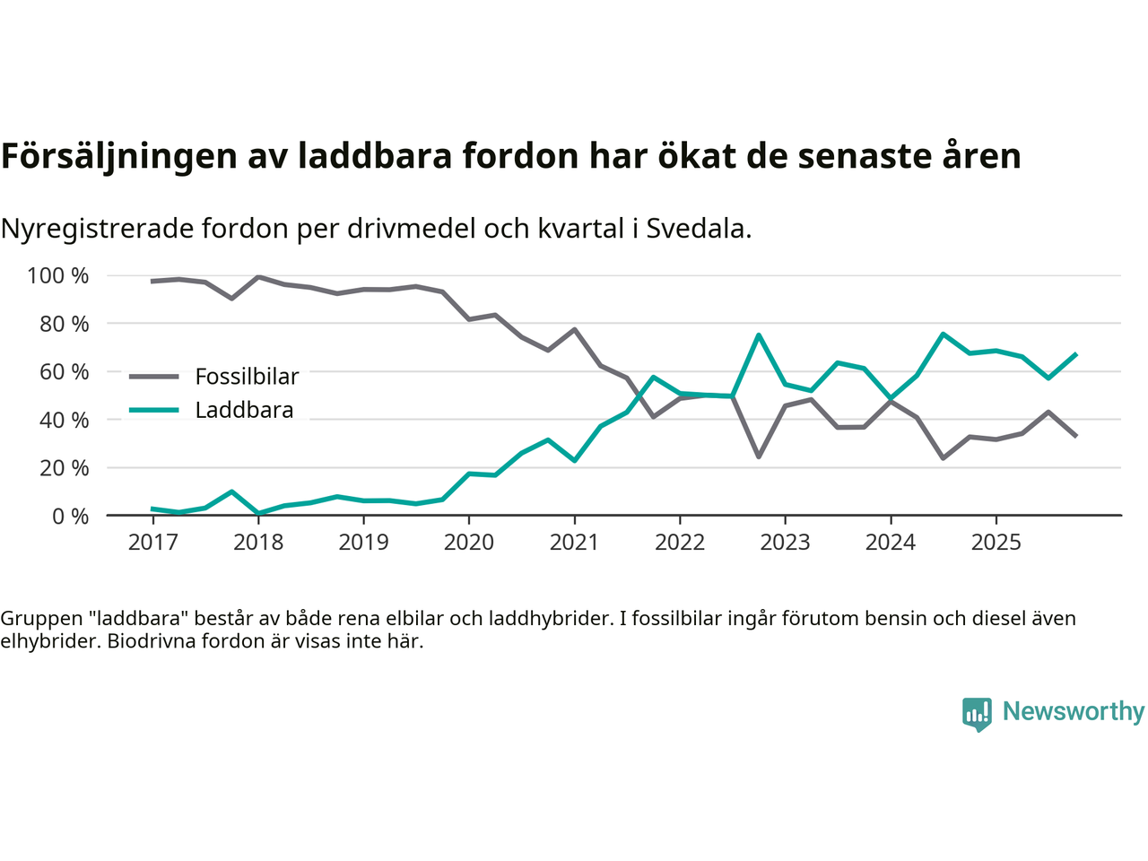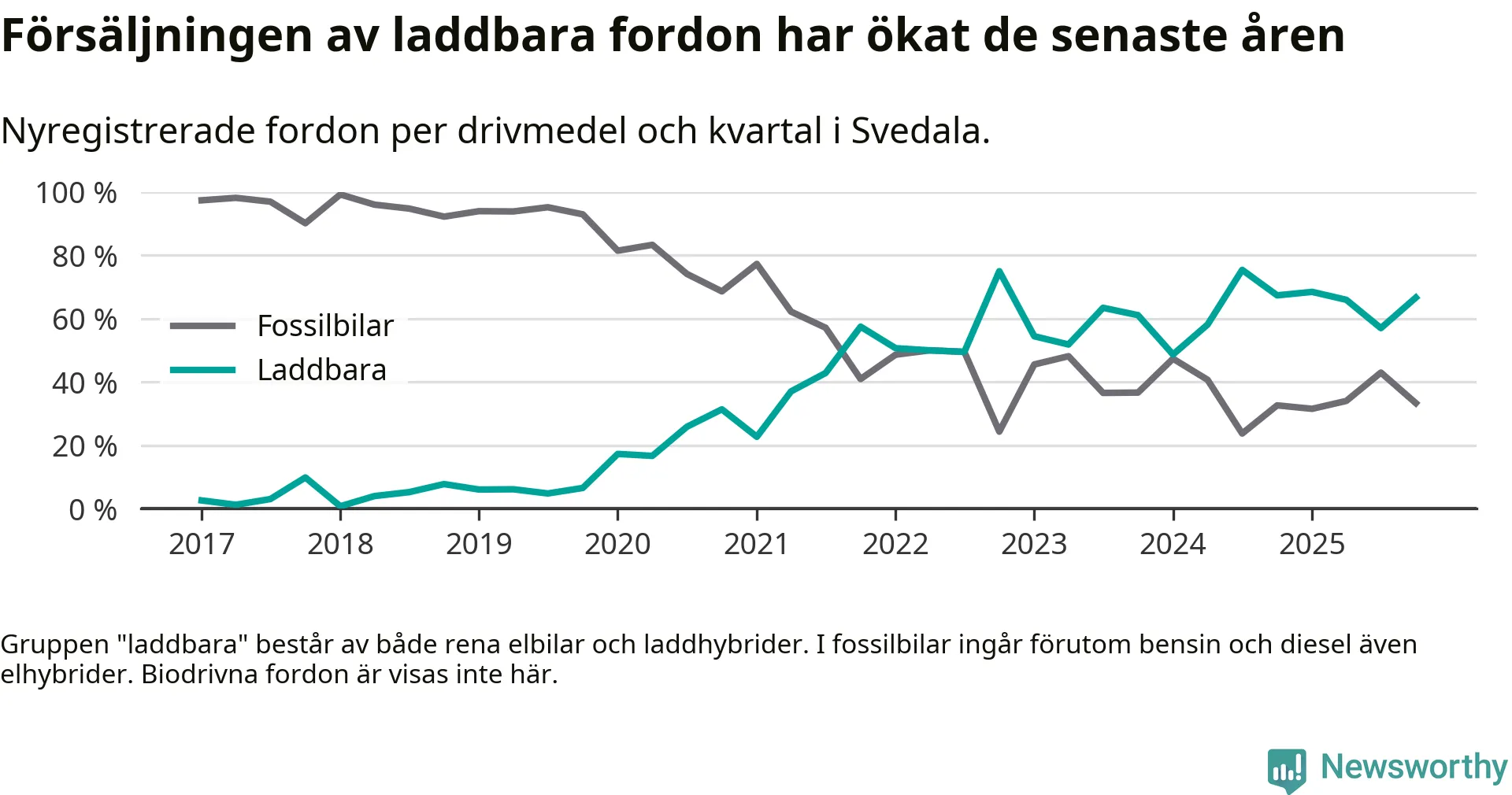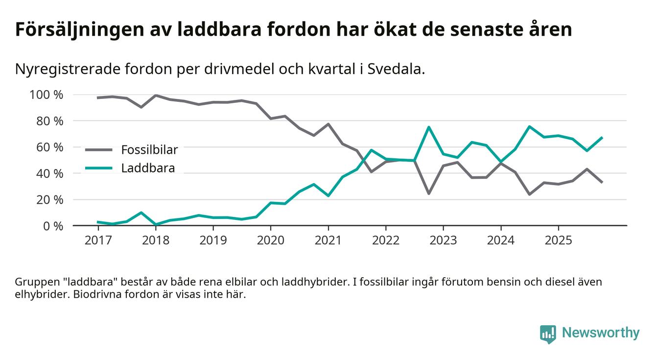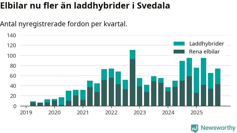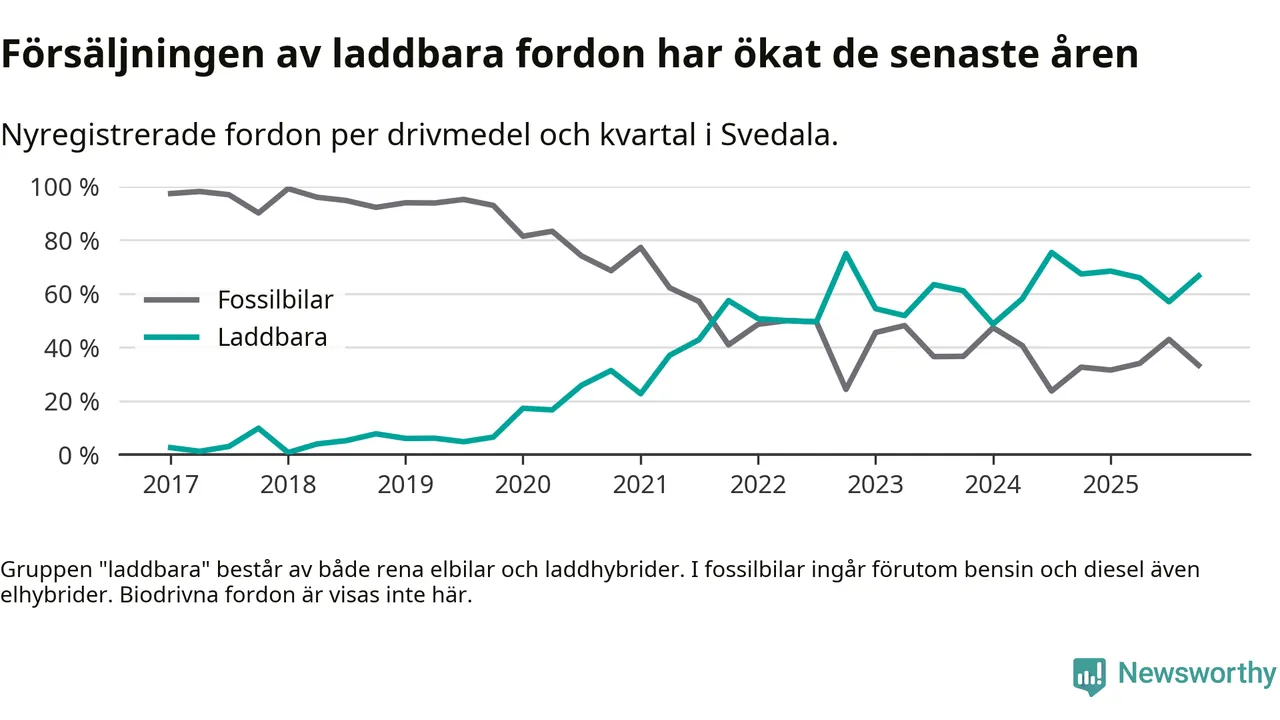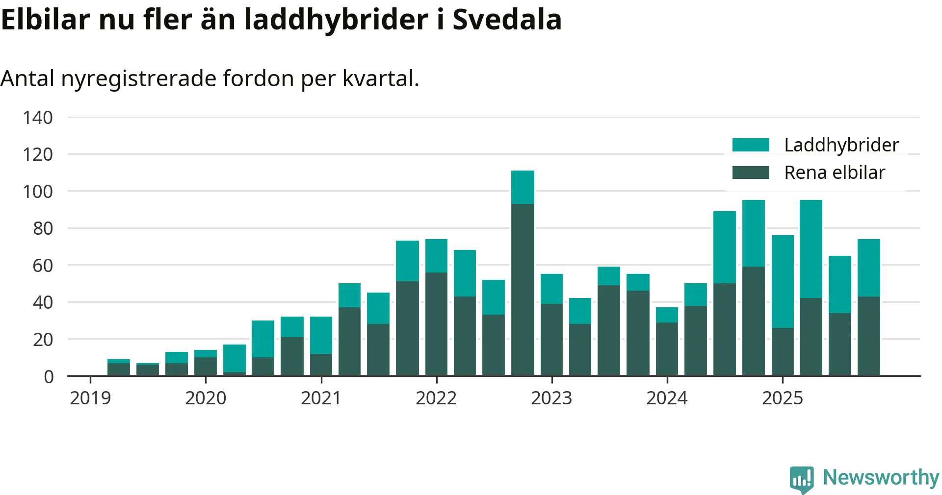 Under fjärde kvartalet 2025 var 67 procent av alla nyregistrerade personbilar i Svedala laddbara (sammanlagt registrerades 111 nya bilar). Merparten av de laddbara bilarna var rena elbilar (39 procent av alla).
