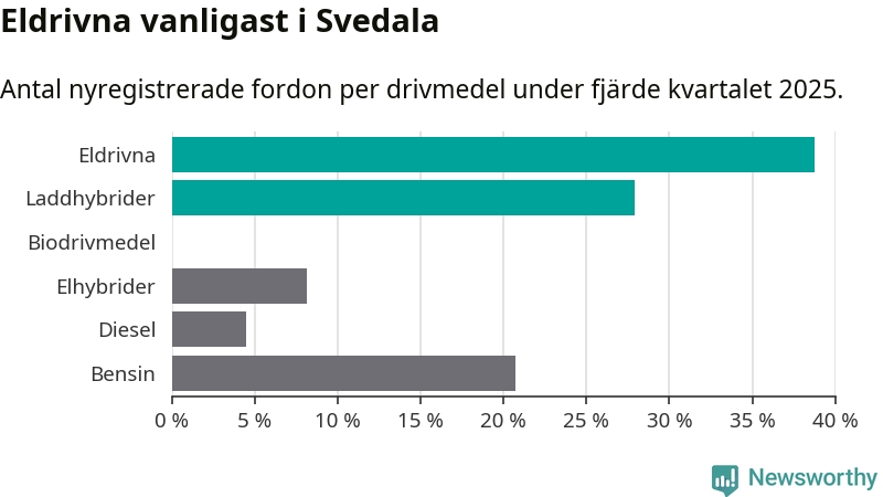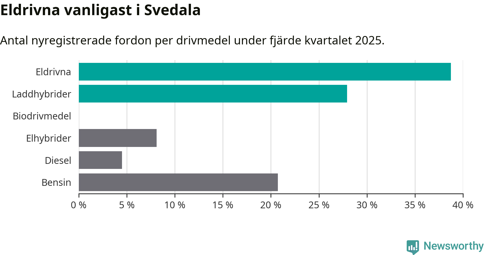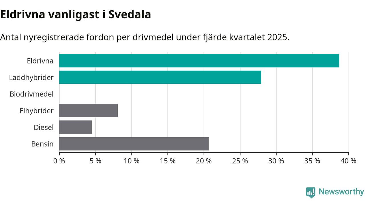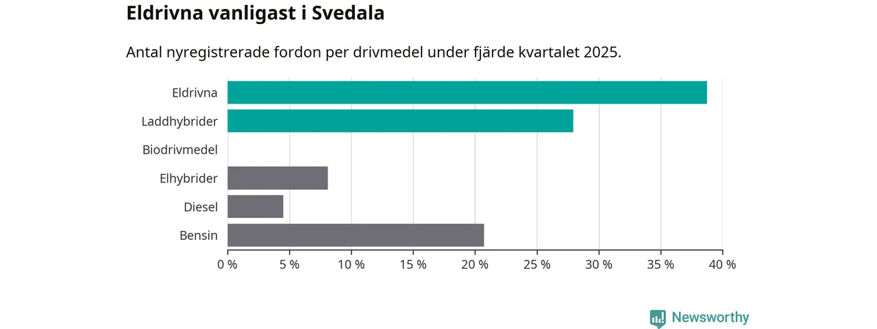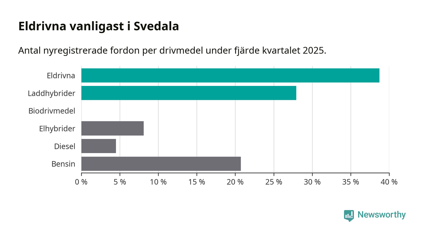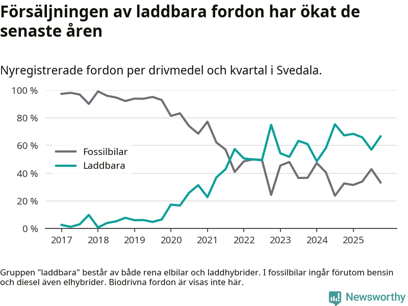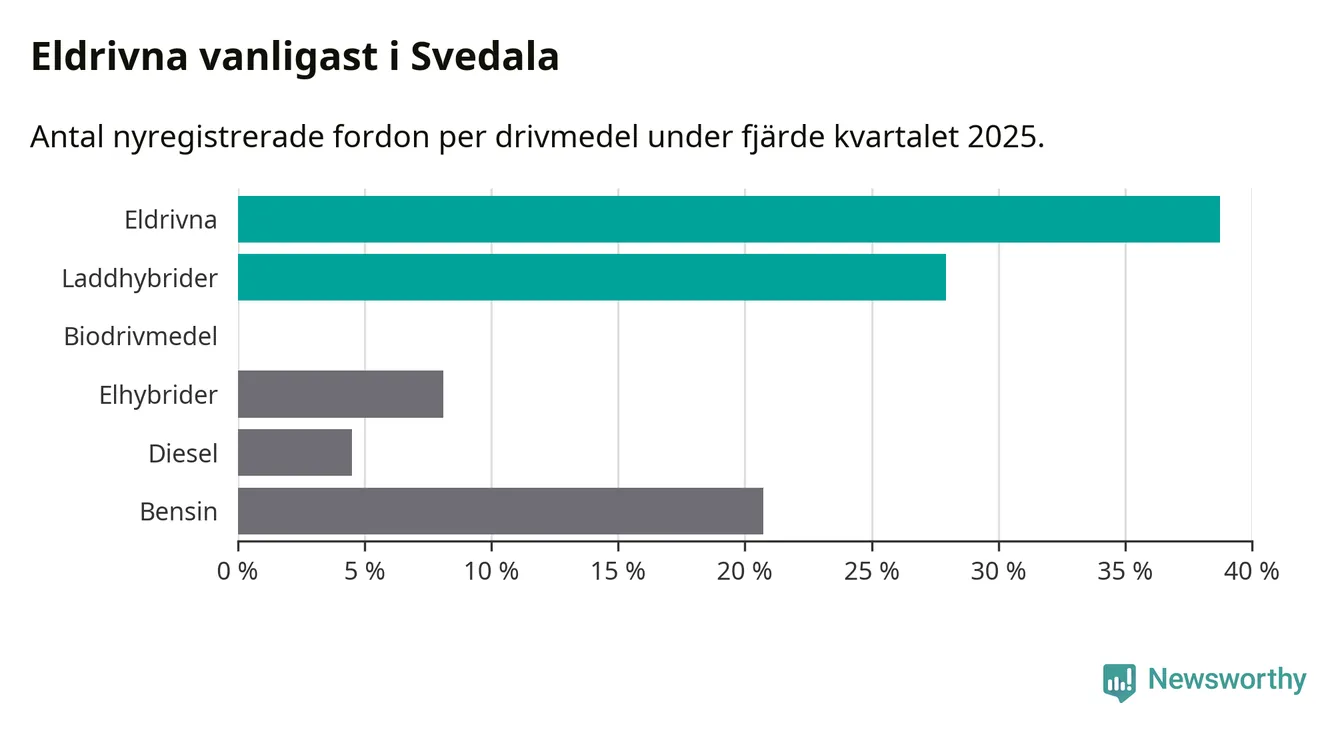 Under fjärde kvartalet 2025 var 67 procent av alla nyregistrerade personbilar i Svedala laddbara (sammanlagt registrerades 111 nya bilar). Merparten av de laddbara bilarna var rena elbilar (39 procent av alla).