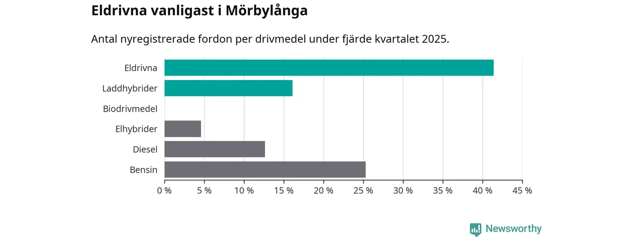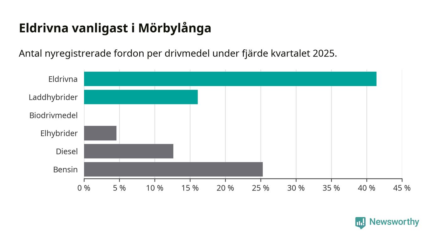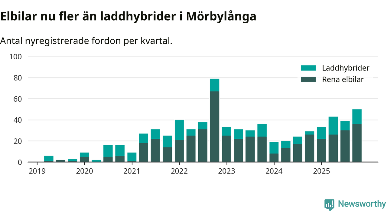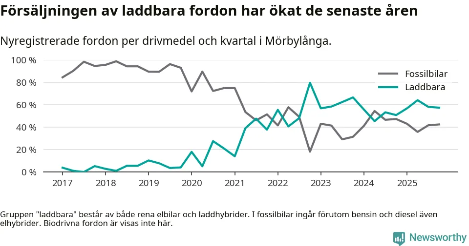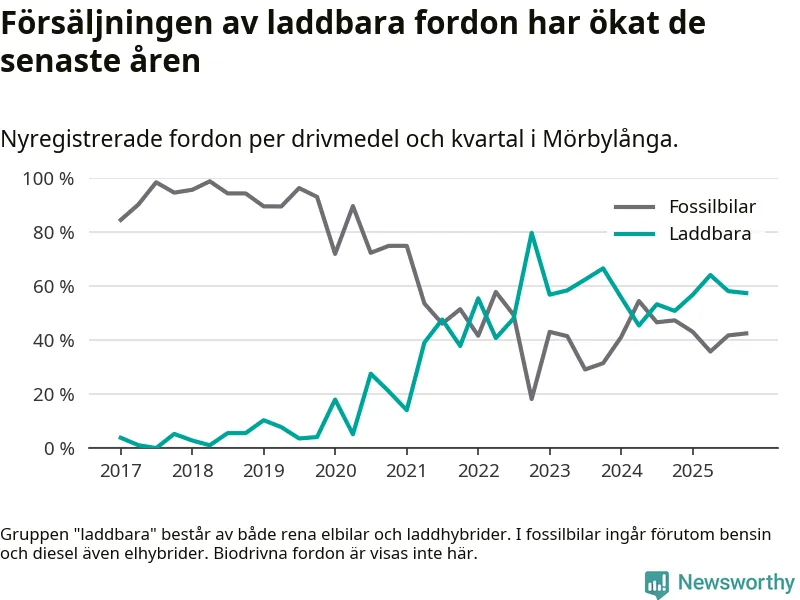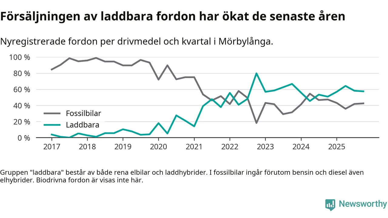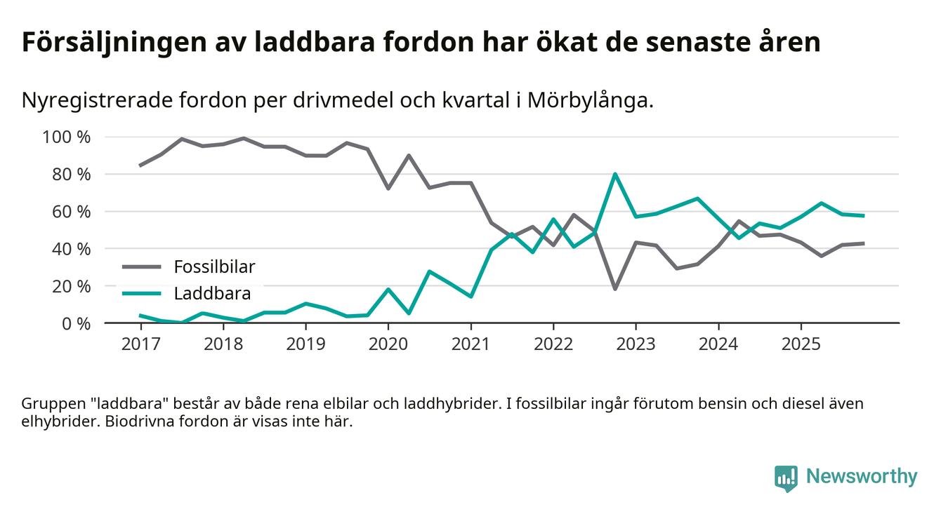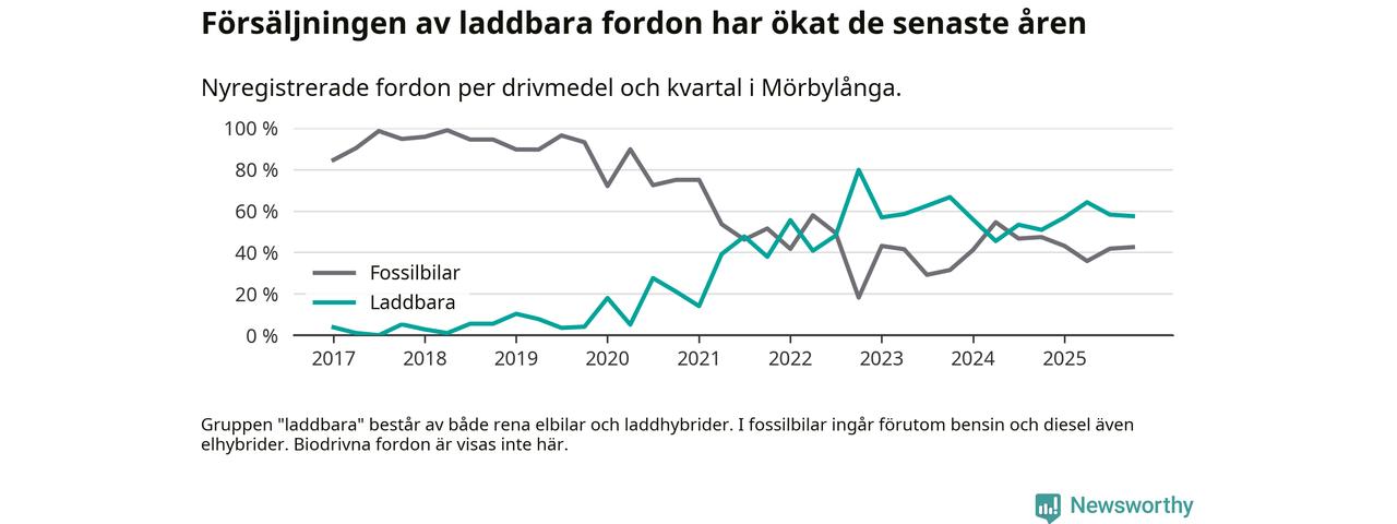 Under fjärde kvartalet 2025 var 57 procent av alla nyregistrerade personbilar i Mörbylånga laddbara (sammanlagt registrerades 87 nya bilar). Merparten av de laddbara bilarna var rena elbilar (41 procent av alla).