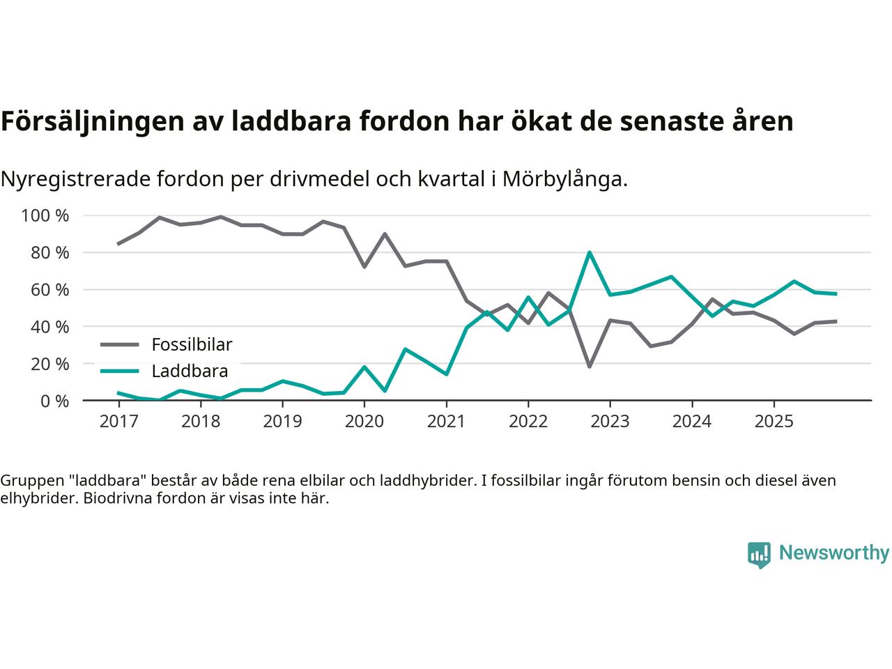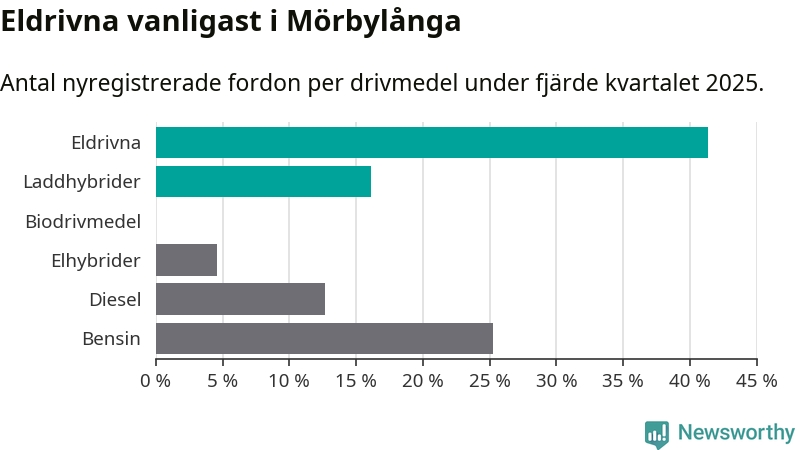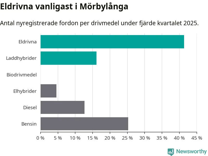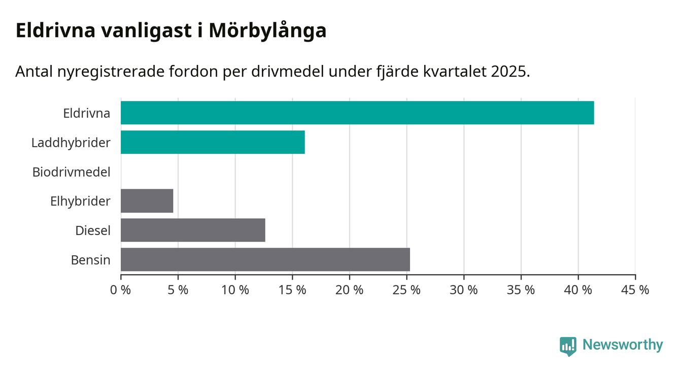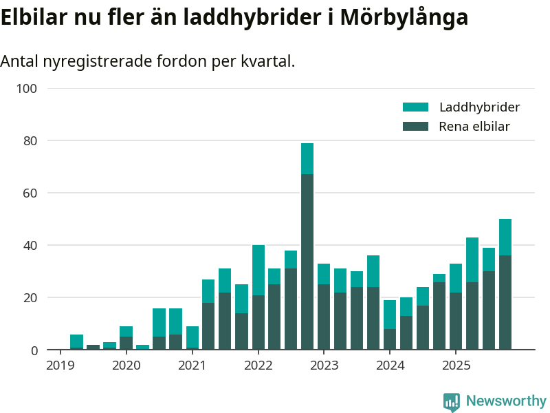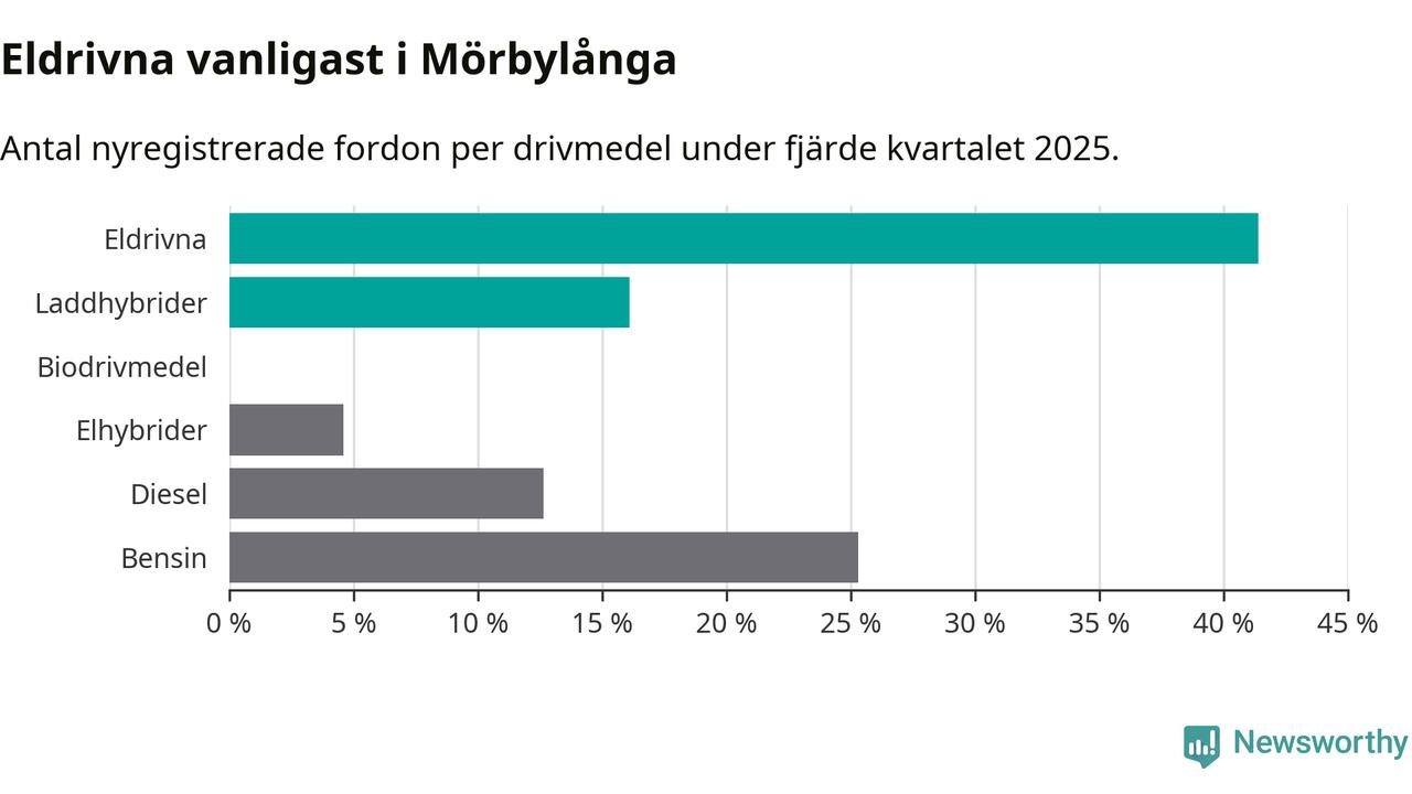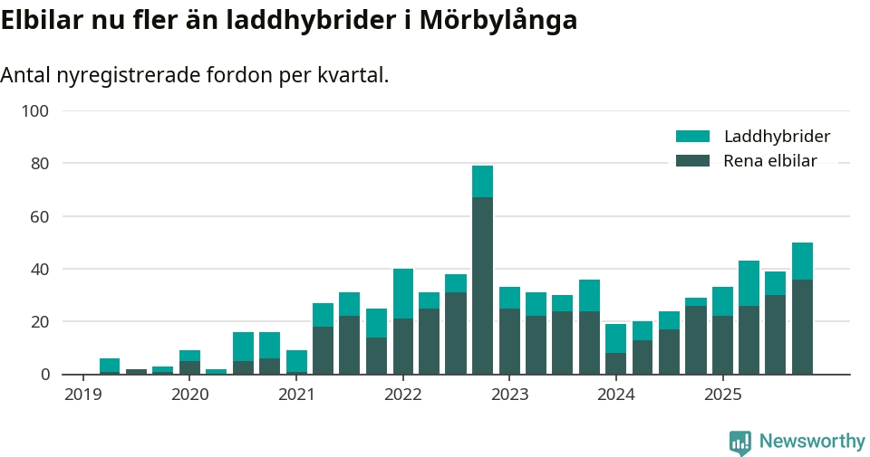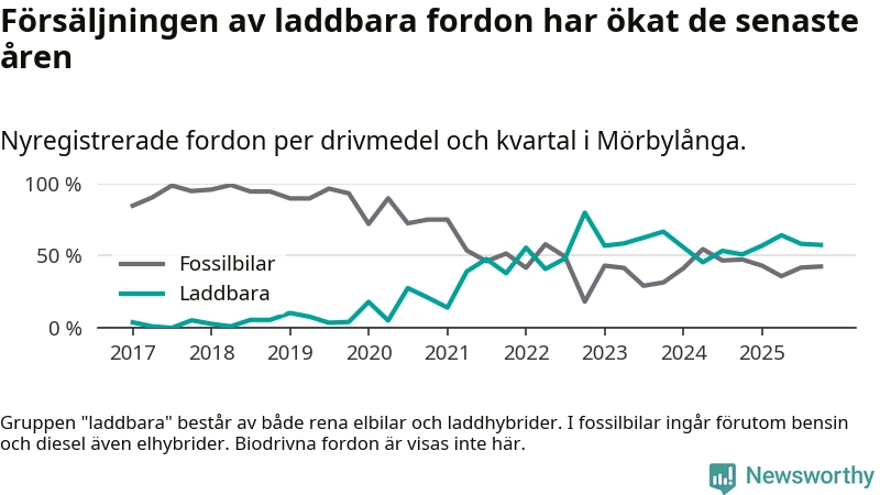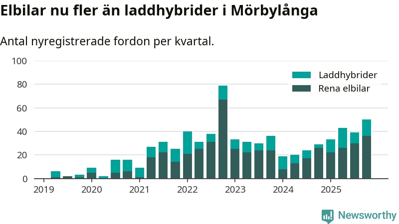 Under fjärde kvartalet 2025 var 57 procent av alla nyregistrerade personbilar i Mörbylånga laddbara (sammanlagt registrerades 87 nya bilar). Merparten av de laddbara bilarna var rena elbilar (41 procent av alla).