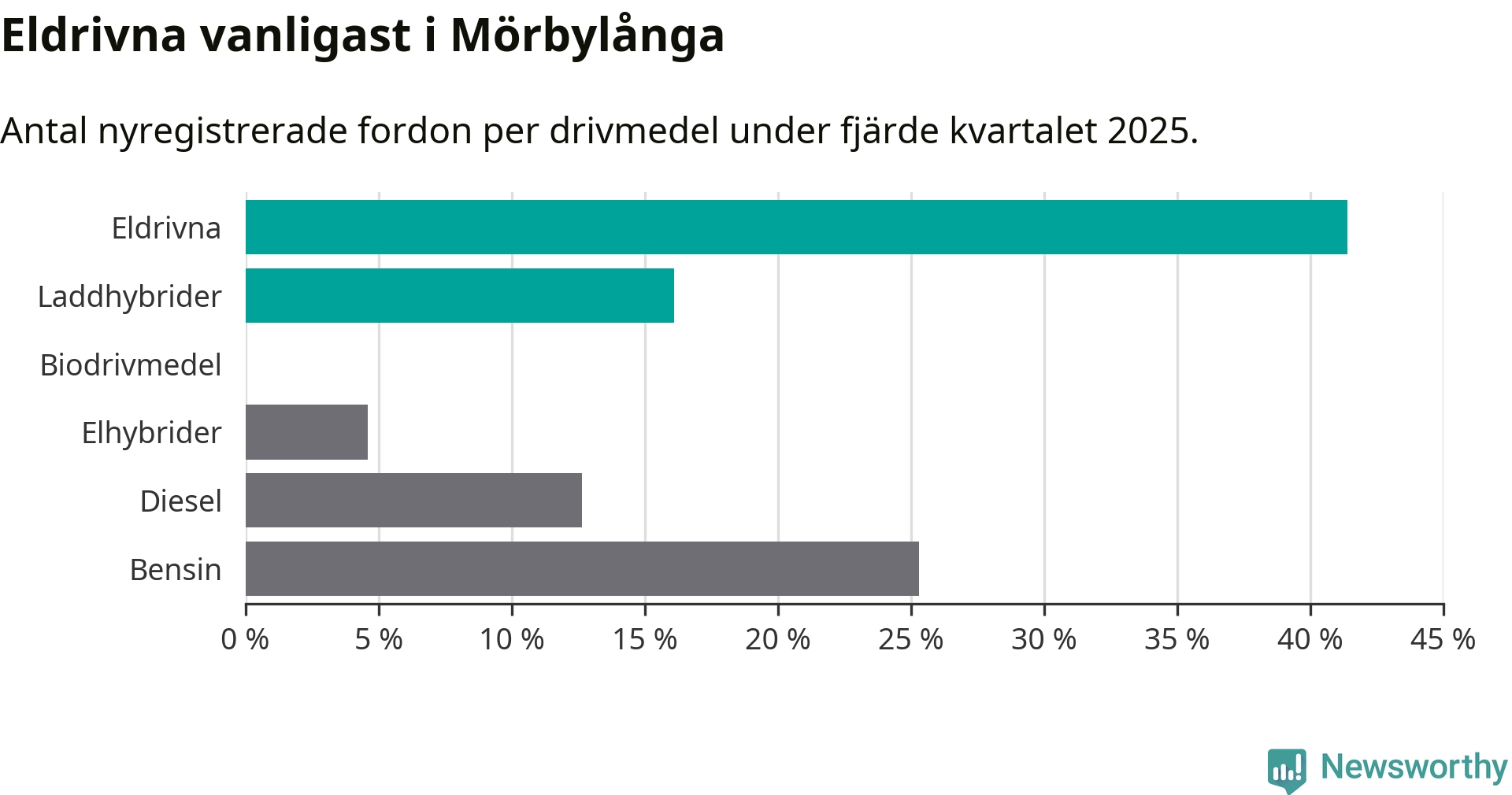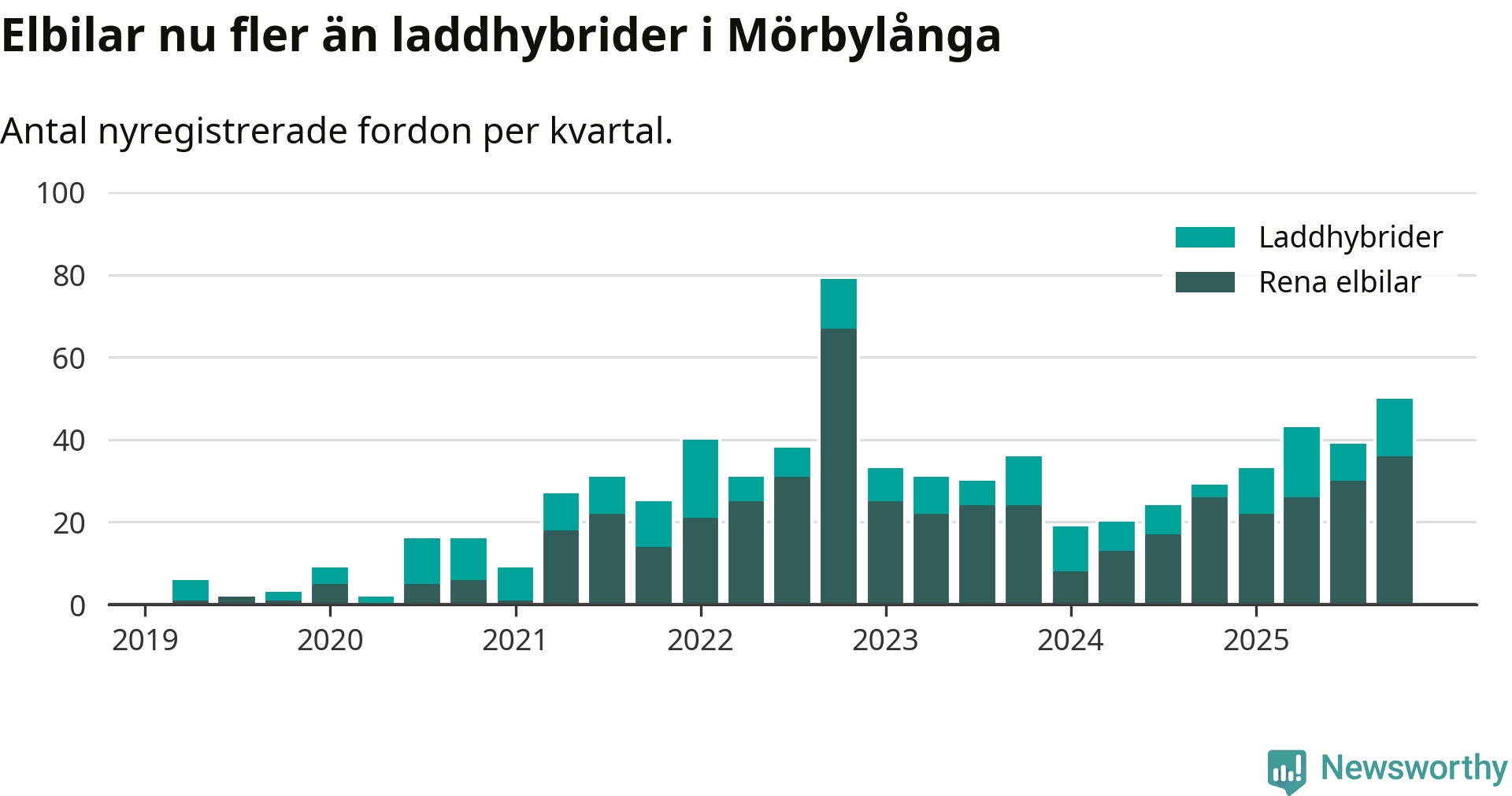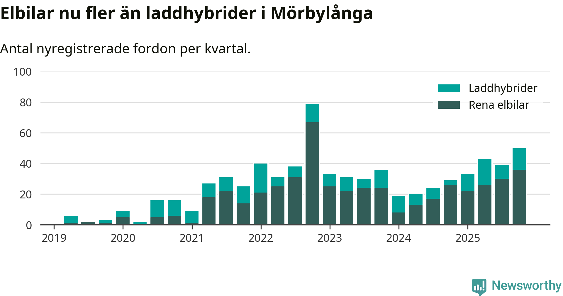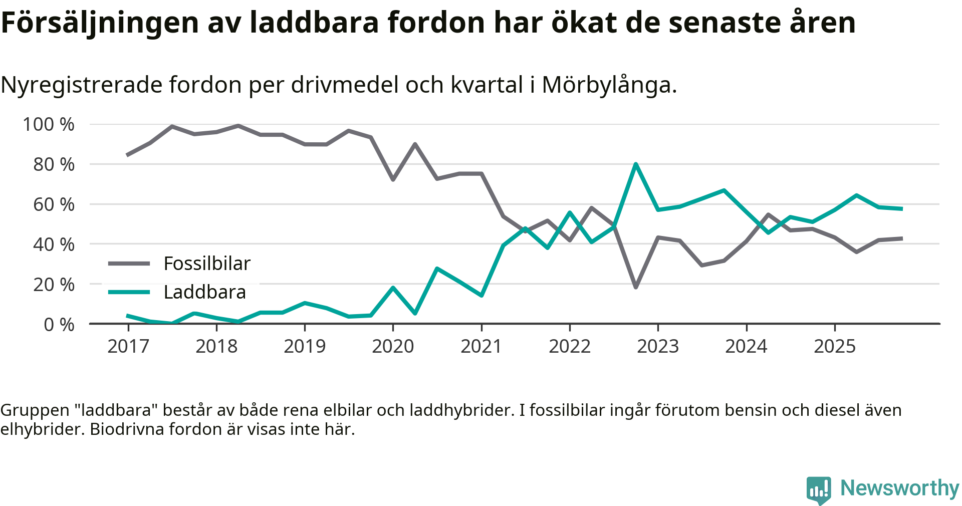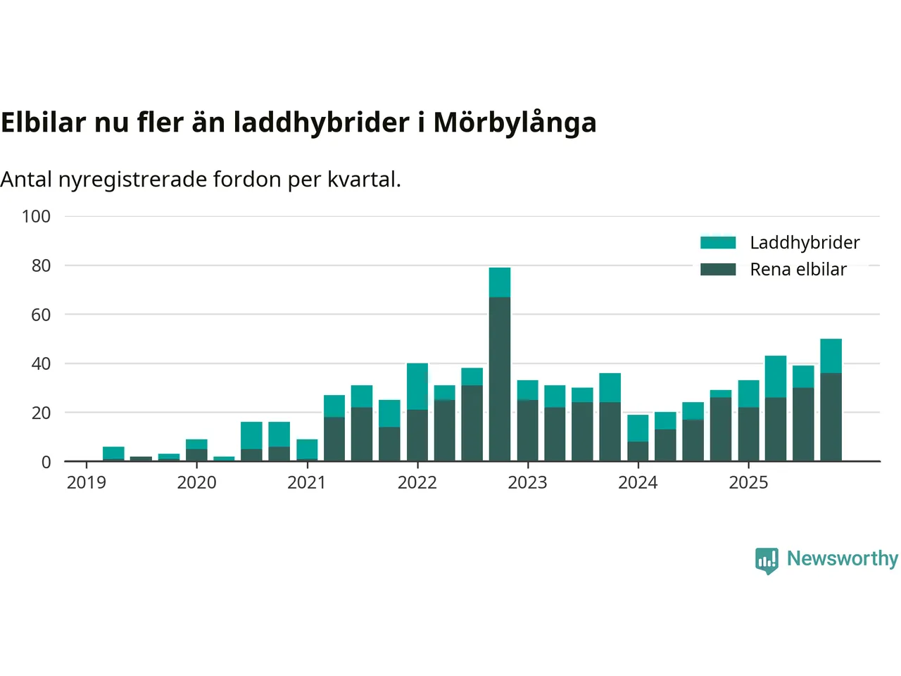 Under fjärde kvartalet 2025 var 57 procent av alla nyregistrerade personbilar i Mörbylånga laddbara (sammanlagt registrerades 87 nya bilar). Merparten av de laddbara bilarna var rena elbilar (41 procent av alla).