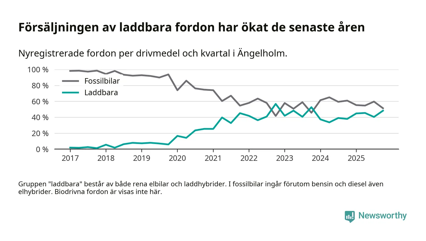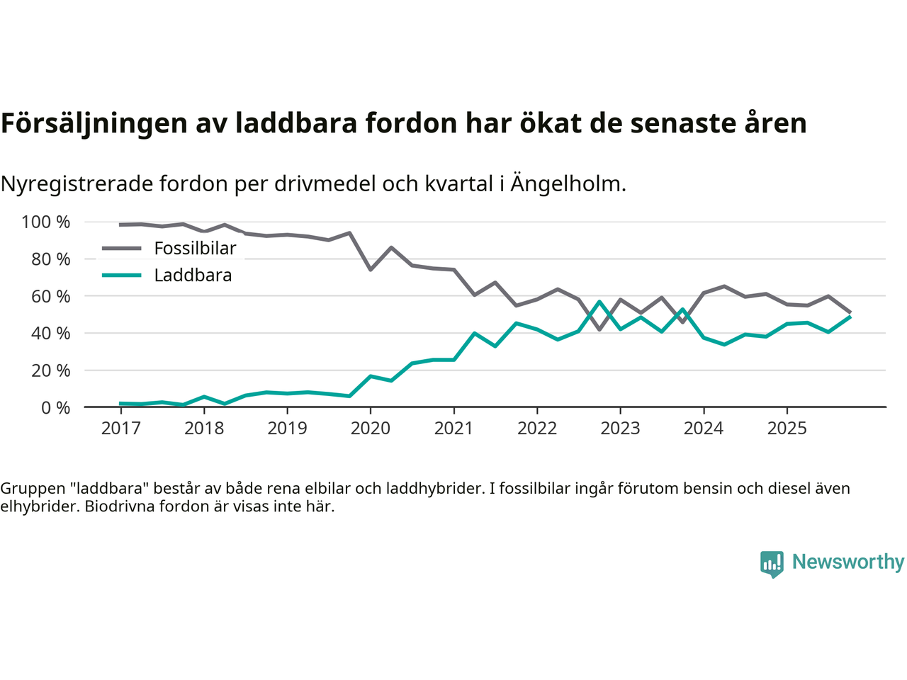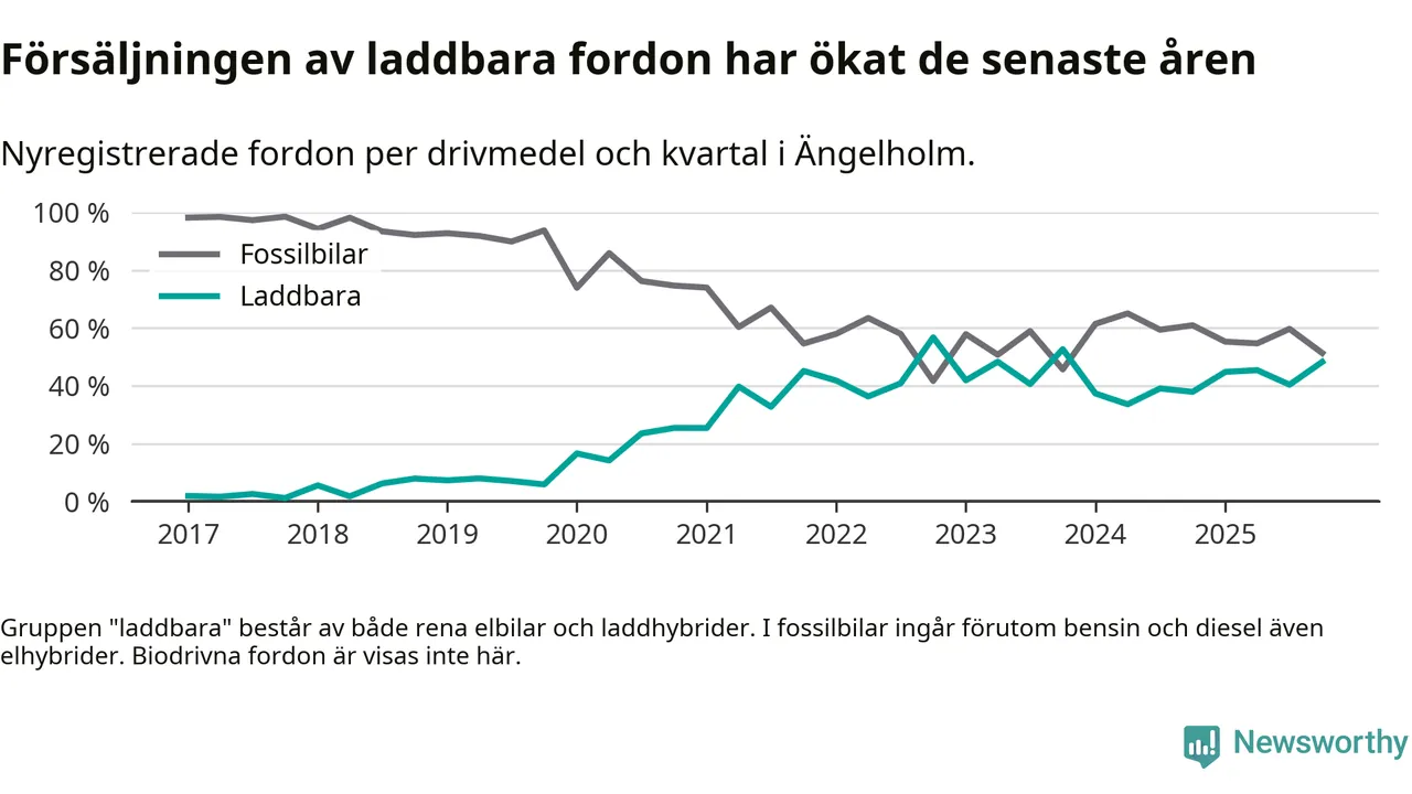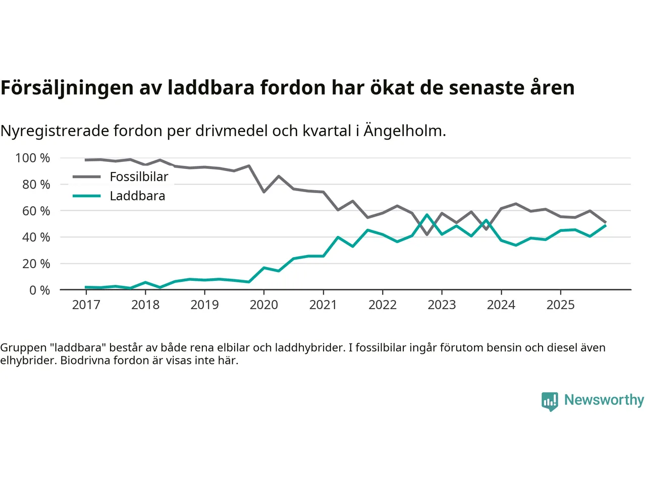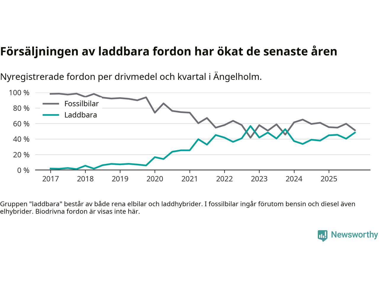 Under fjärde kvartalet 2025 var 48 procent av alla nyregistrerade personbilar i Ängelholm laddbara (sammanlagt registrerades 423 nya bilar). Merparten av de laddbara bilarna var rena elbilar (29 procent av alla).