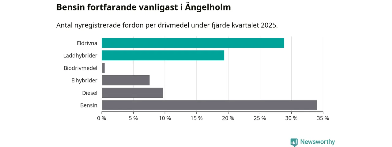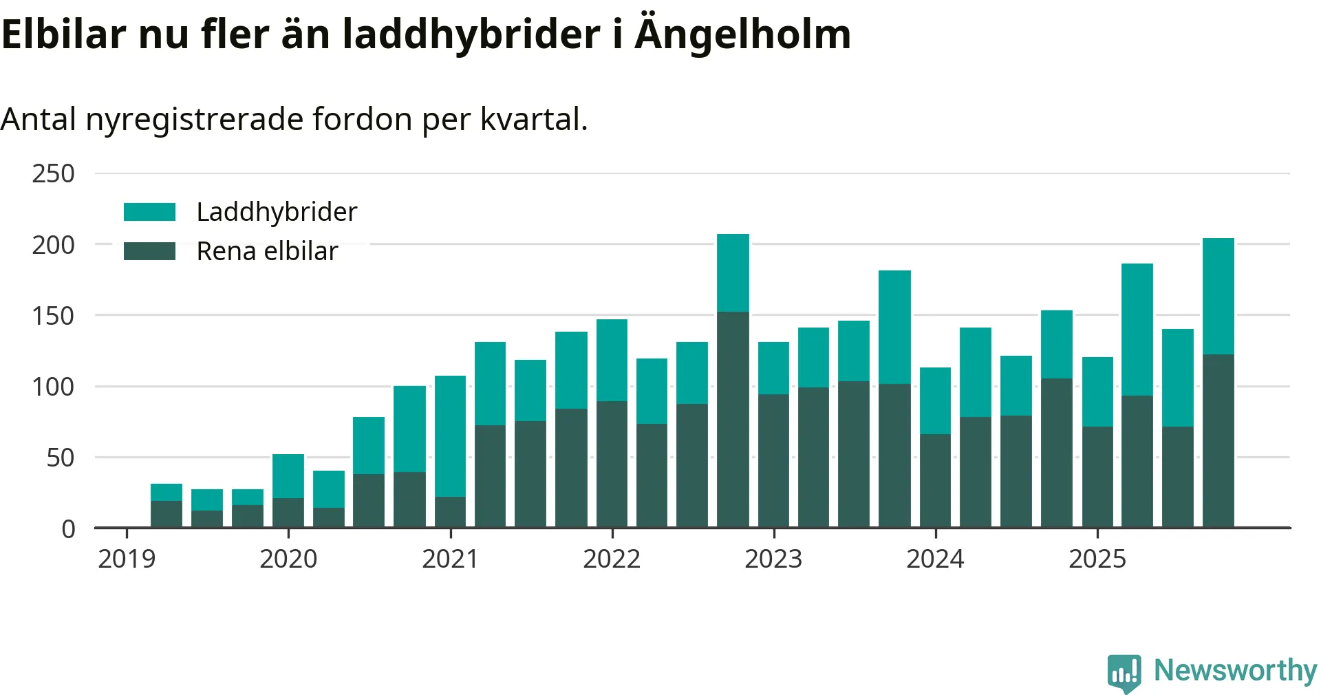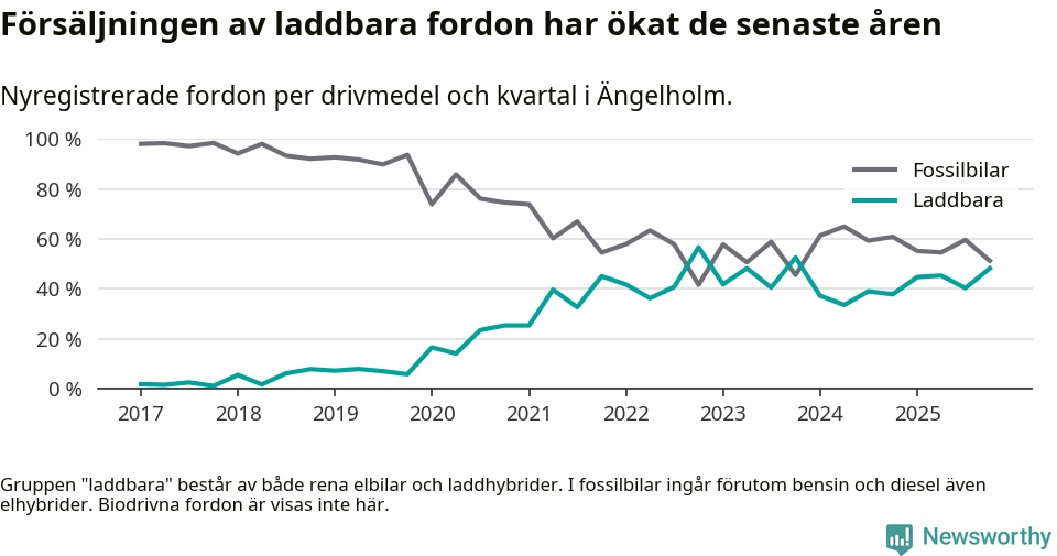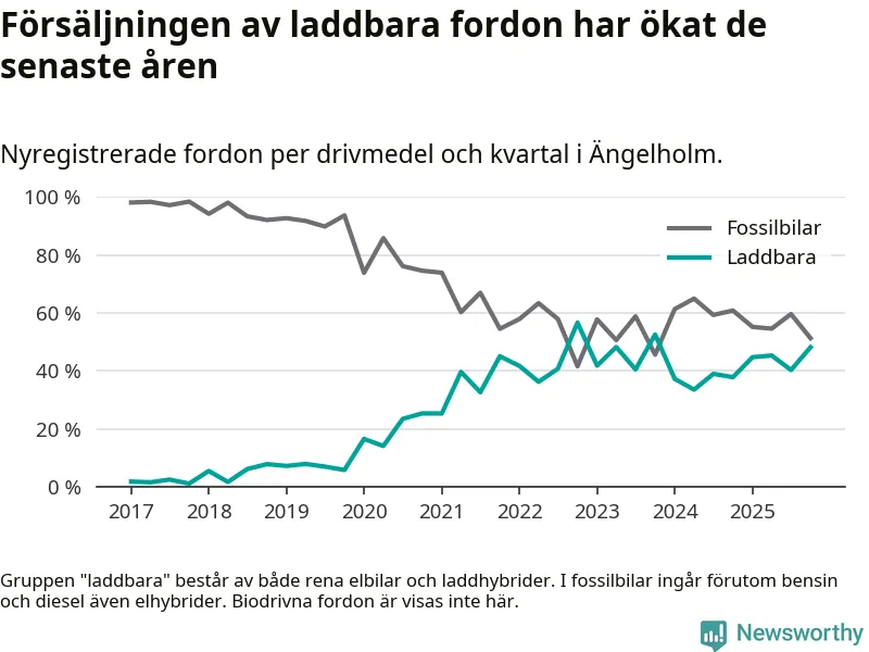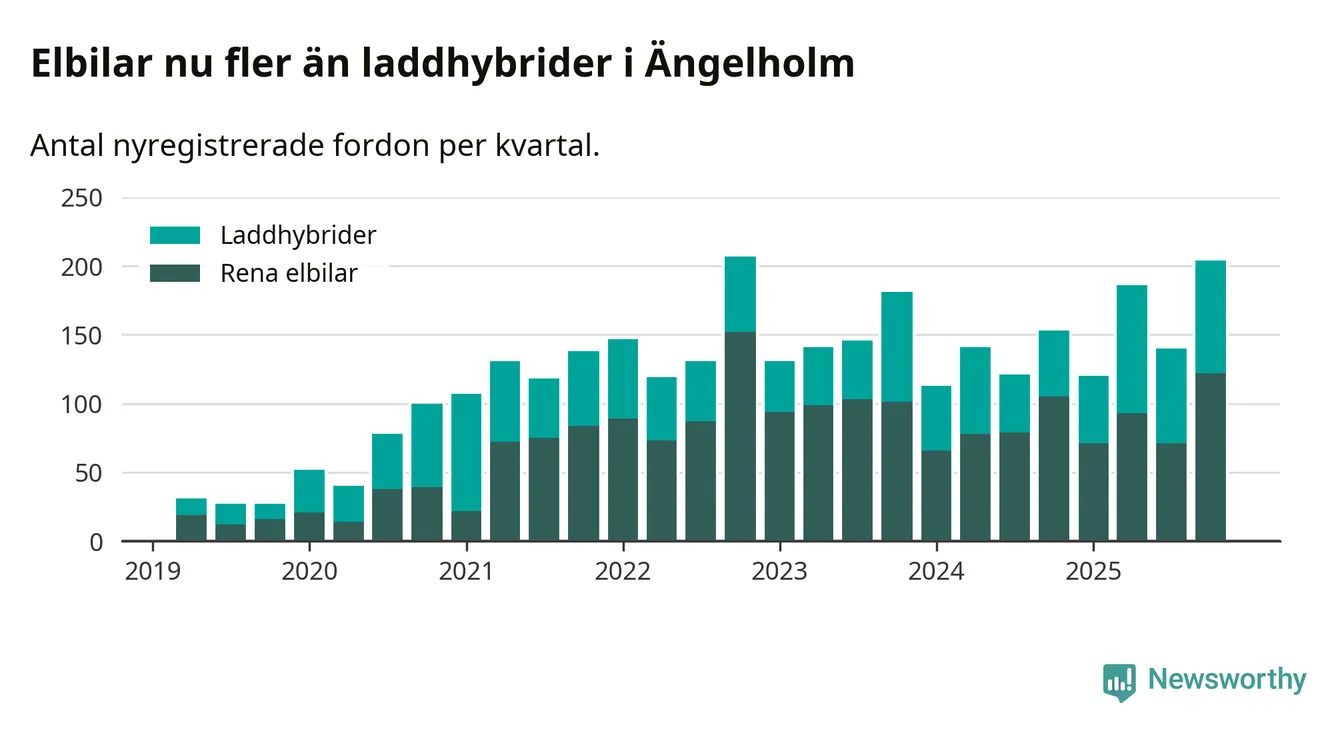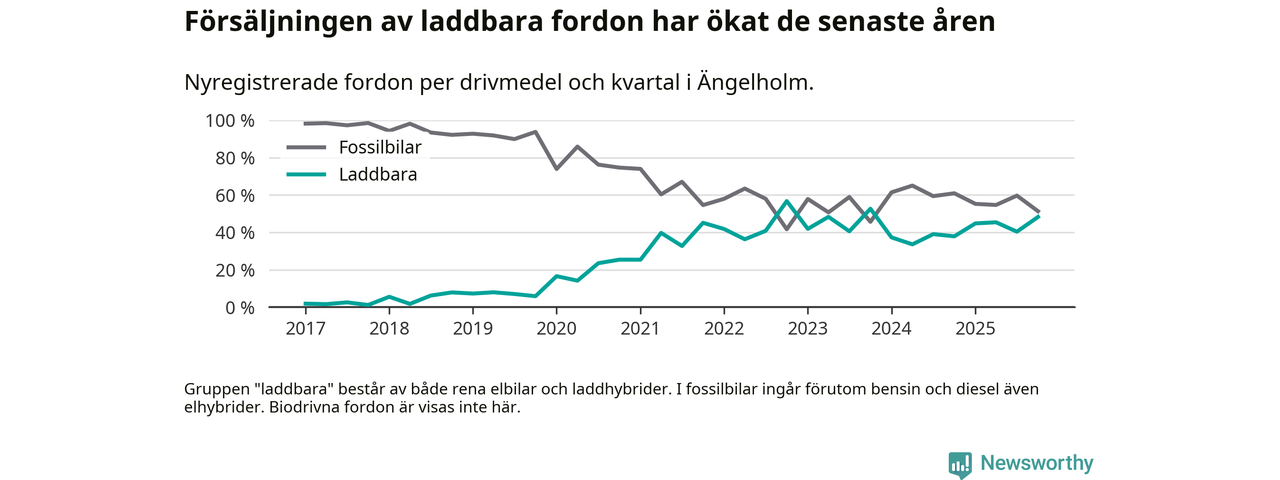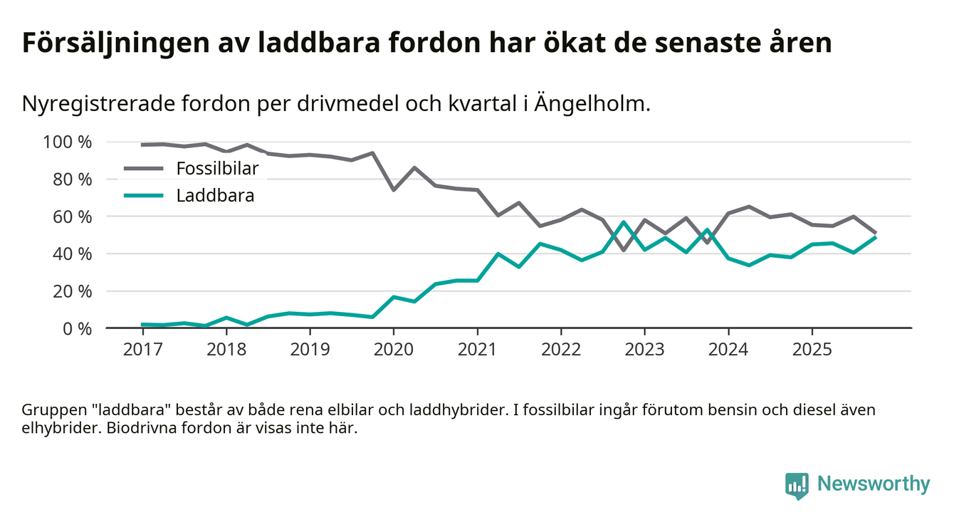 Under fjärde kvartalet 2025 var 48 procent av alla nyregistrerade personbilar i Ängelholm laddbara (sammanlagt registrerades 423 nya bilar). Merparten av de laddbara bilarna var rena elbilar (29 procent av alla).