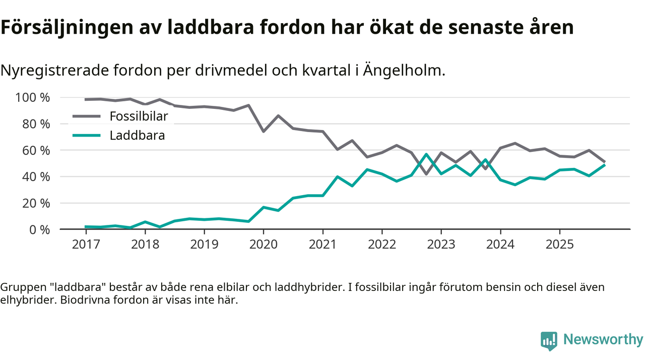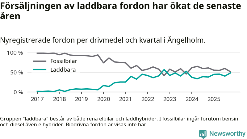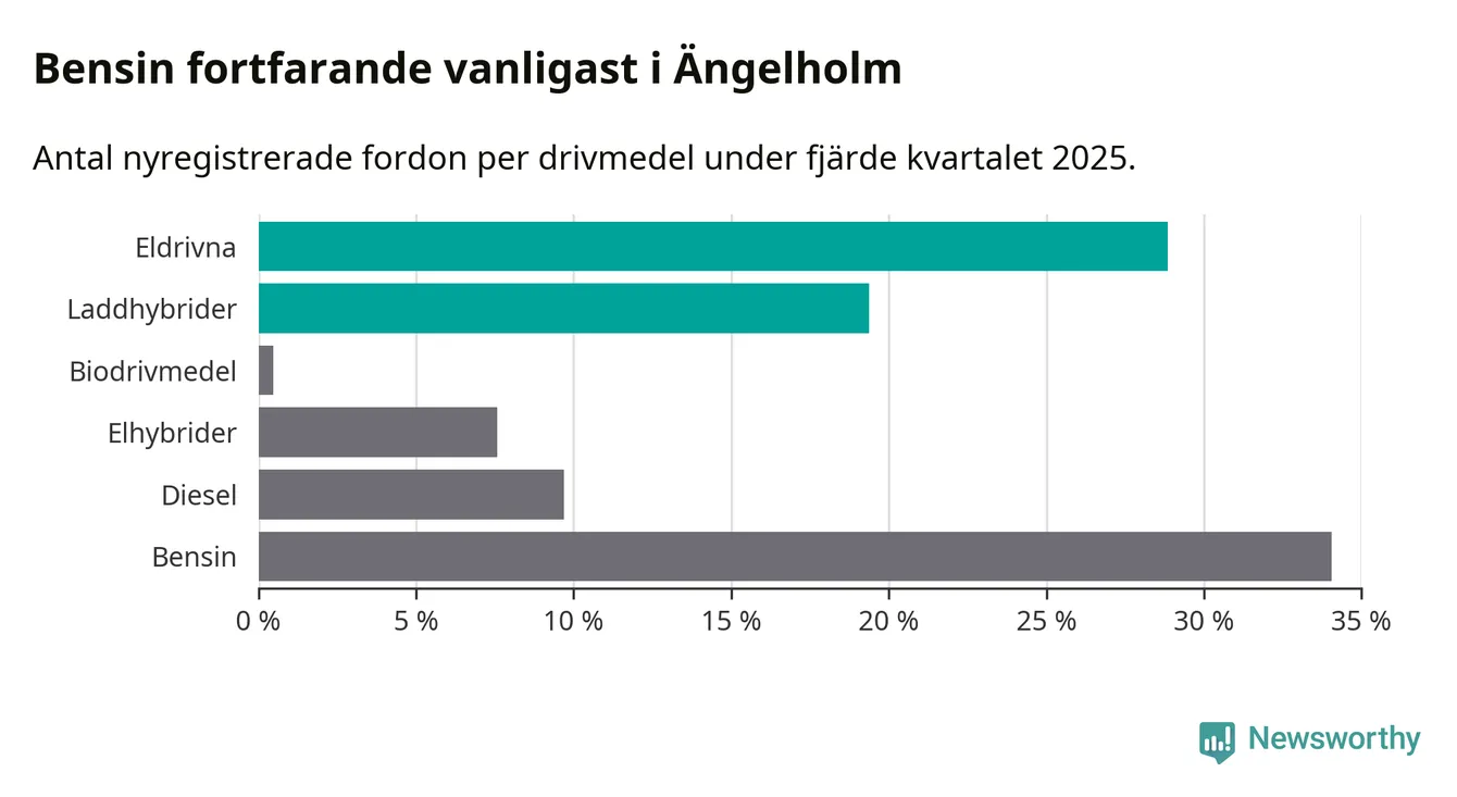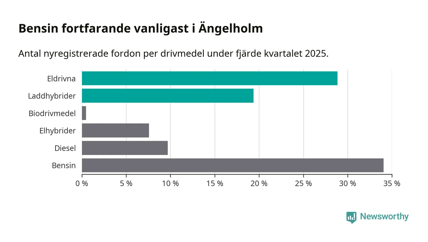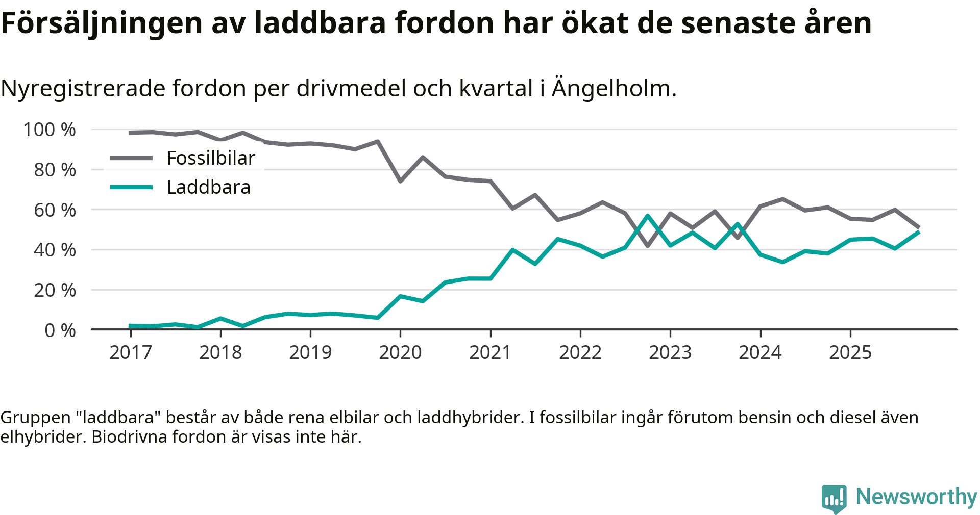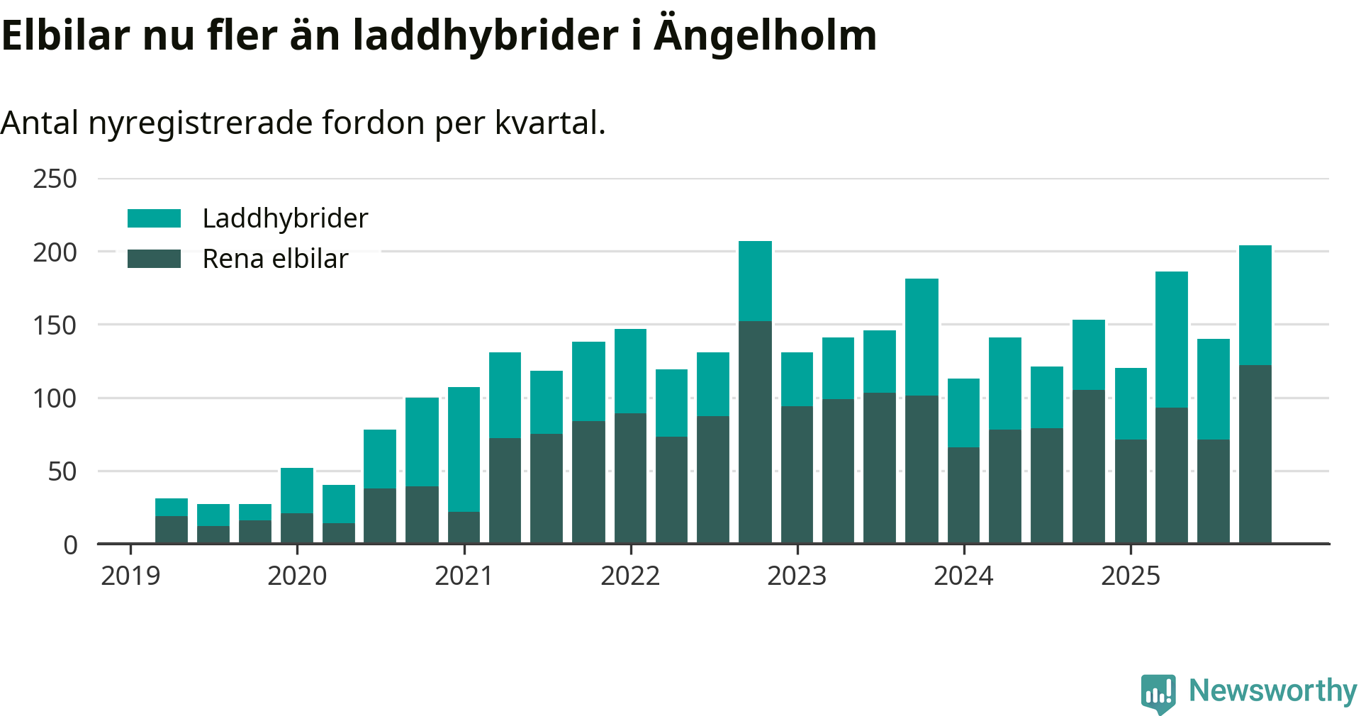 Under fjärde kvartalet 2025 var 48 procent av alla nyregistrerade personbilar i Ängelholm laddbara (sammanlagt registrerades 423 nya bilar). Merparten av de laddbara bilarna var rena elbilar (29 procent av alla).