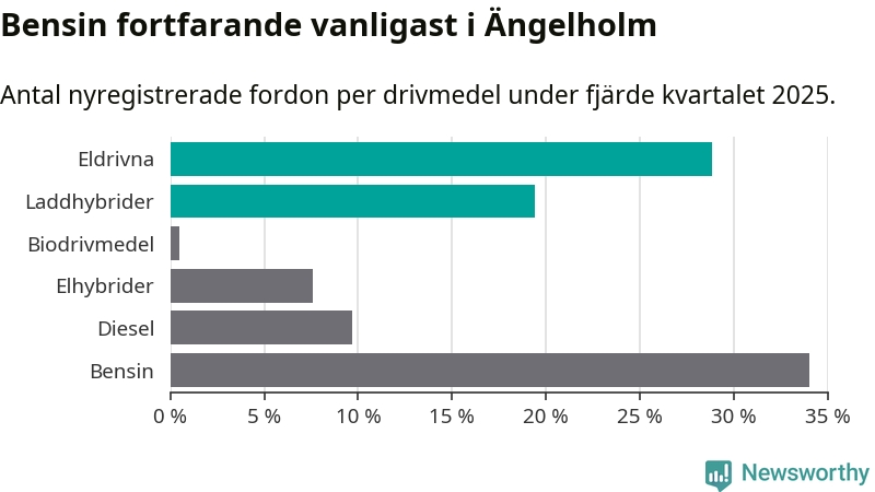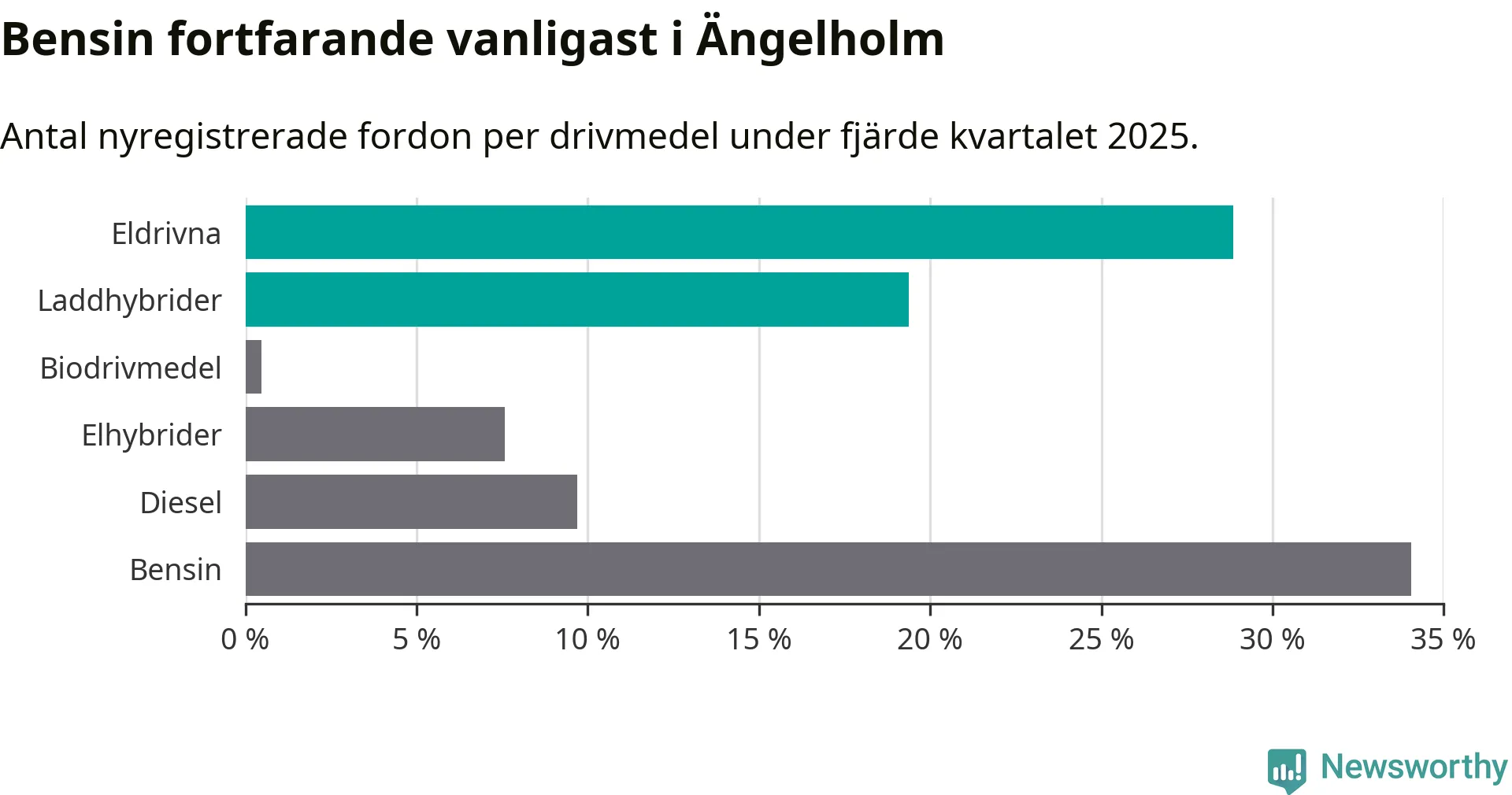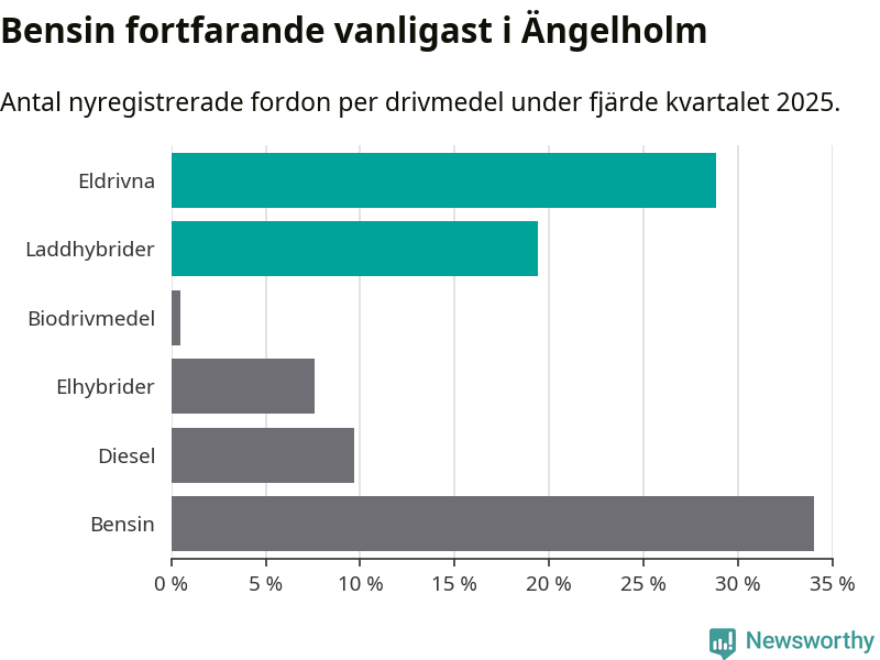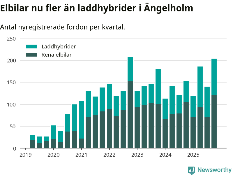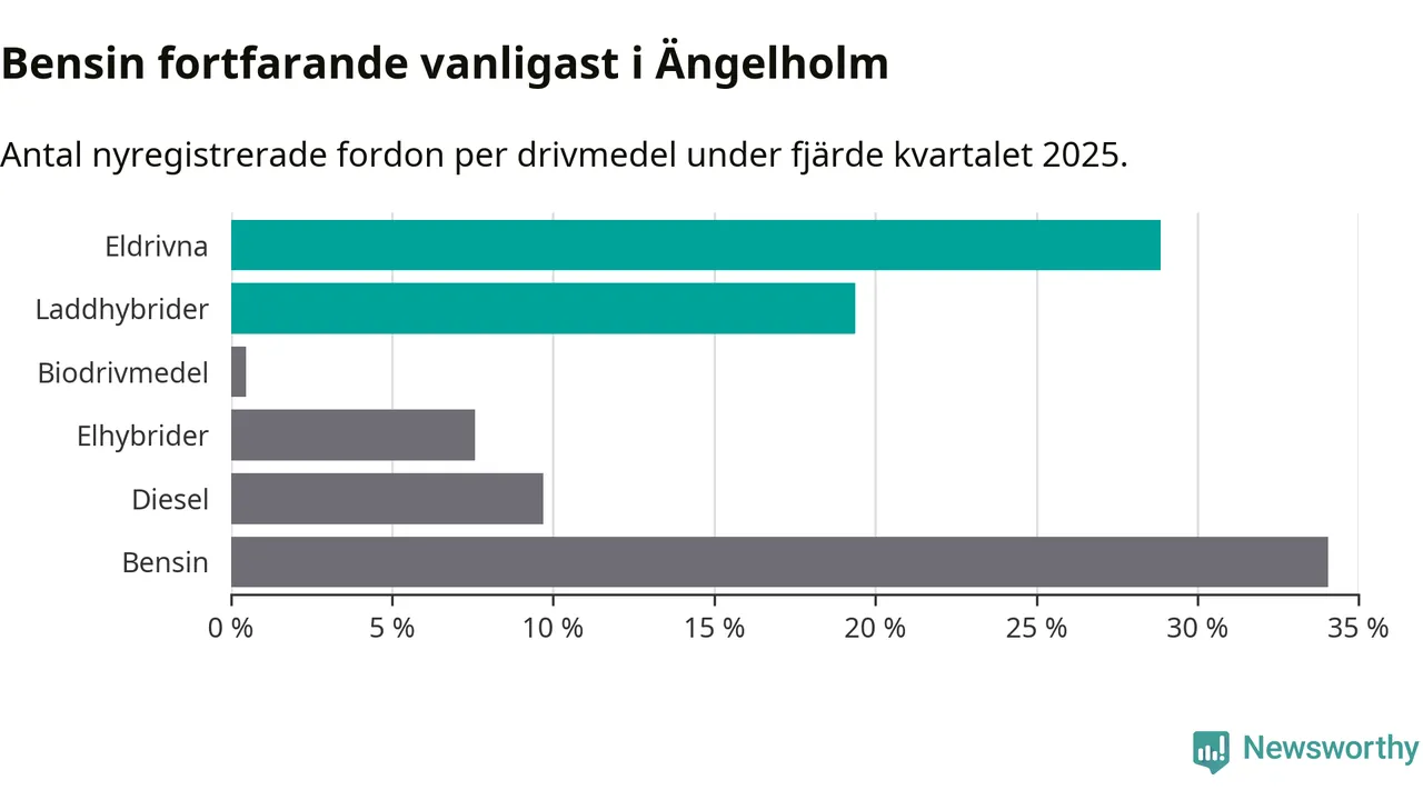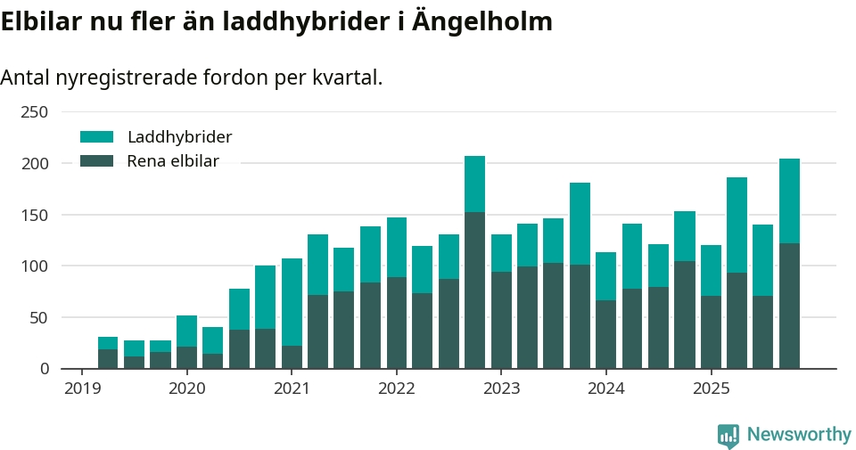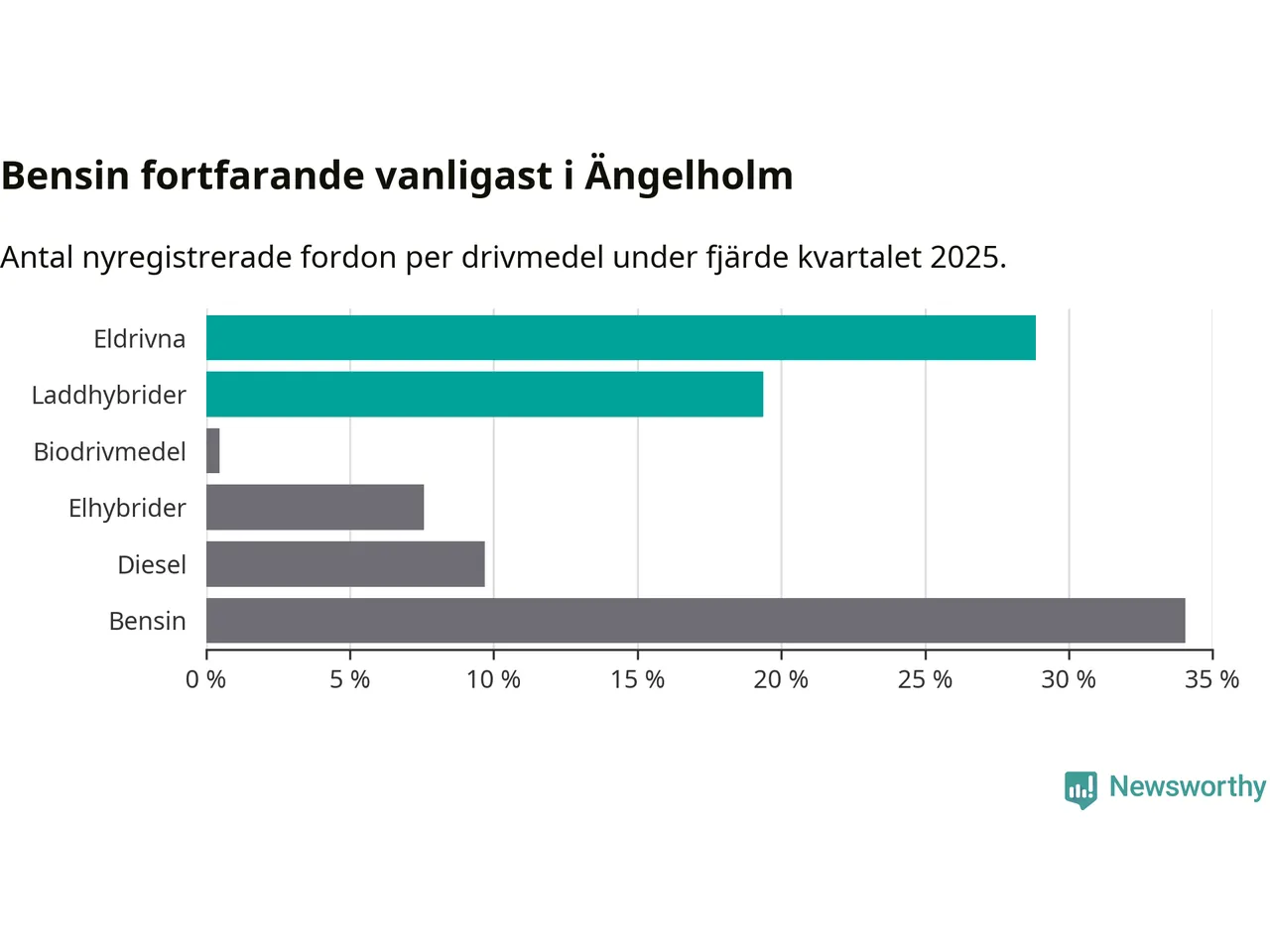 Under fjärde kvartalet 2025 var 48 procent av alla nyregistrerade personbilar i Ängelholm laddbara (sammanlagt registrerades 423 nya bilar). Merparten av de laddbara bilarna var rena elbilar (29 procent av alla).