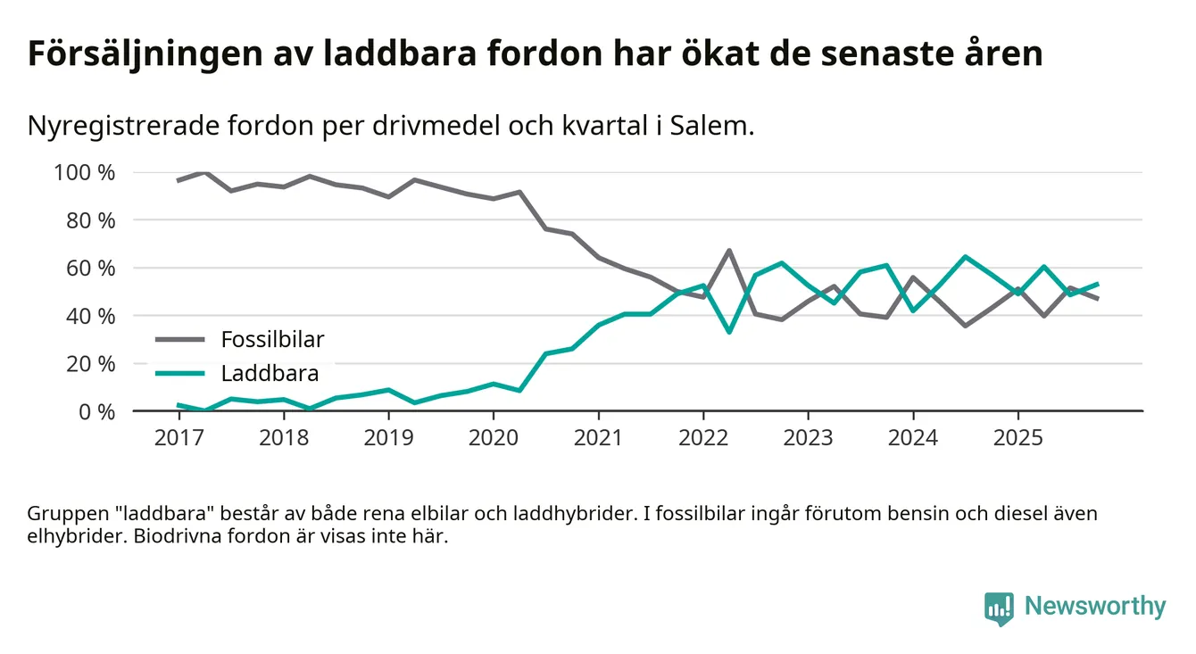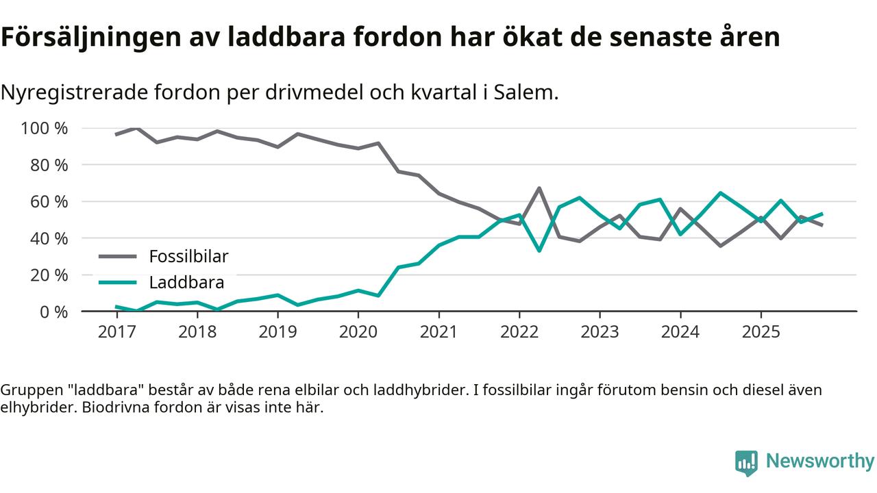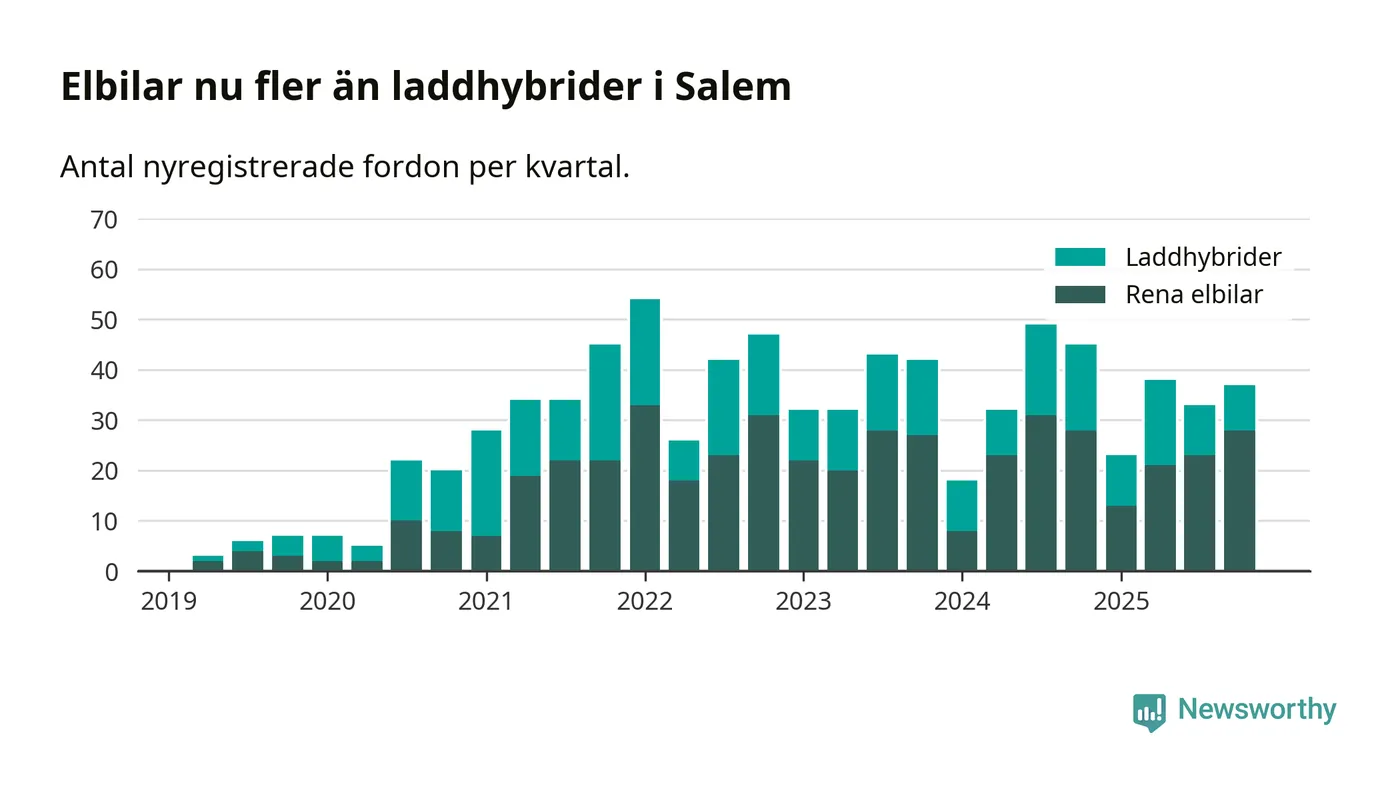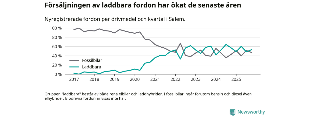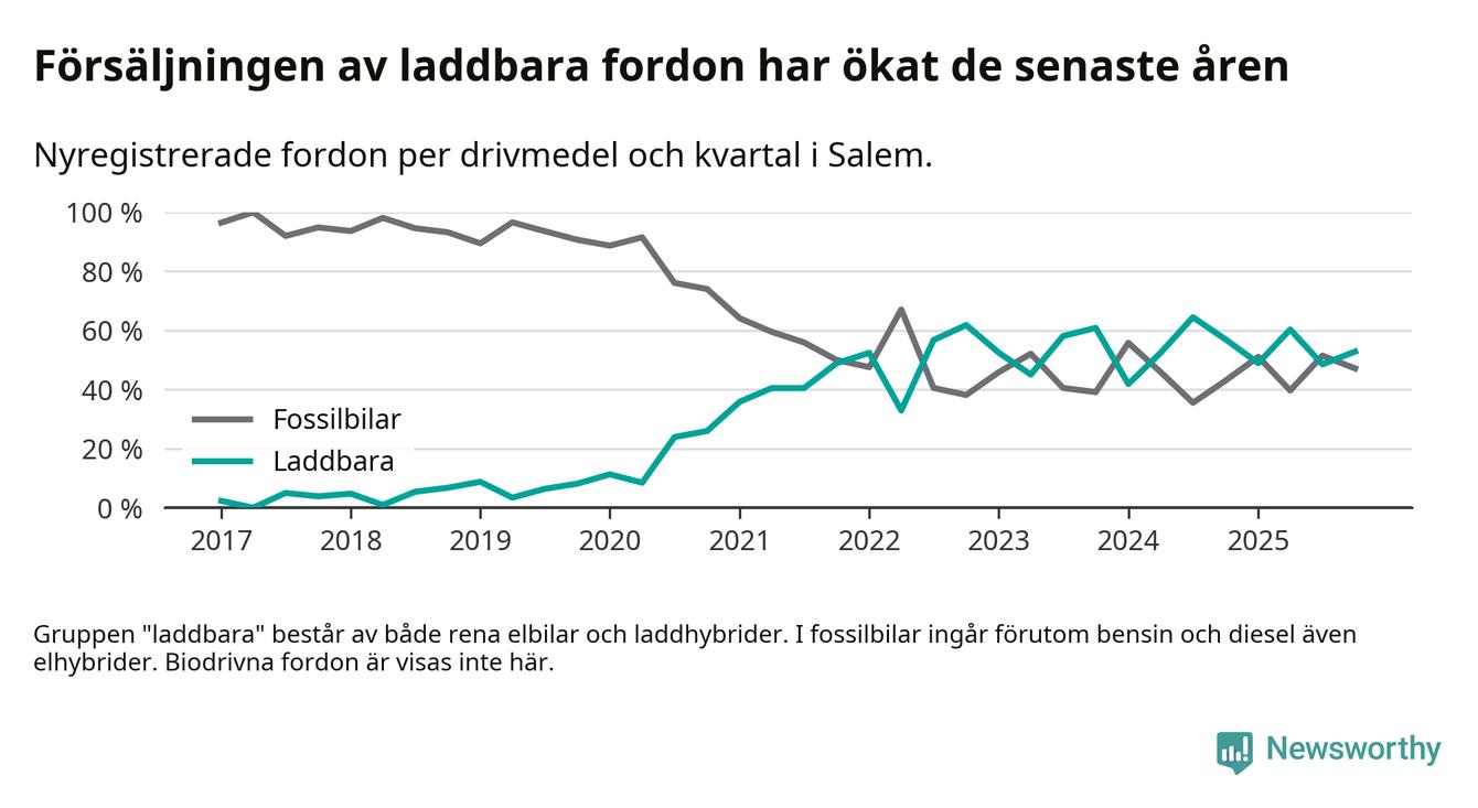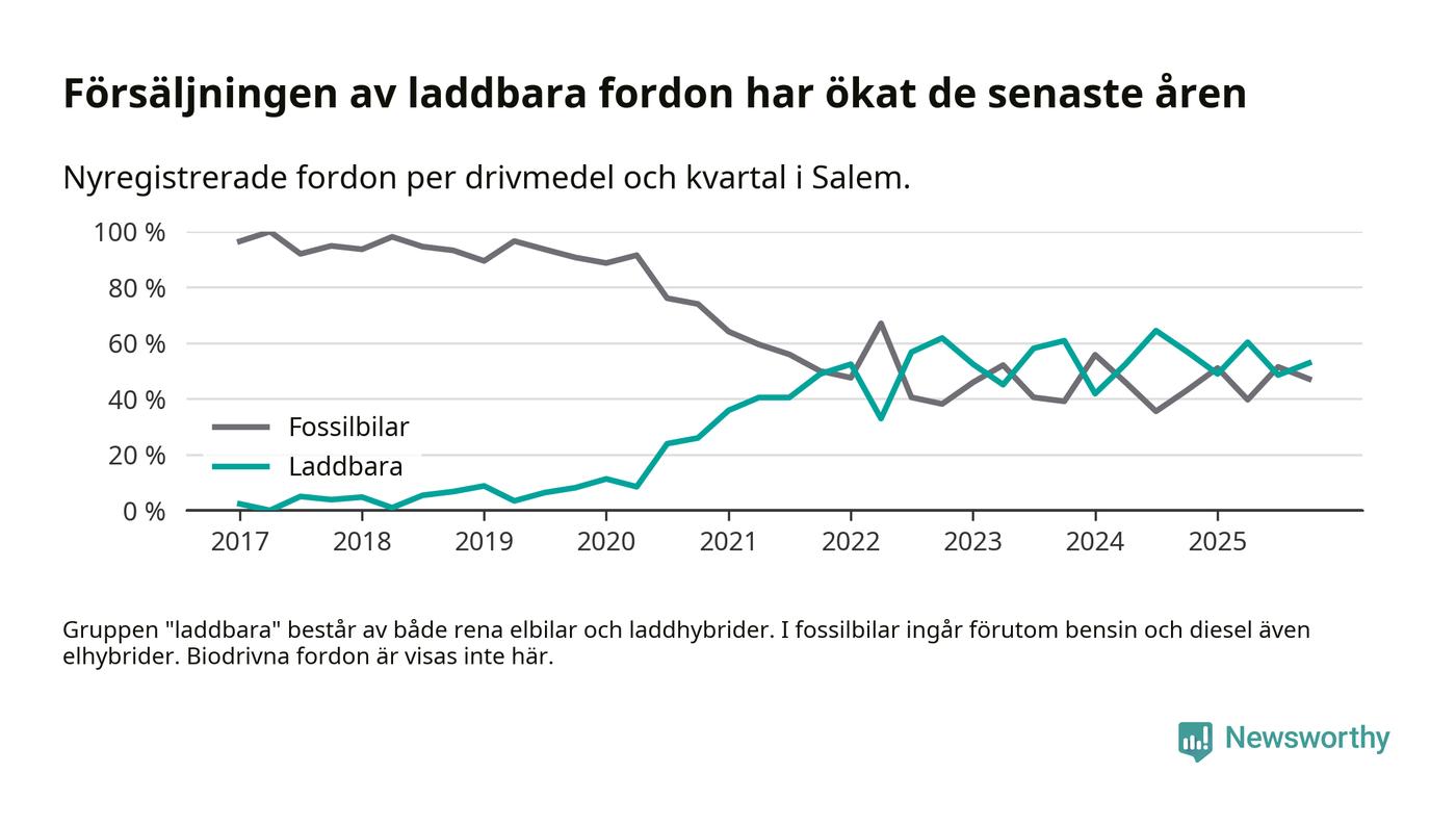 Under fjärde kvartalet 2025 var 53 procent av alla nyregistrerade personbilar i Salem laddbara (sammanlagt registrerades 70 nya bilar). Merparten av de laddbara bilarna var rena elbilar (40 procent av alla).