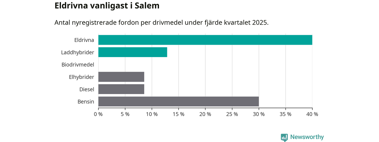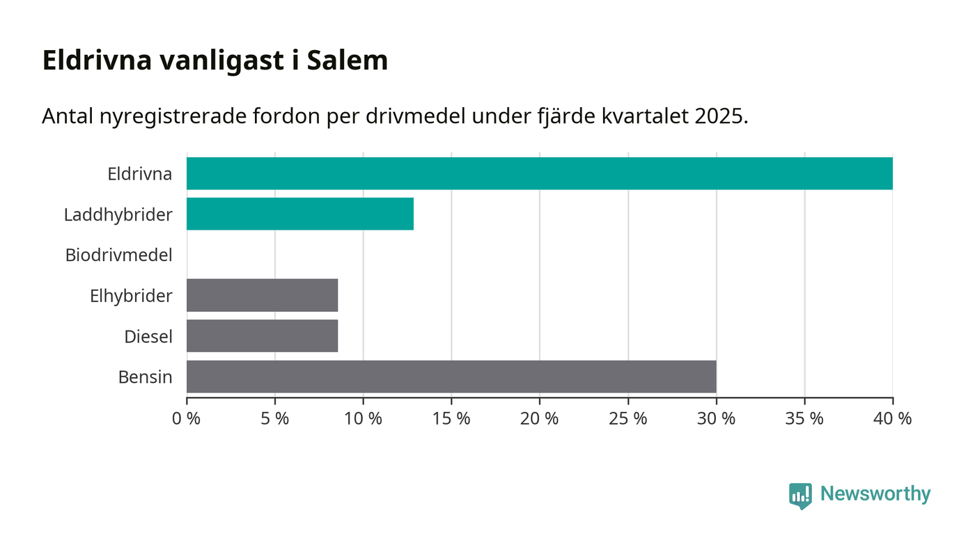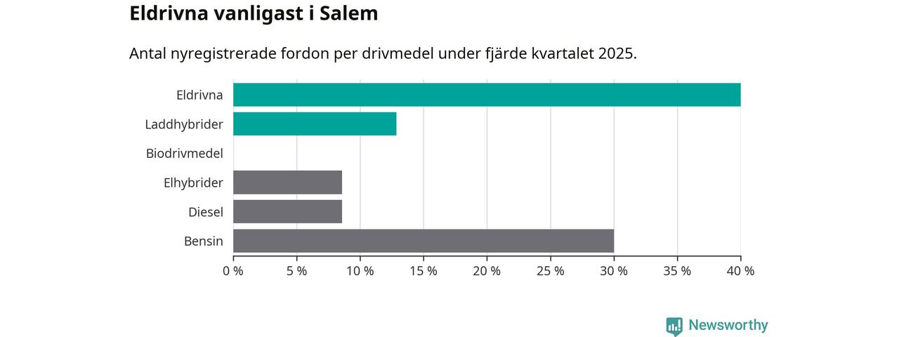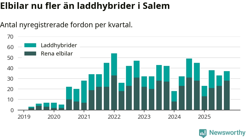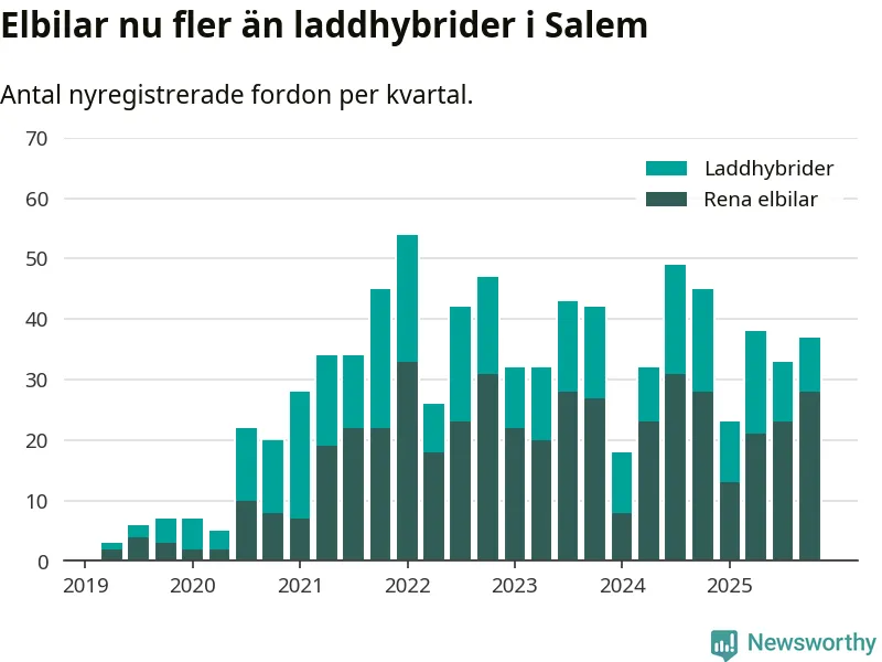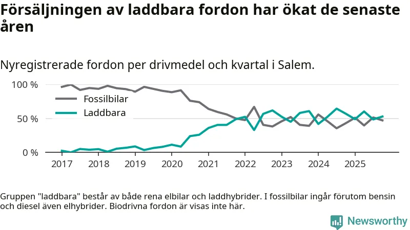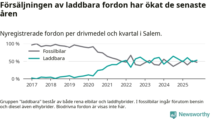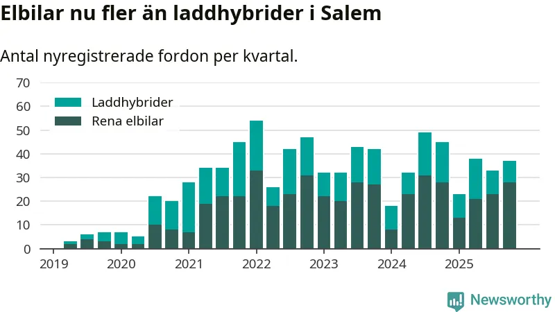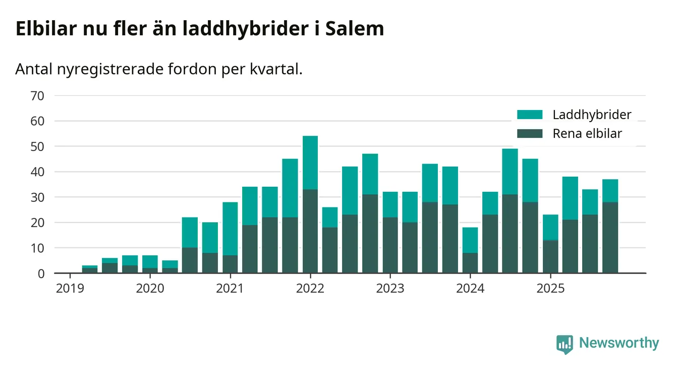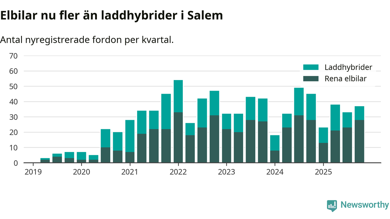 Under fjärde kvartalet 2025 var 53 procent av alla nyregistrerade personbilar i Salem laddbara (sammanlagt registrerades 70 nya bilar). Merparten av de laddbara bilarna var rena elbilar (40 procent av alla).