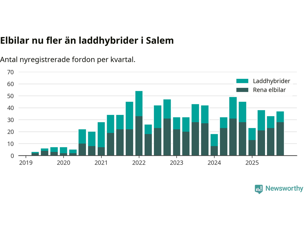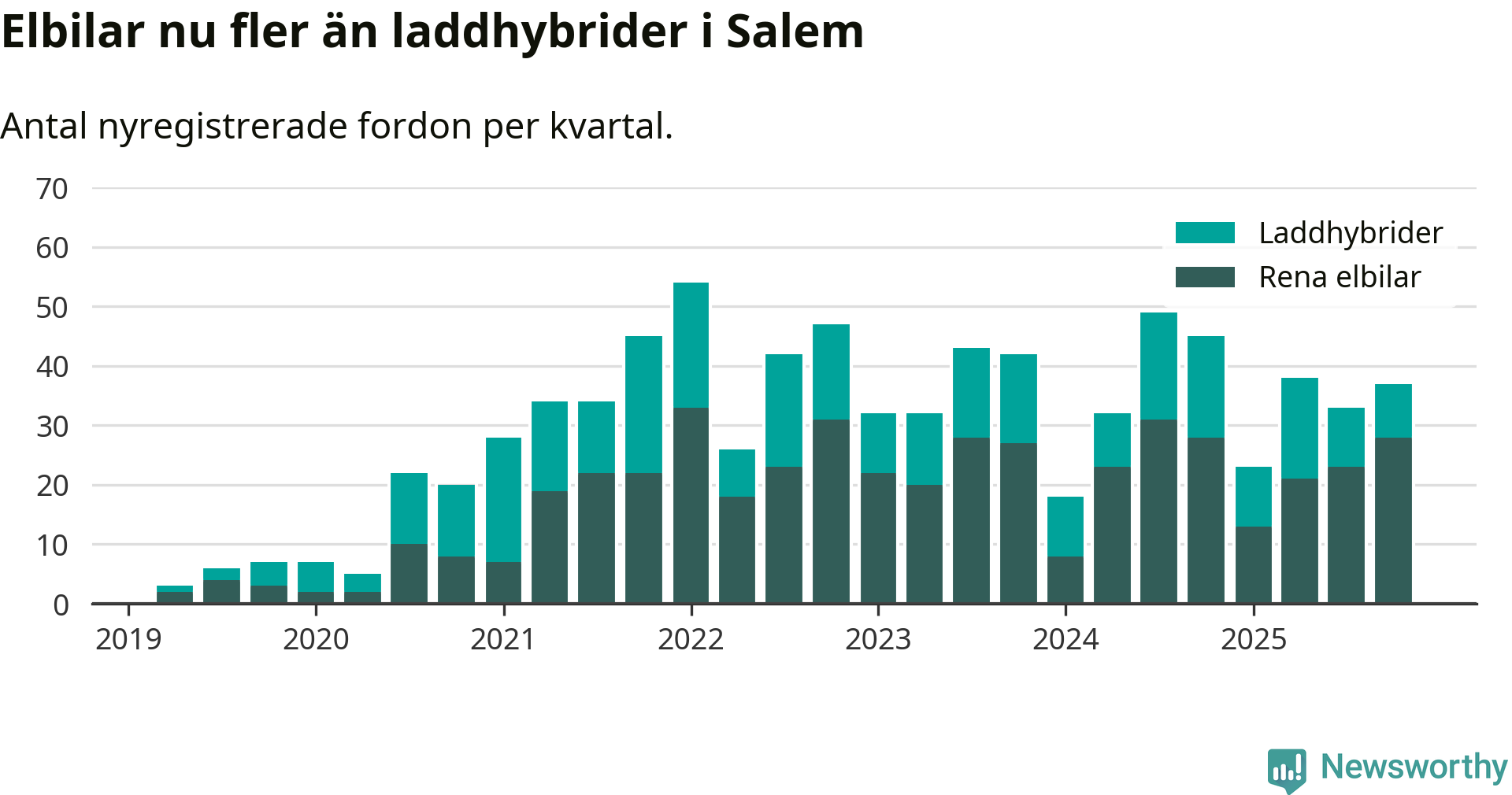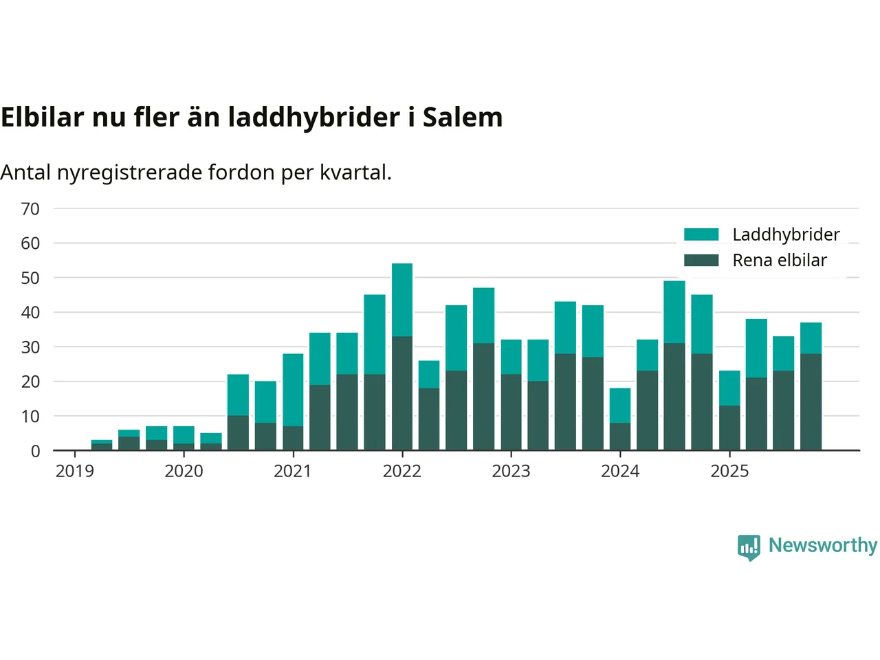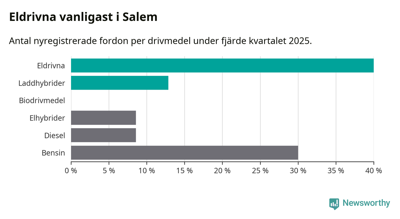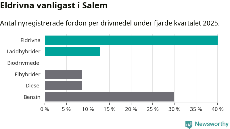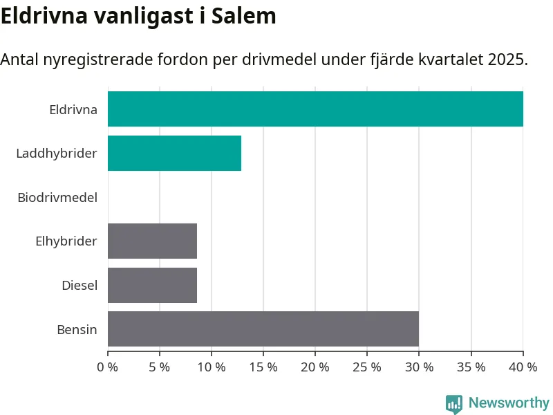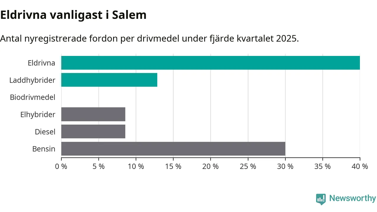 Under fjärde kvartalet 2025 var 53 procent av alla nyregistrerade personbilar i Salem laddbara (sammanlagt registrerades 70 nya bilar). Merparten av de laddbara bilarna var rena elbilar (40 procent av alla).
