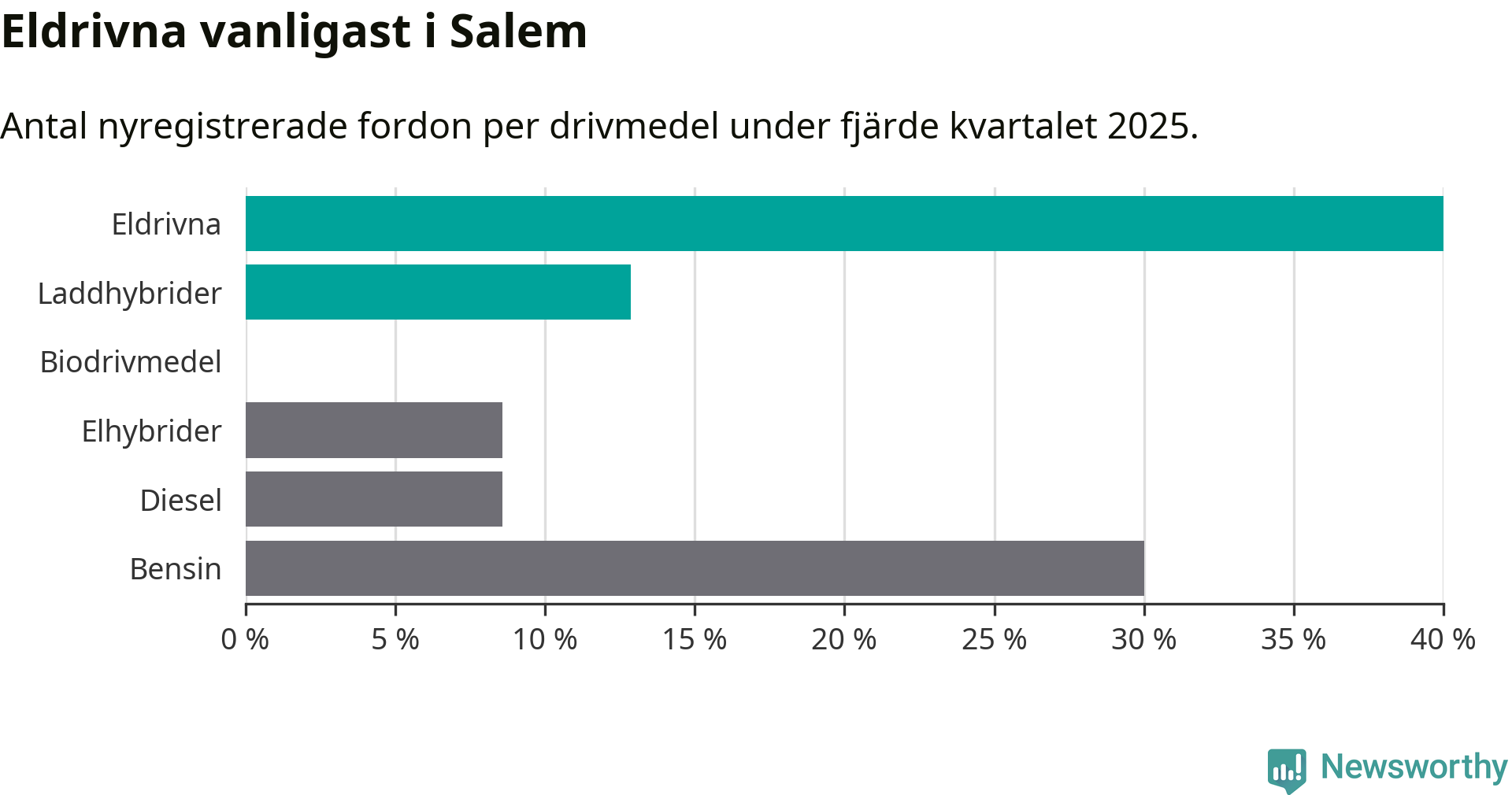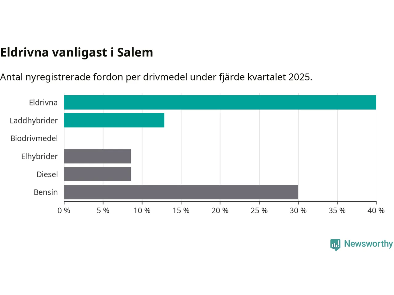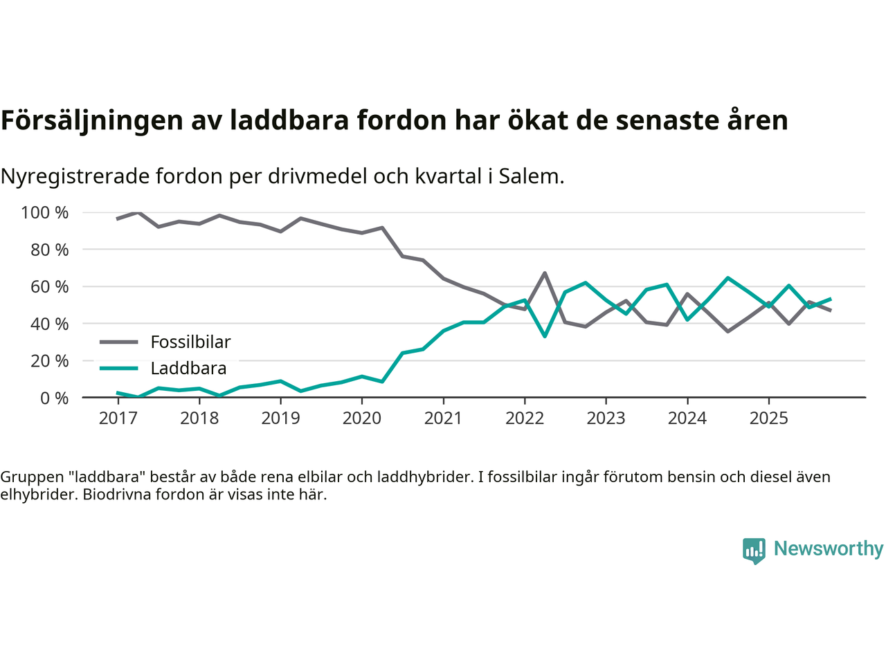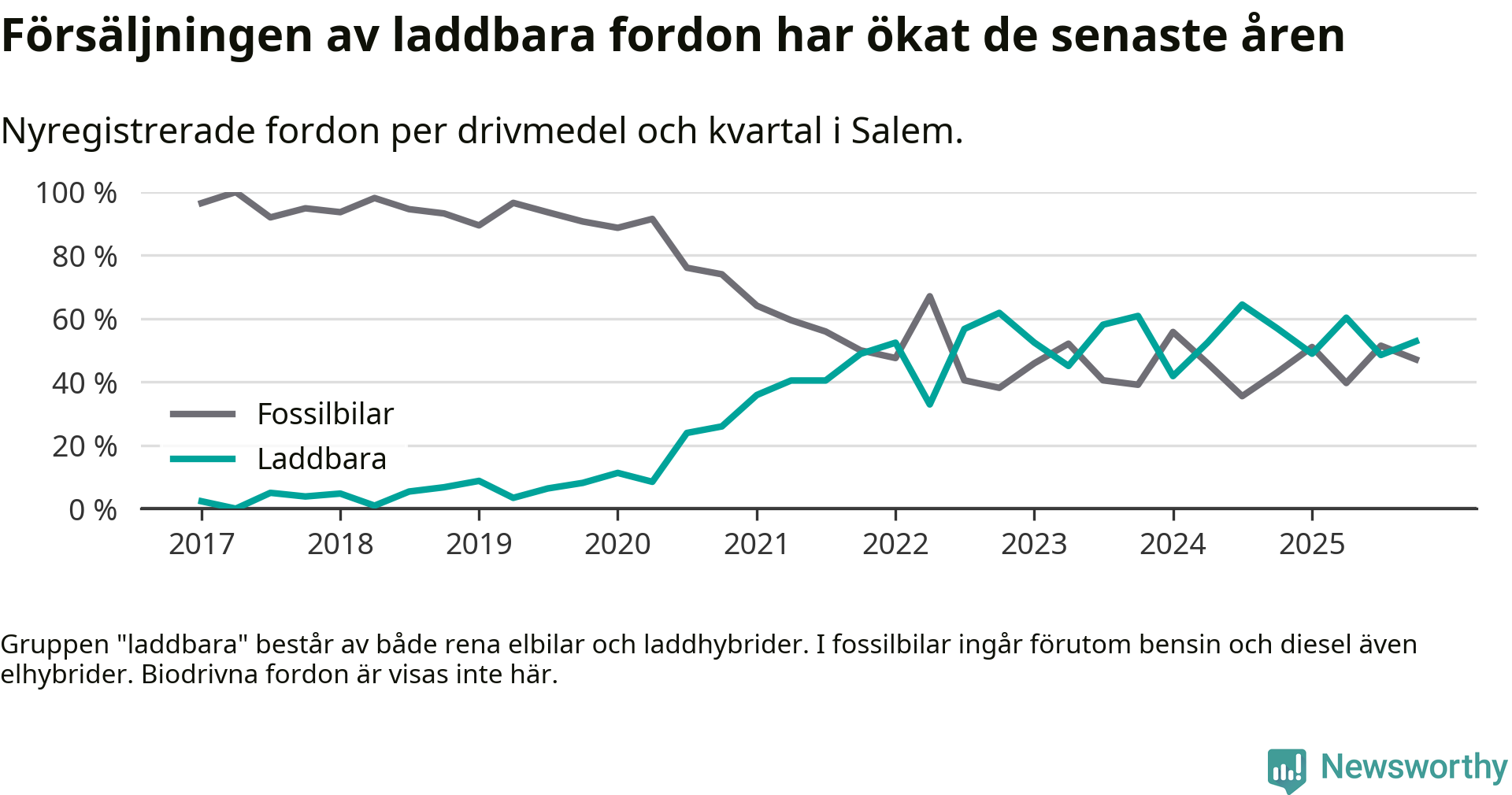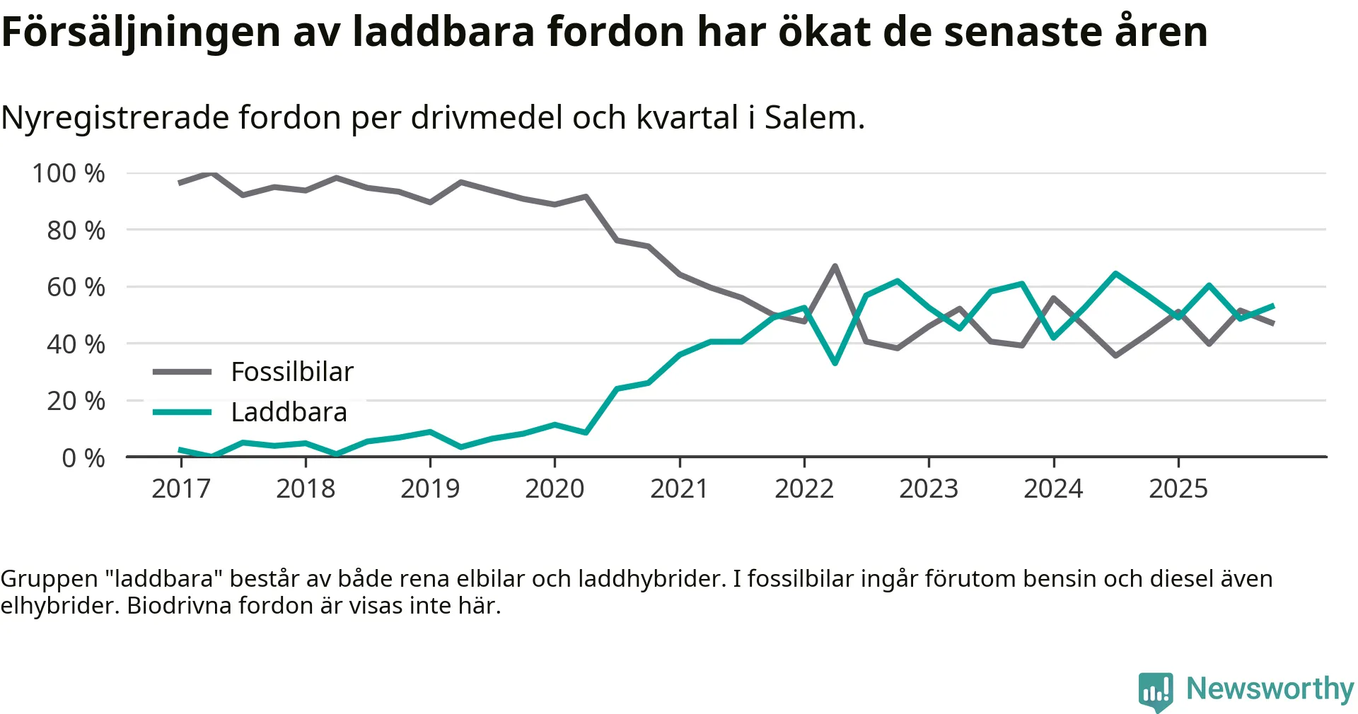 Under fjärde kvartalet 2025 var 53 procent av alla nyregistrerade personbilar i Salem laddbara (sammanlagt registrerades 70 nya bilar). Merparten av de laddbara bilarna var rena elbilar (40 procent av alla).