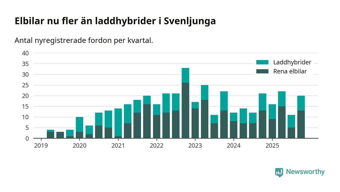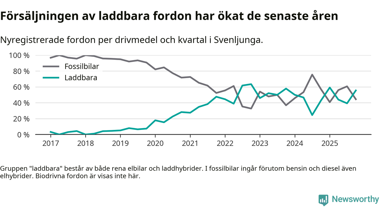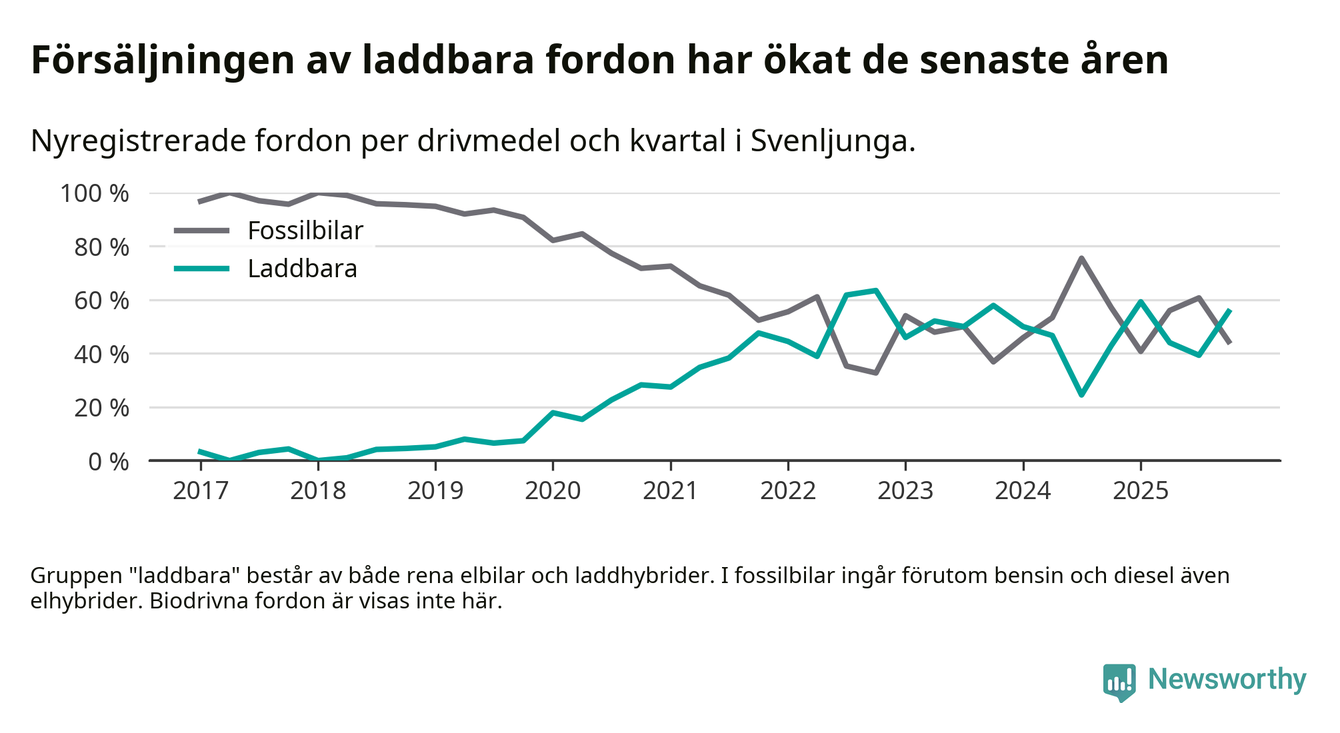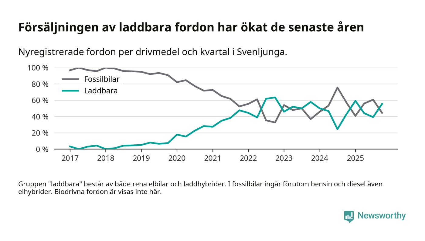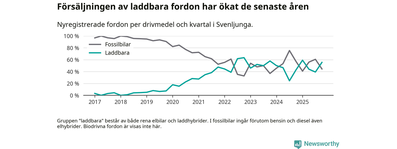 Under fjärde kvartalet 2025 var 56 procent av alla nyregistrerade personbilar i Svenljunga laddbara (sammanlagt registrerades 36 nya bilar). Merparten av de laddbara bilarna var rena elbilar (36 procent av alla).