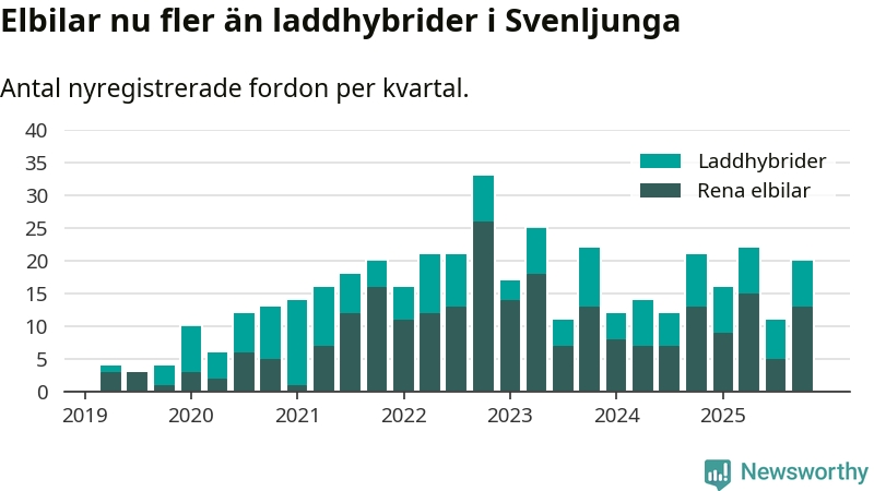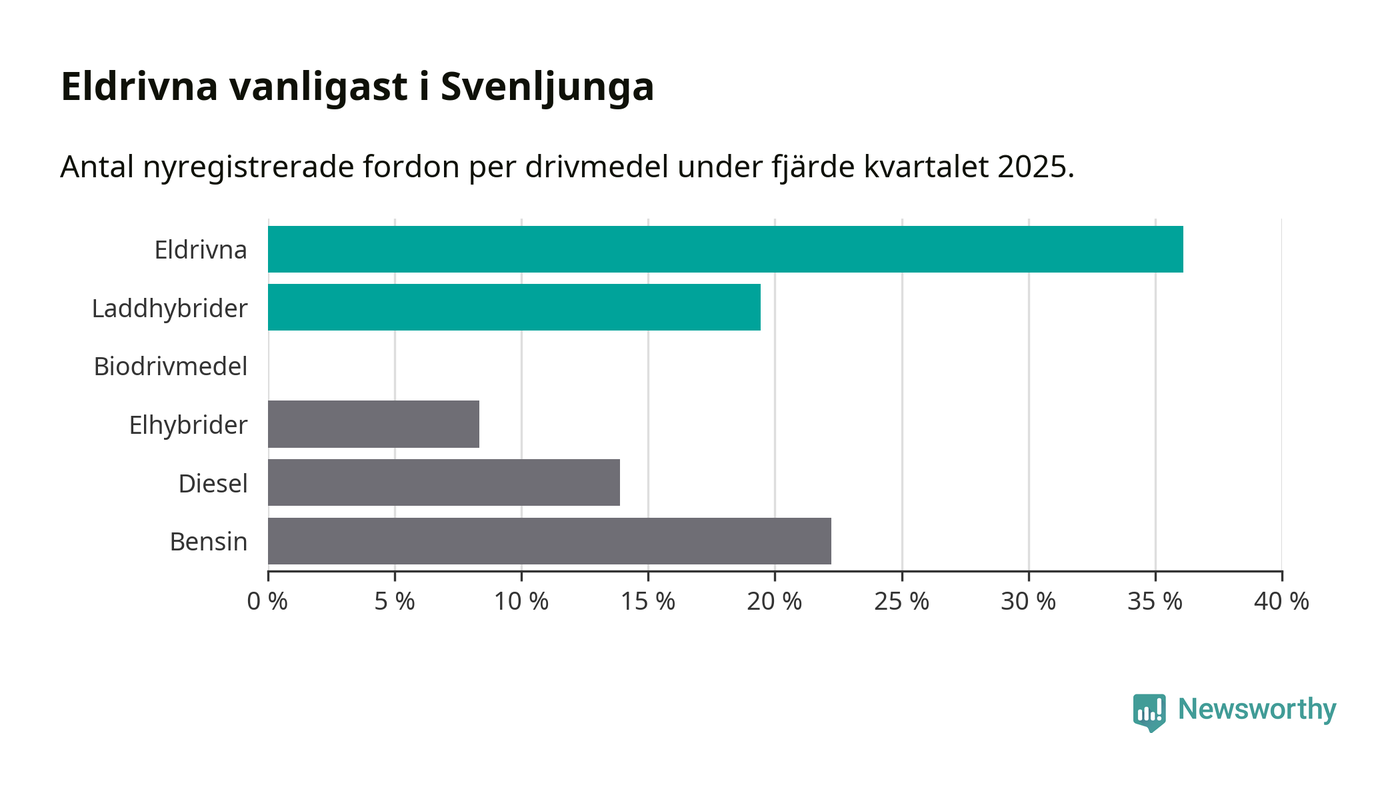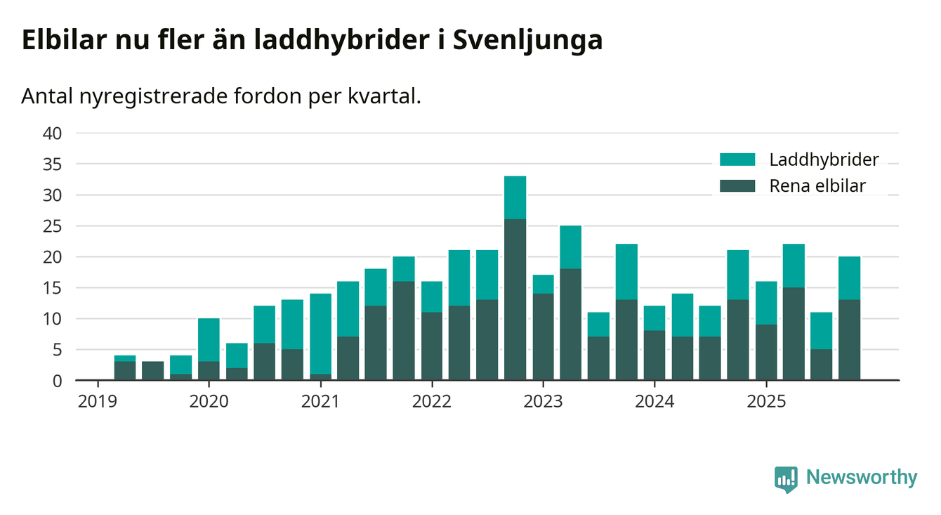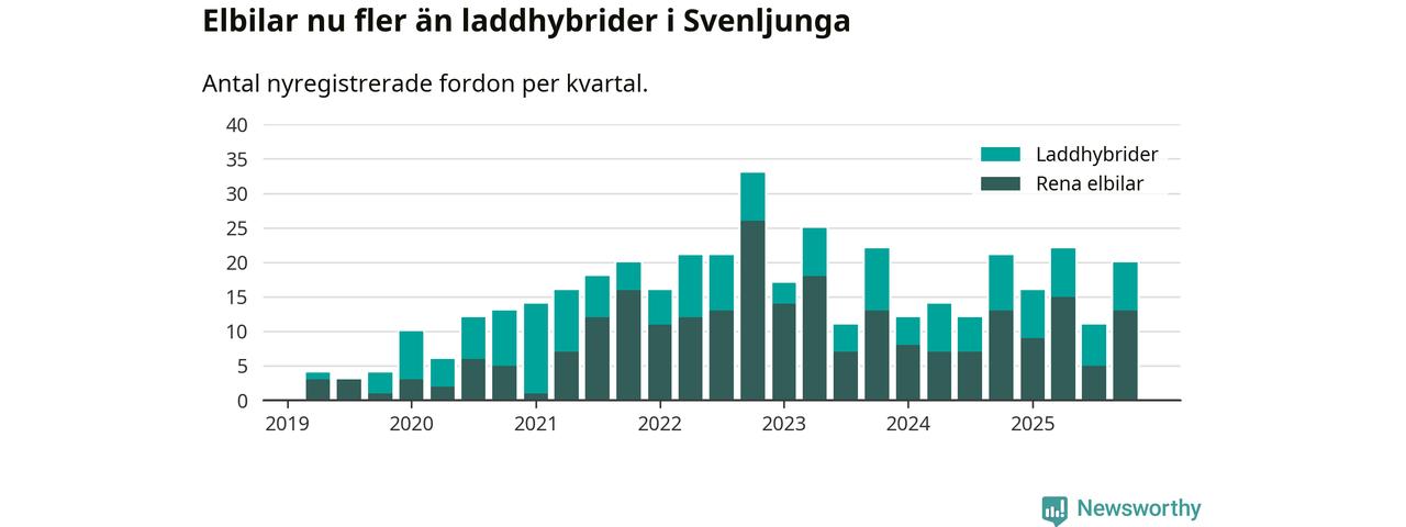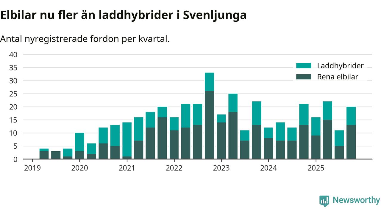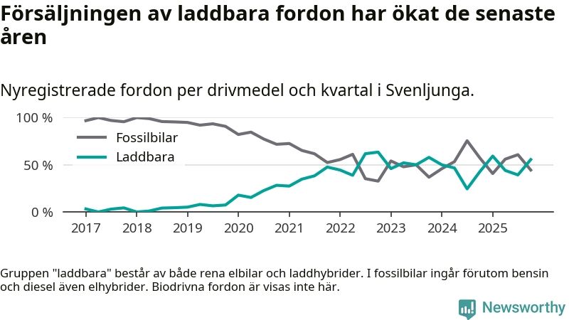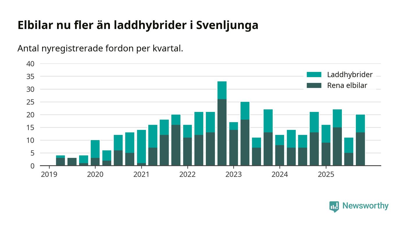 Under fjärde kvartalet 2025 var 56 procent av alla nyregistrerade personbilar i Svenljunga laddbara (sammanlagt registrerades 36 nya bilar). Merparten av de laddbara bilarna var rena elbilar (36 procent av alla).