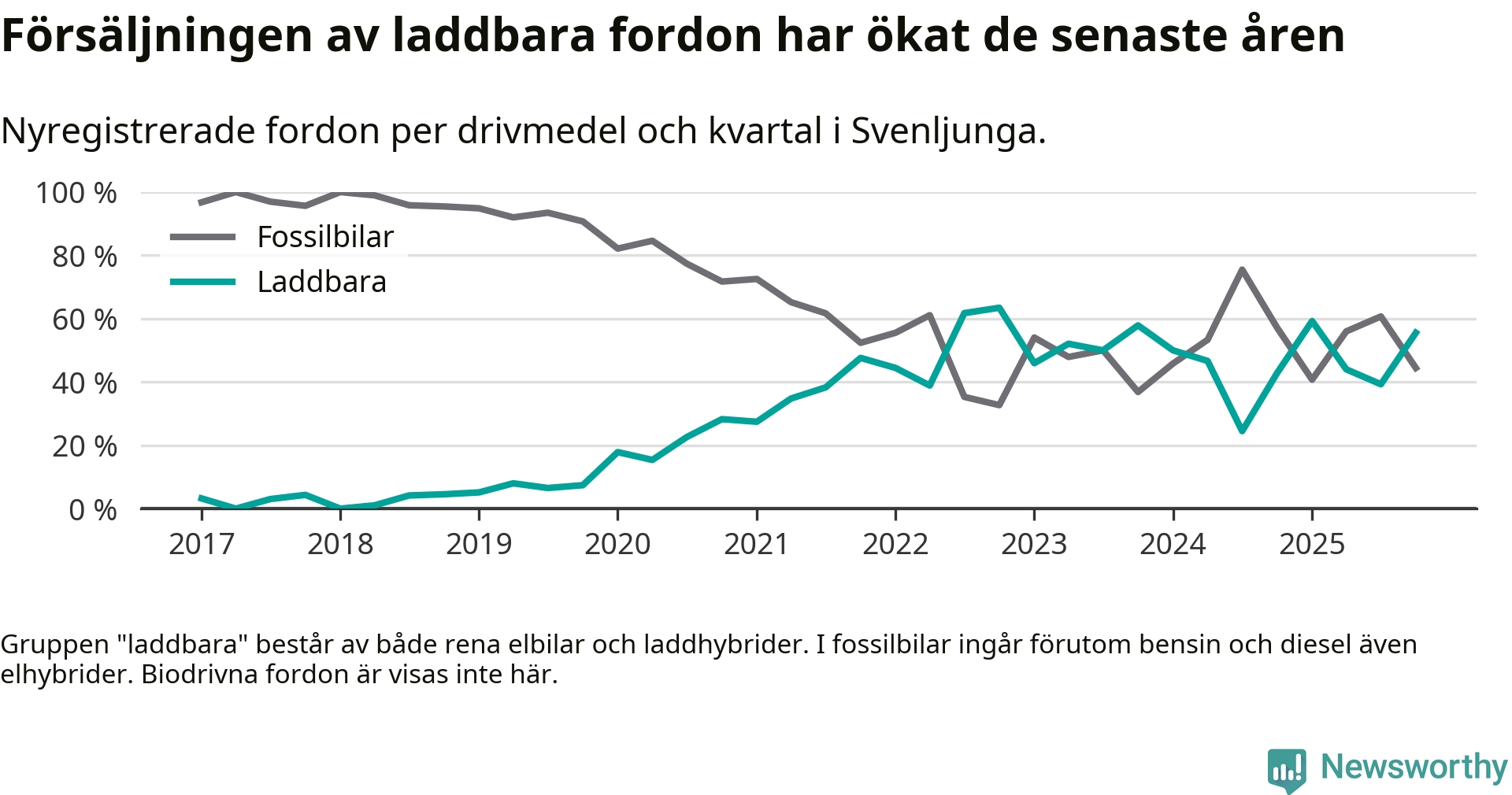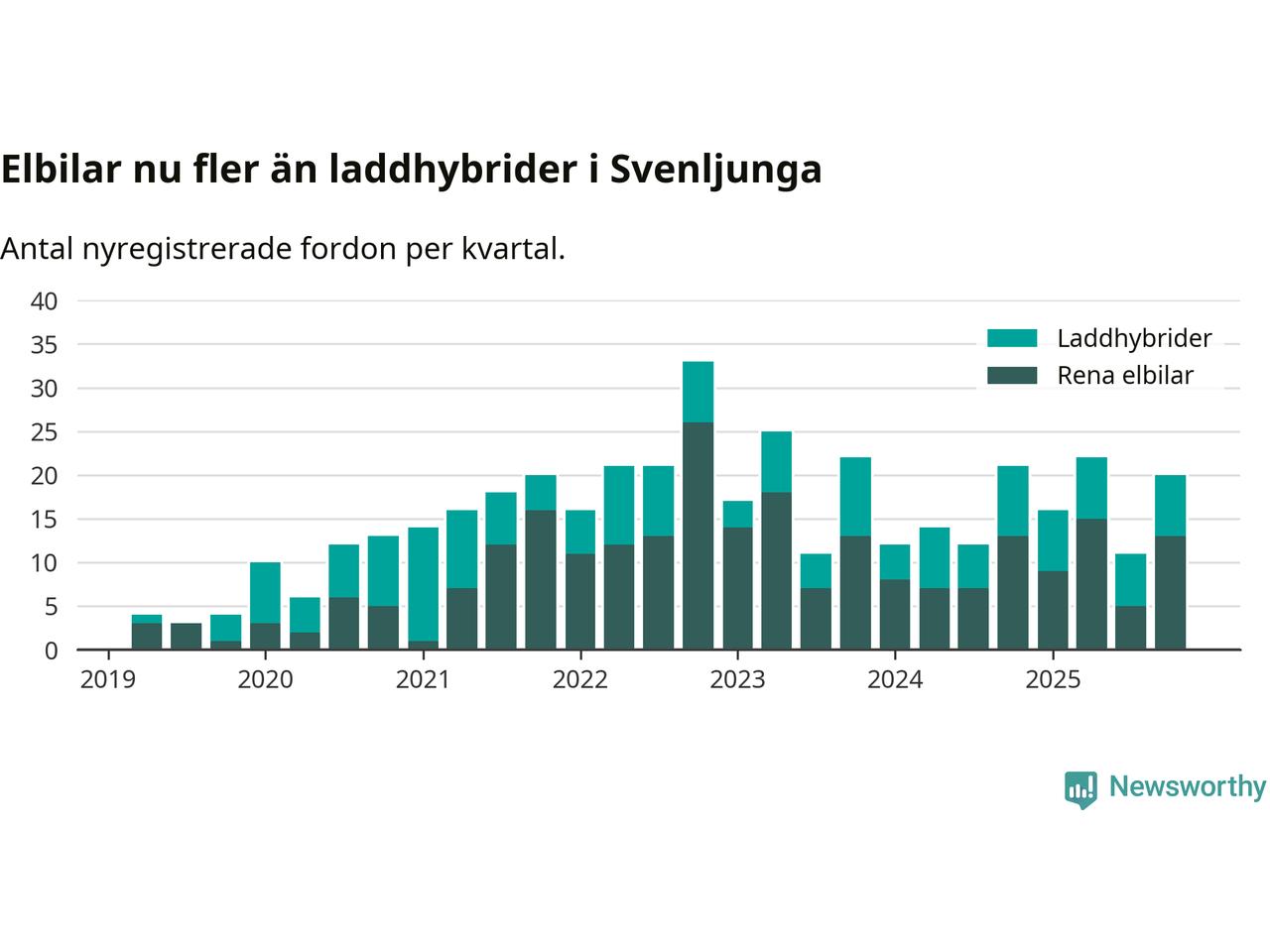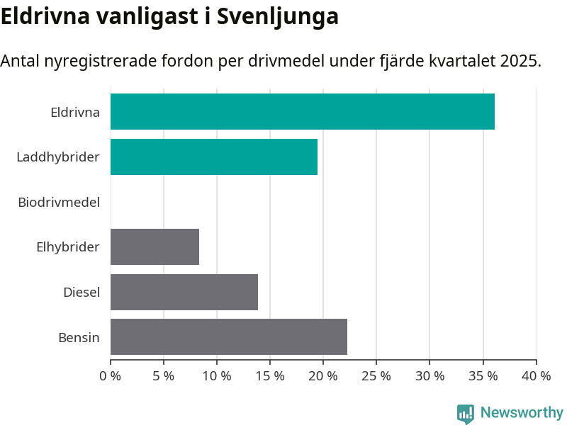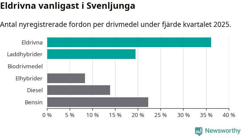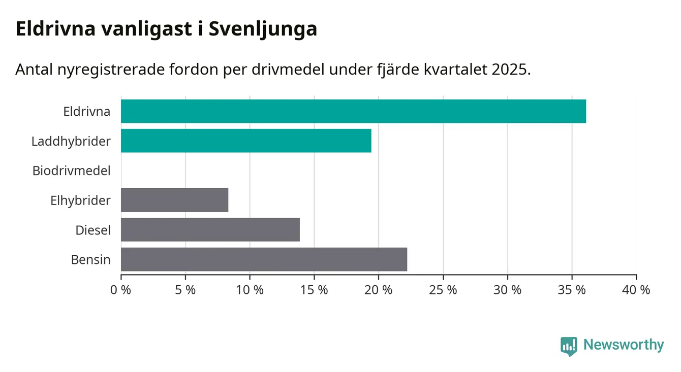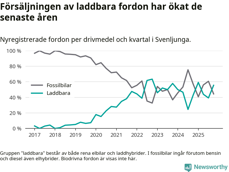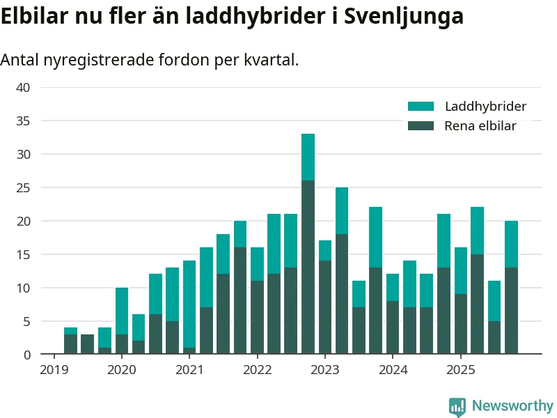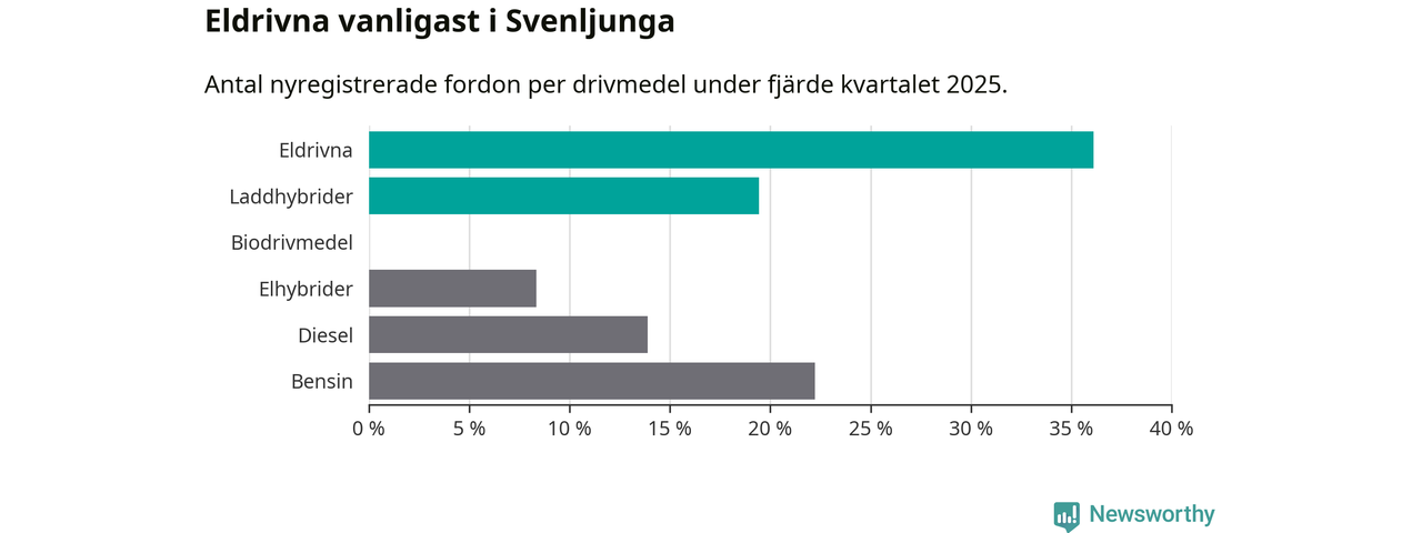 Under fjärde kvartalet 2025 var 56 procent av alla nyregistrerade personbilar i Svenljunga laddbara (sammanlagt registrerades 36 nya bilar). Merparten av de laddbara bilarna var rena elbilar (36 procent av alla).