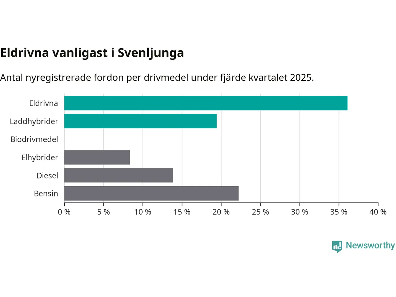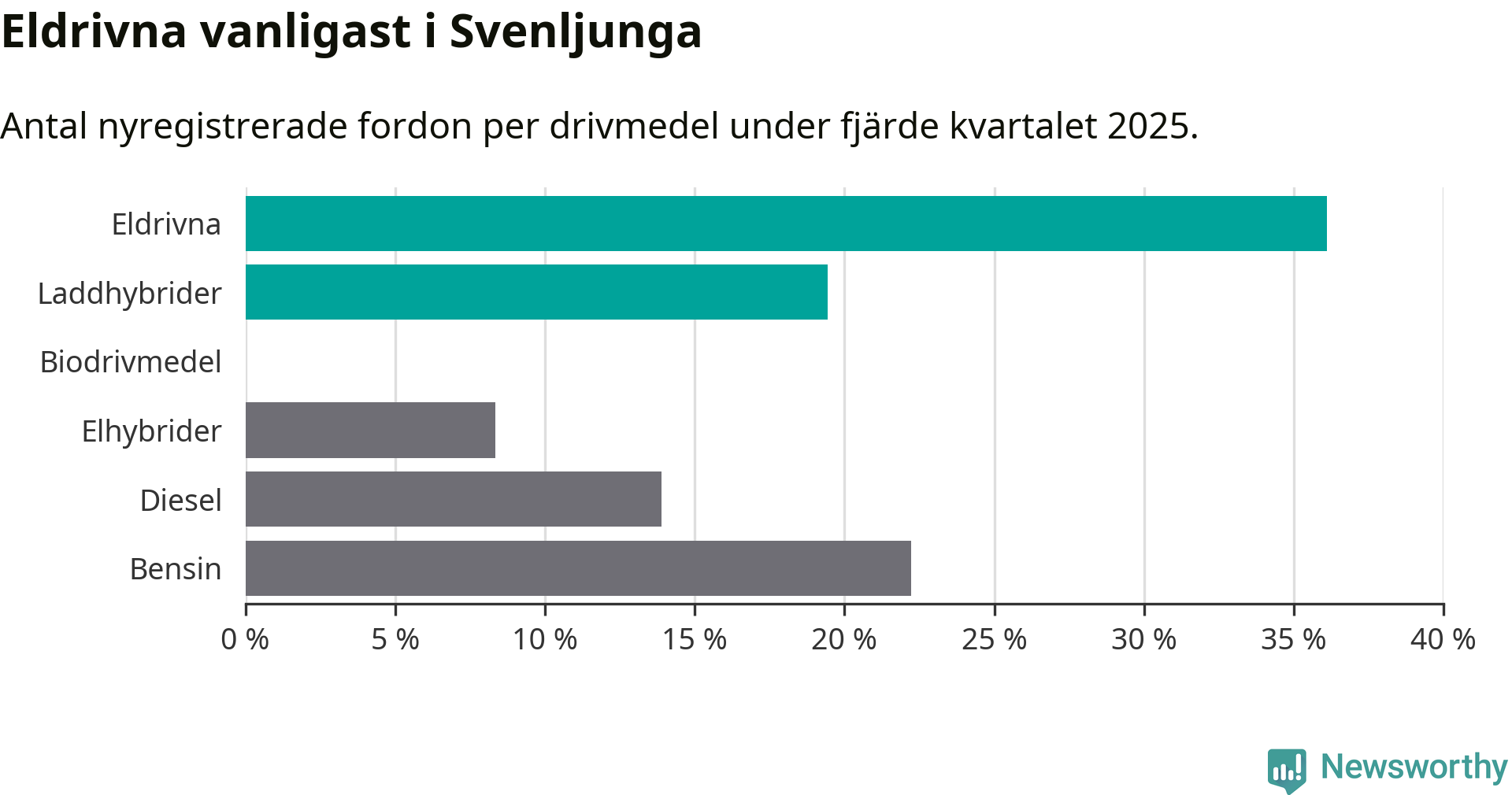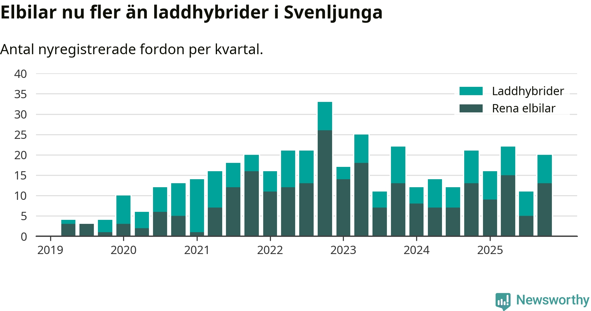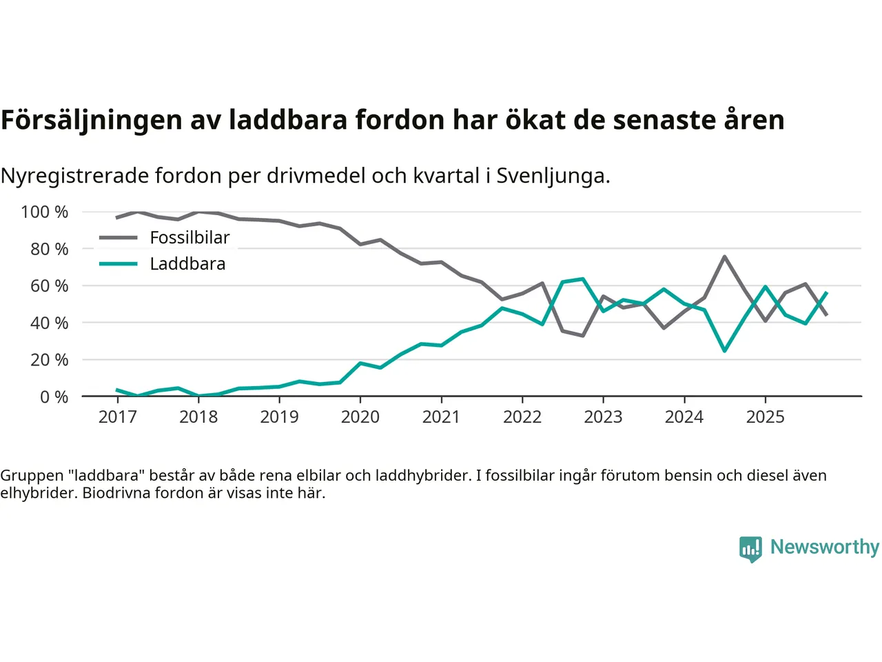 Under fjärde kvartalet 2025 var 56 procent av alla nyregistrerade personbilar i Svenljunga laddbara (sammanlagt registrerades 36 nya bilar). Merparten av de laddbara bilarna var rena elbilar (36 procent av alla).