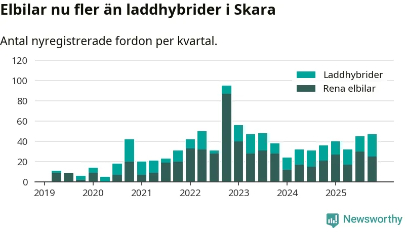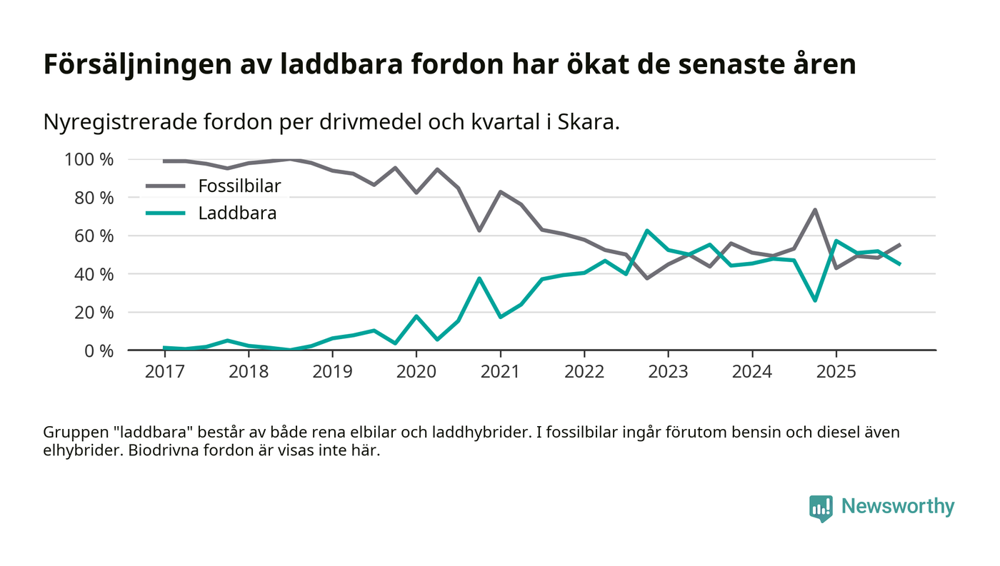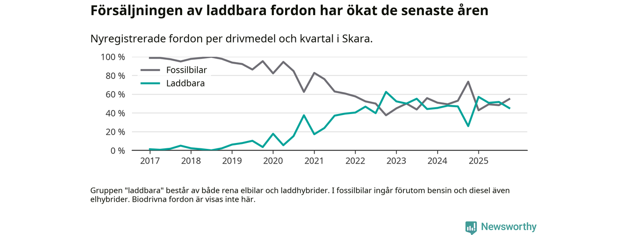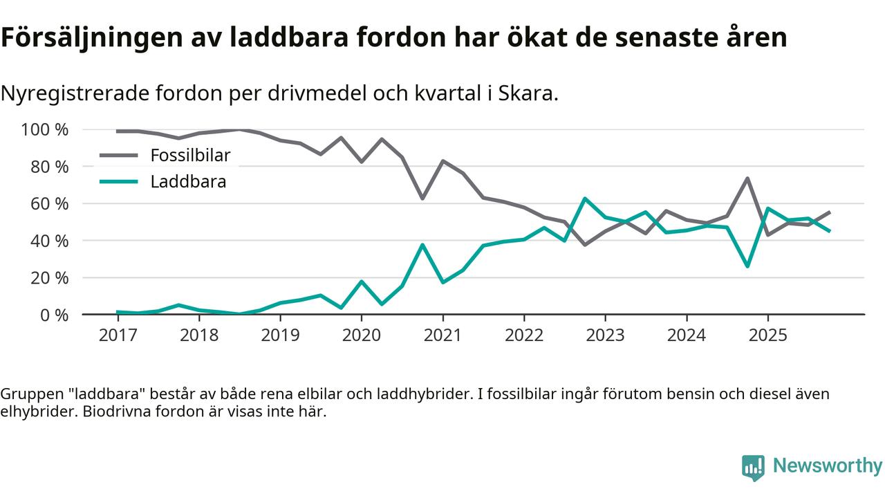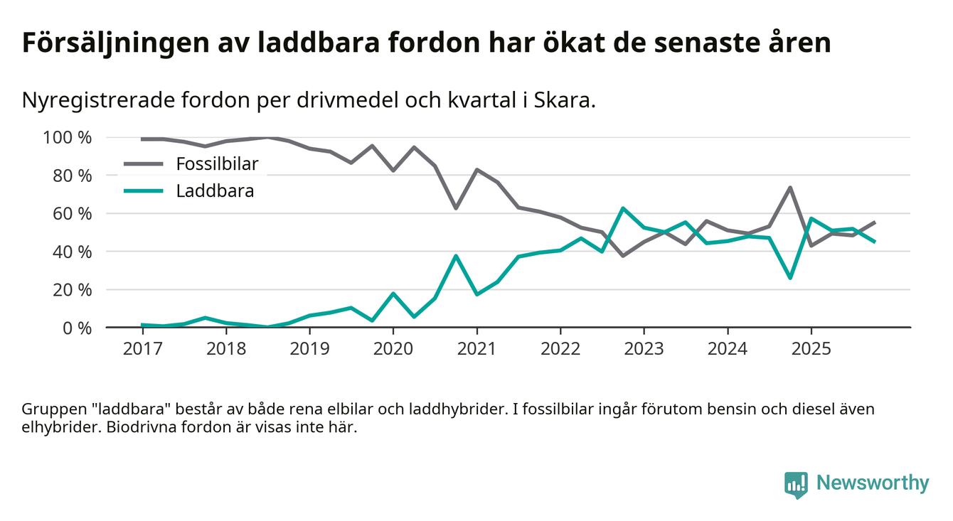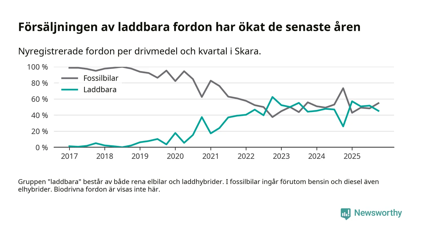 Under fjärde kvartalet 2025 var 45 procent av alla nyregistrerade personbilar i Skara laddbara (sammanlagt registrerades 104 nya bilar). Merparten av de laddbara bilarna var rena elbilar (24 procent av alla).