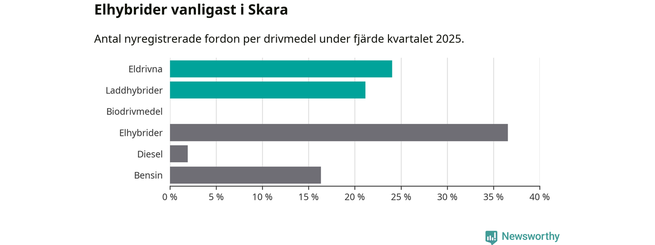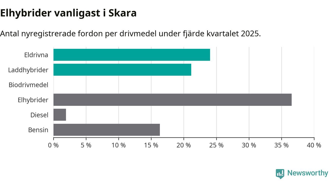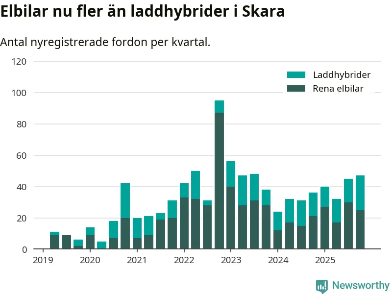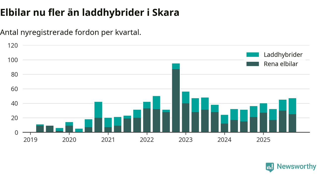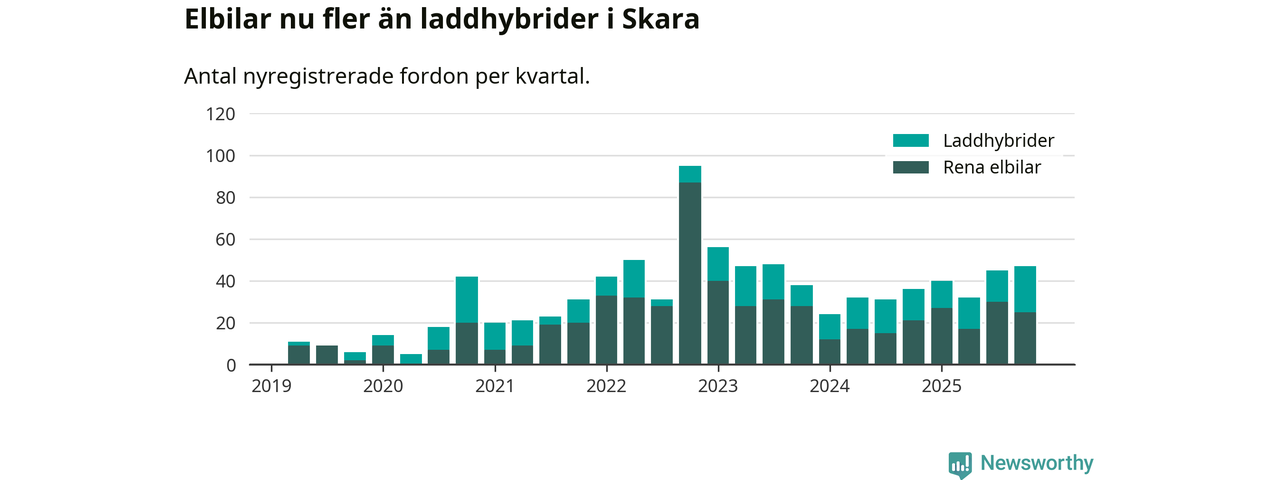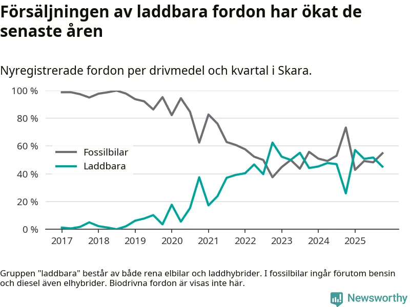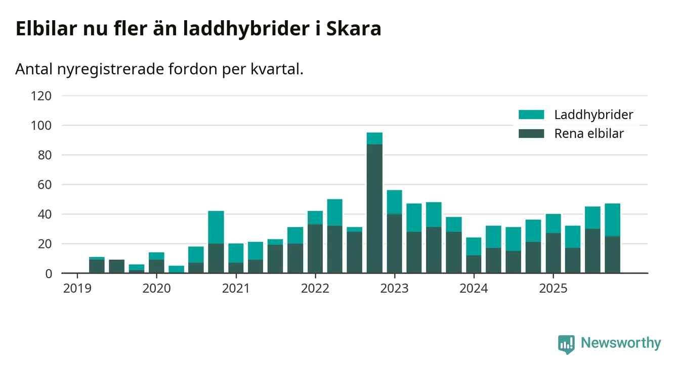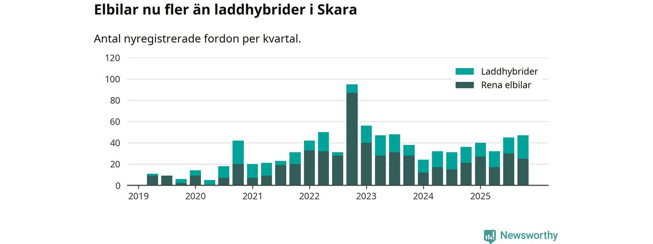 Under fjärde kvartalet 2025 var 45 procent av alla nyregistrerade personbilar i Skara laddbara (sammanlagt registrerades 104 nya bilar). Merparten av de laddbara bilarna var rena elbilar (24 procent av alla).
