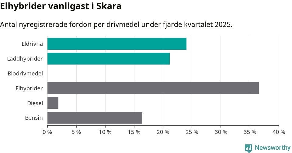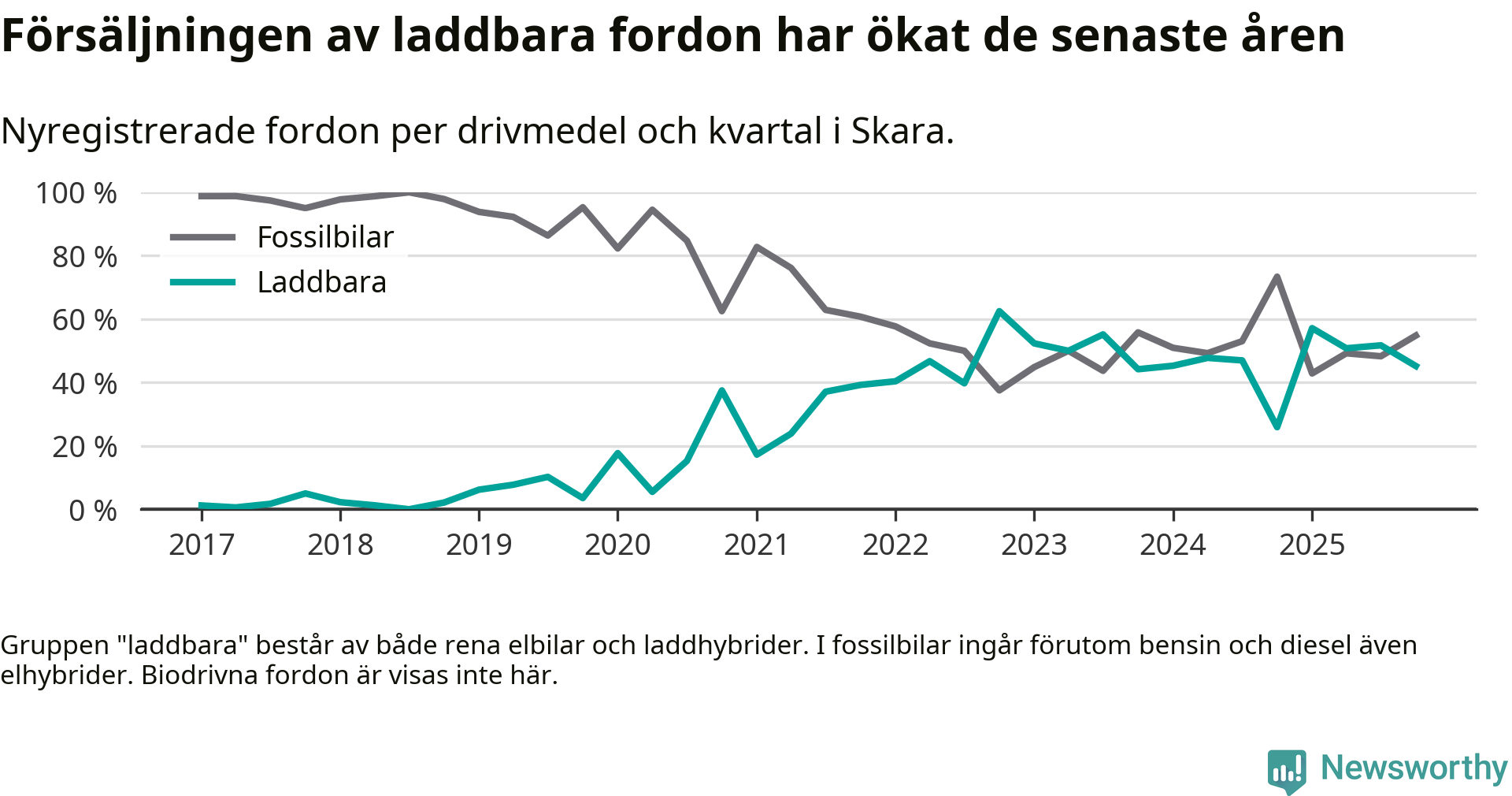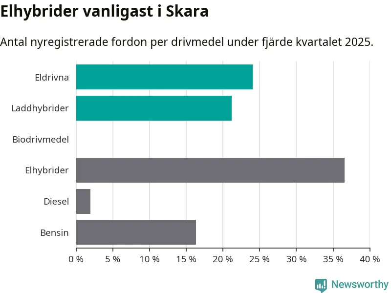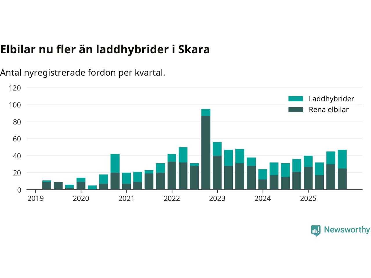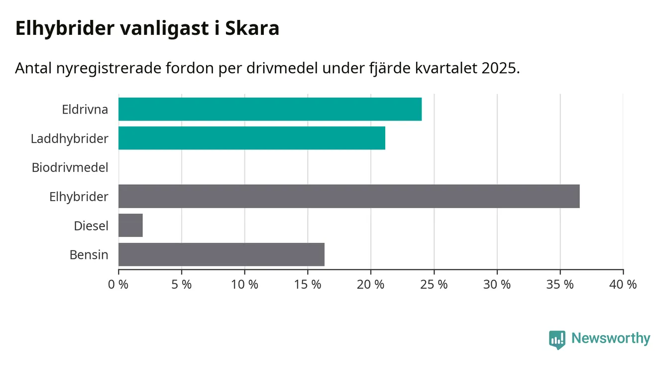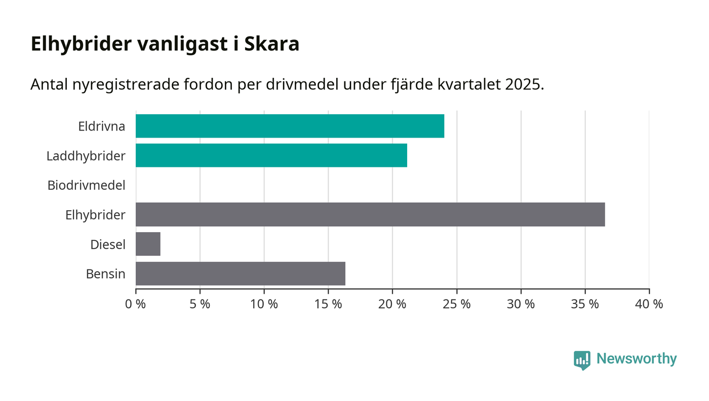 Under fjärde kvartalet 2025 var 45 procent av alla nyregistrerade personbilar i Skara laddbara (sammanlagt registrerades 104 nya bilar). Merparten av de laddbara bilarna var rena elbilar (24 procent av alla).