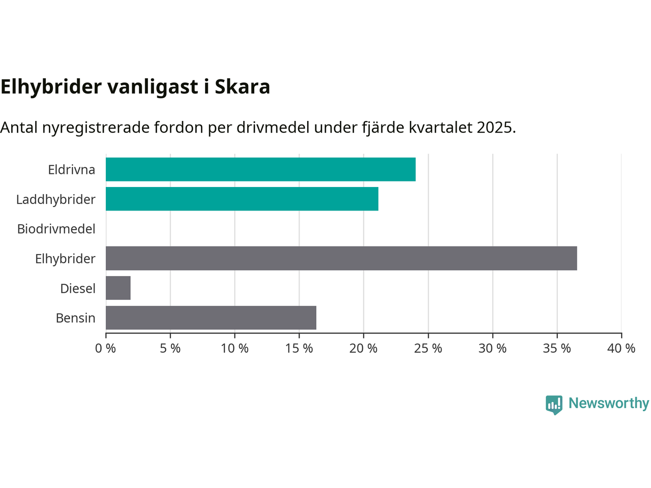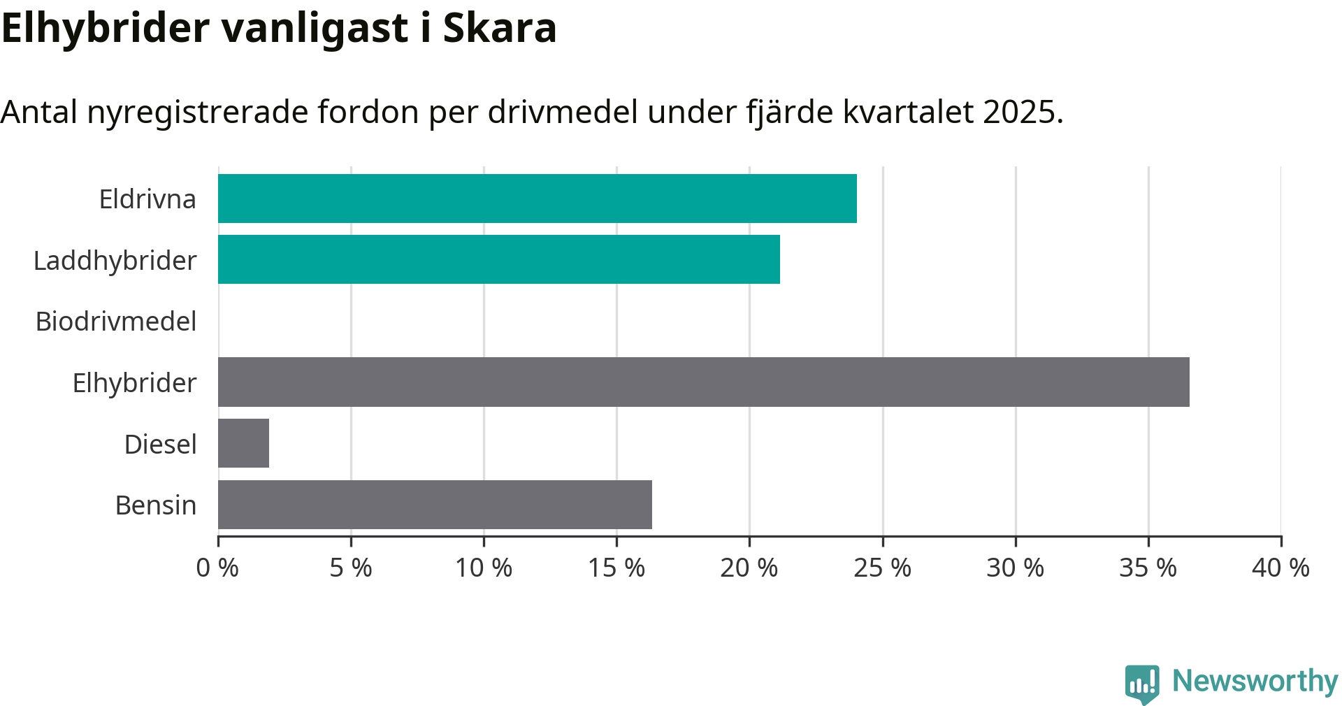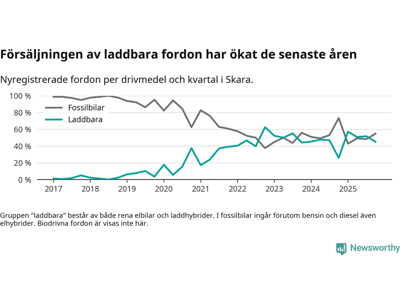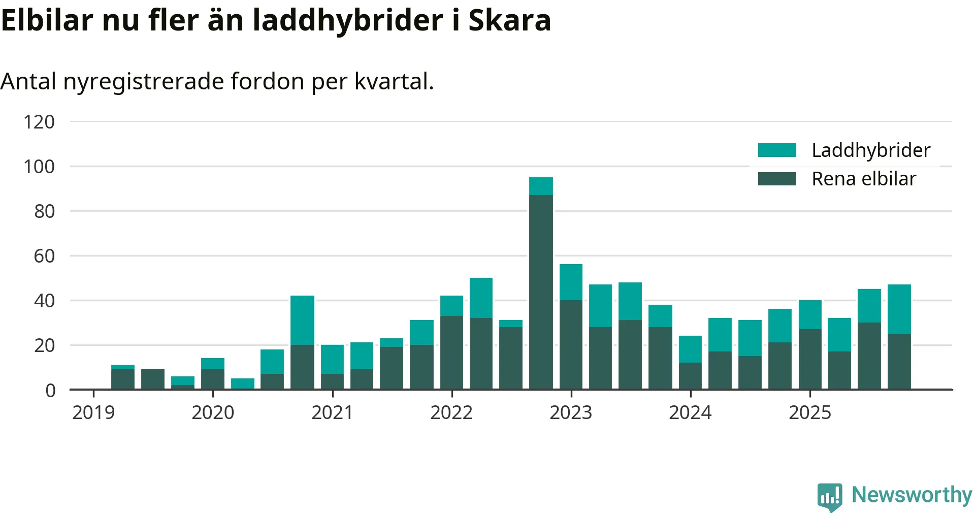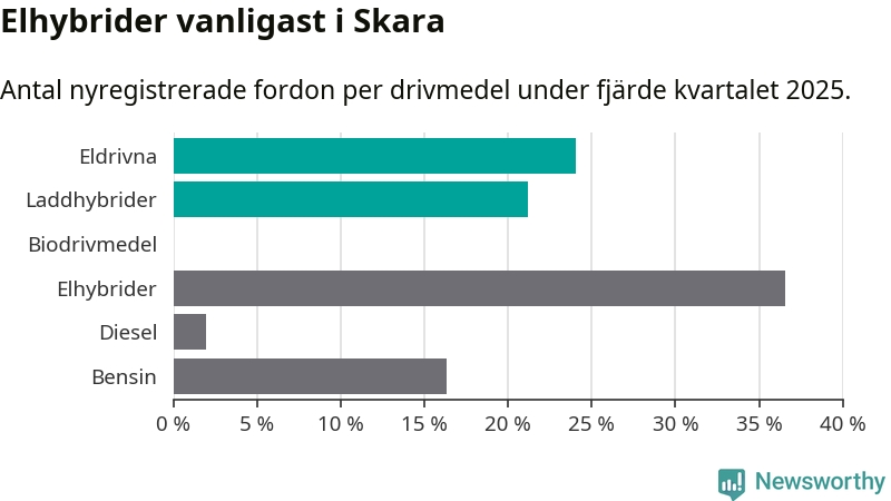 Under fjärde kvartalet 2025 var 45 procent av alla nyregistrerade personbilar i Skara laddbara (sammanlagt registrerades 104 nya bilar). Merparten av de laddbara bilarna var rena elbilar (24 procent av alla).