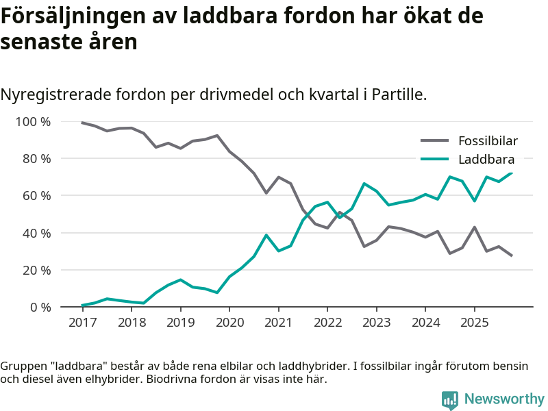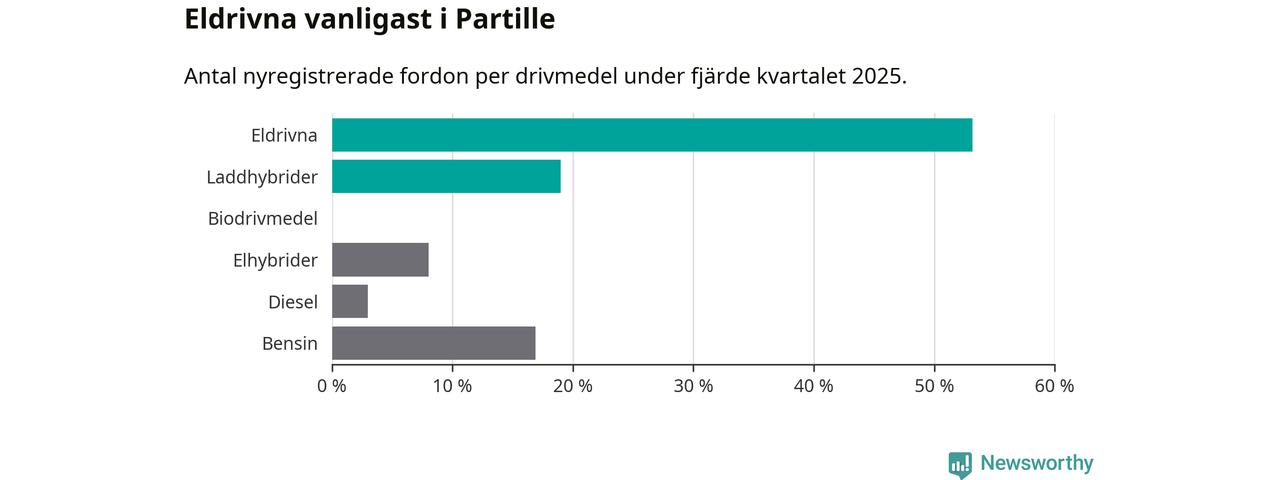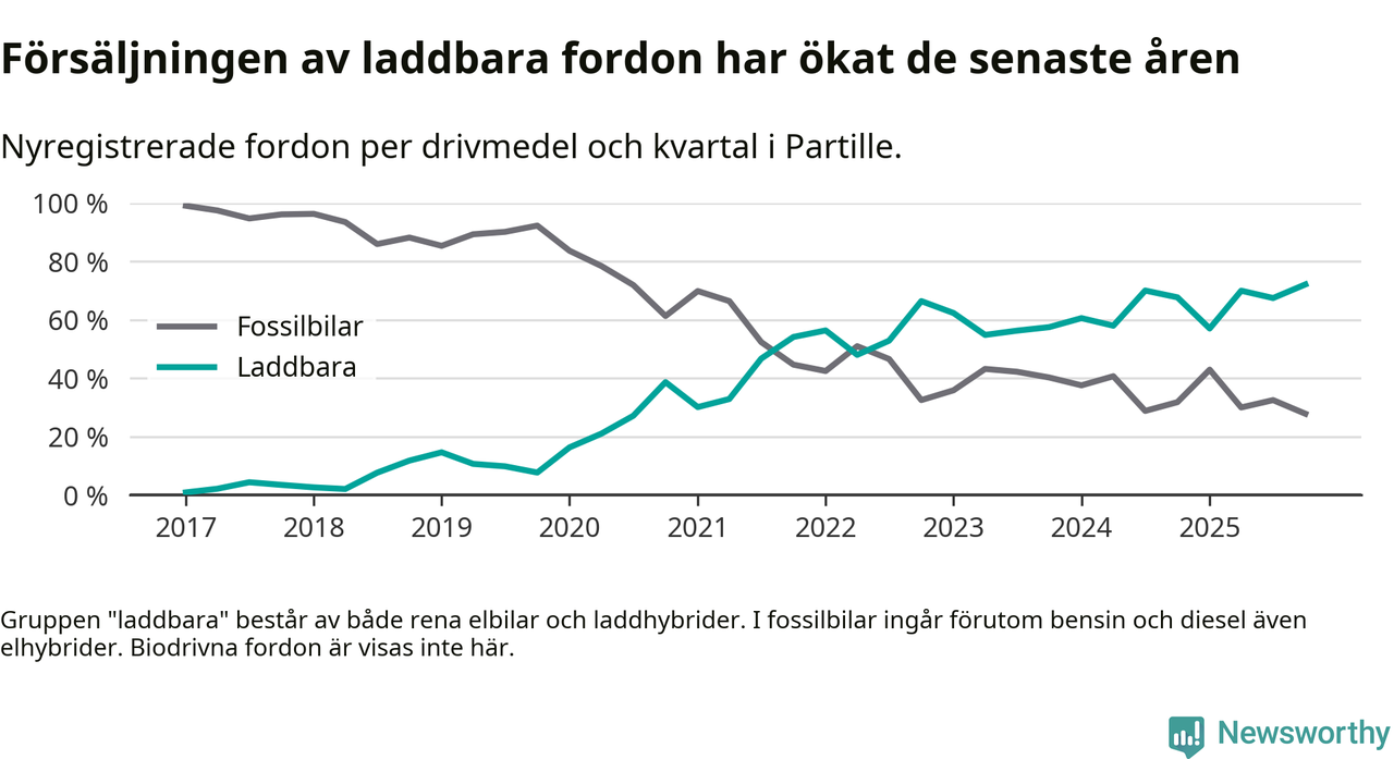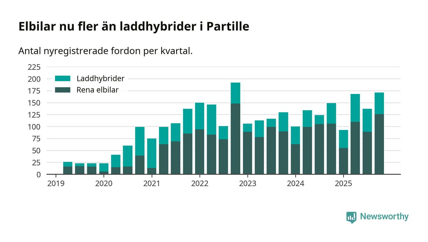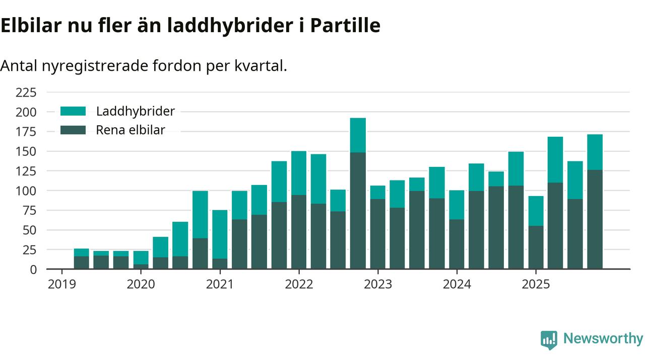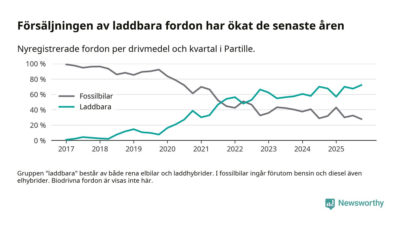 Under fjärde kvartalet 2025 var 72 procent av alla nyregistrerade personbilar i Partille laddbara (sammanlagt registrerades 237 nya bilar). Merparten av de laddbara bilarna var rena elbilar (53 procent av alla).