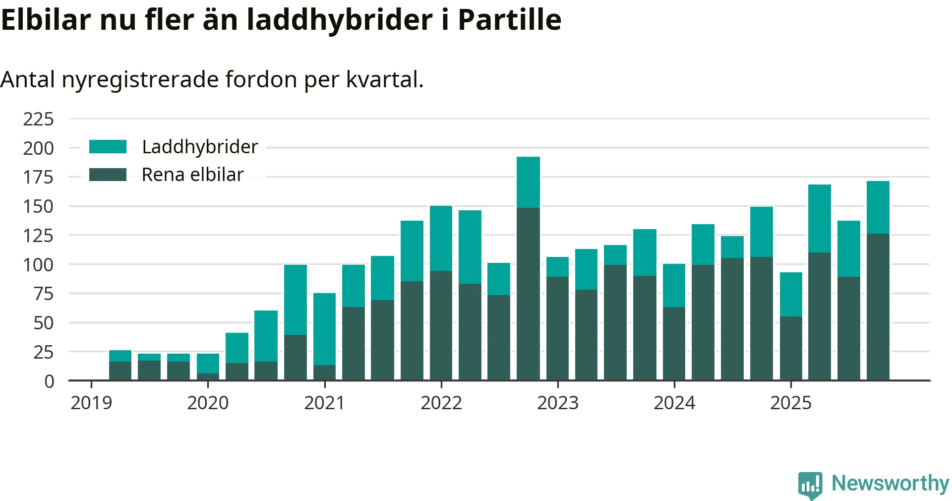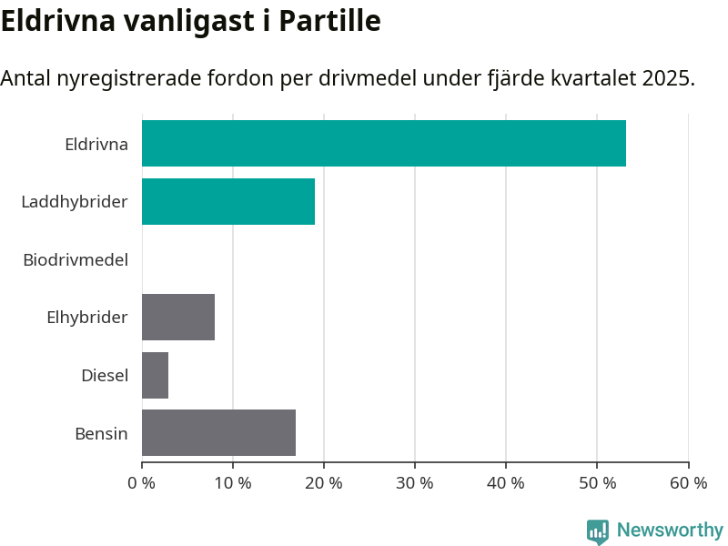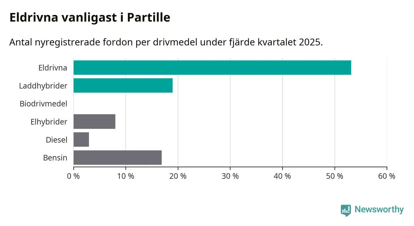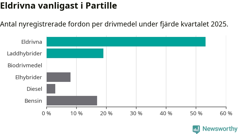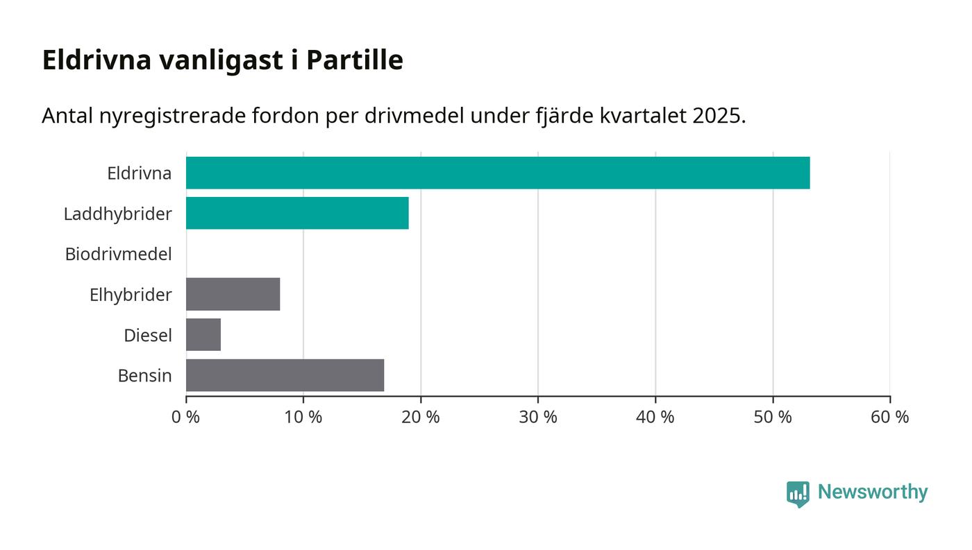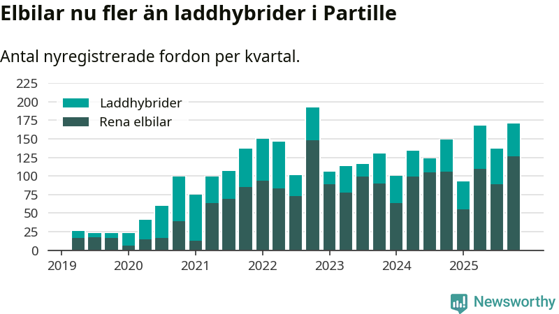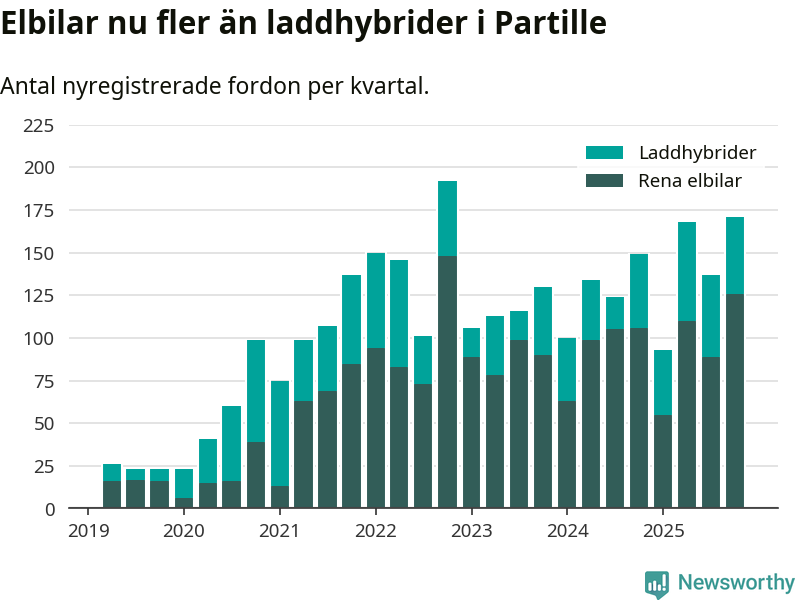 Under fjärde kvartalet 2025 var 72 procent av alla nyregistrerade personbilar i Partille laddbara (sammanlagt registrerades 237 nya bilar). Merparten av de laddbara bilarna var rena elbilar (53 procent av alla).