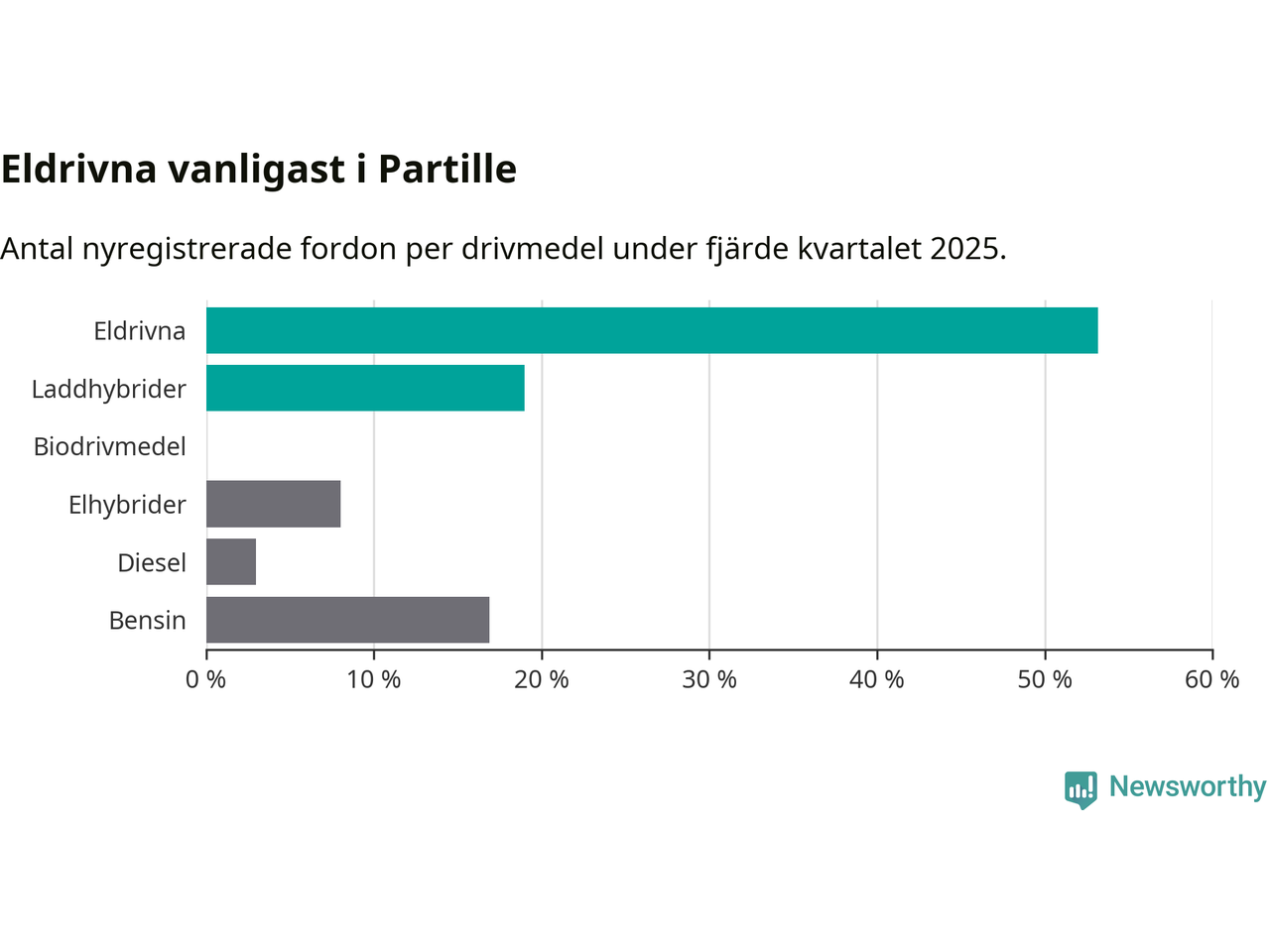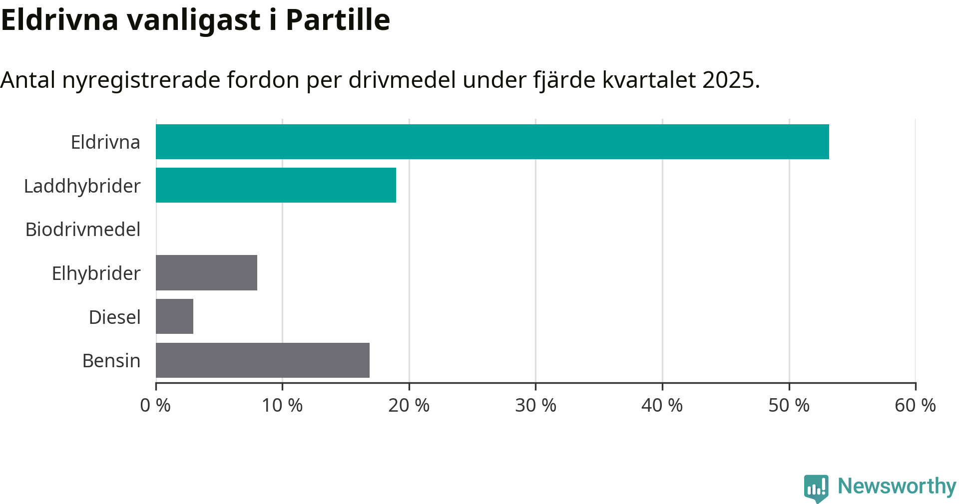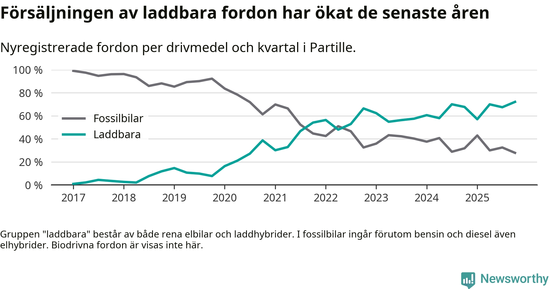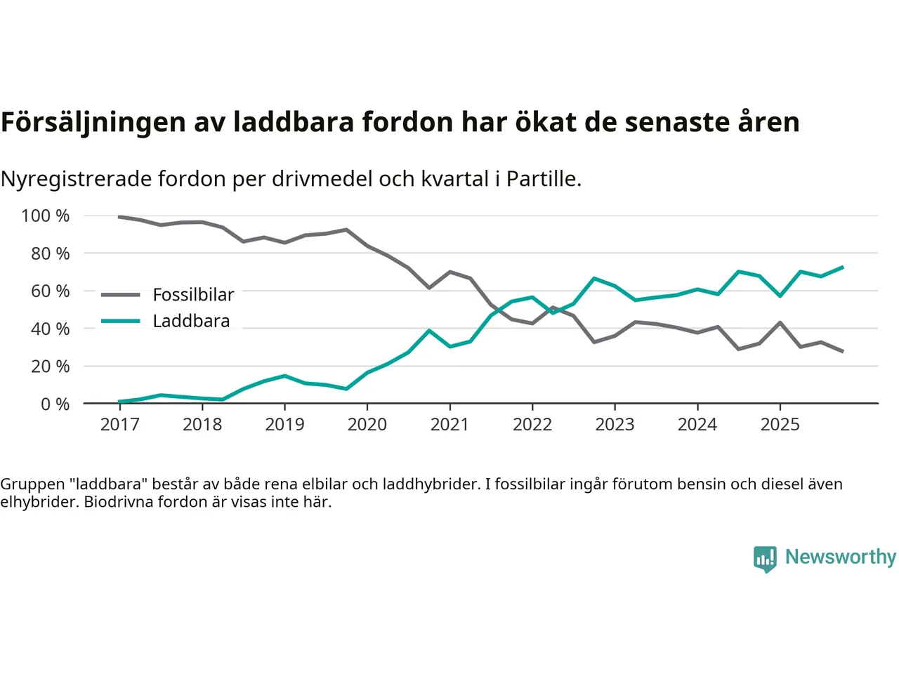 Under fjärde kvartalet 2025 var 72 procent av alla nyregistrerade personbilar i Partille laddbara (sammanlagt registrerades 237 nya bilar). Merparten av de laddbara bilarna var rena elbilar (53 procent av alla).