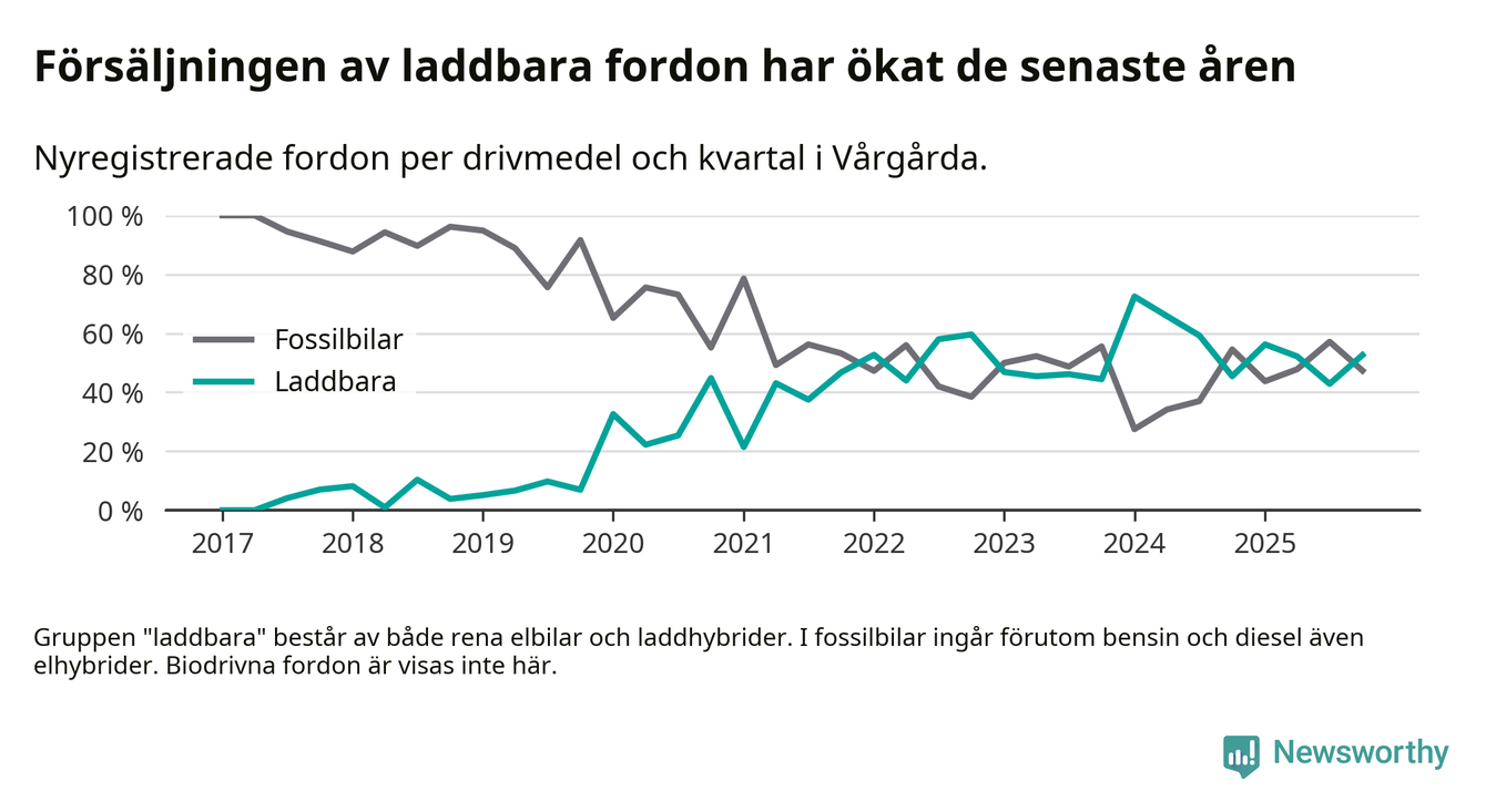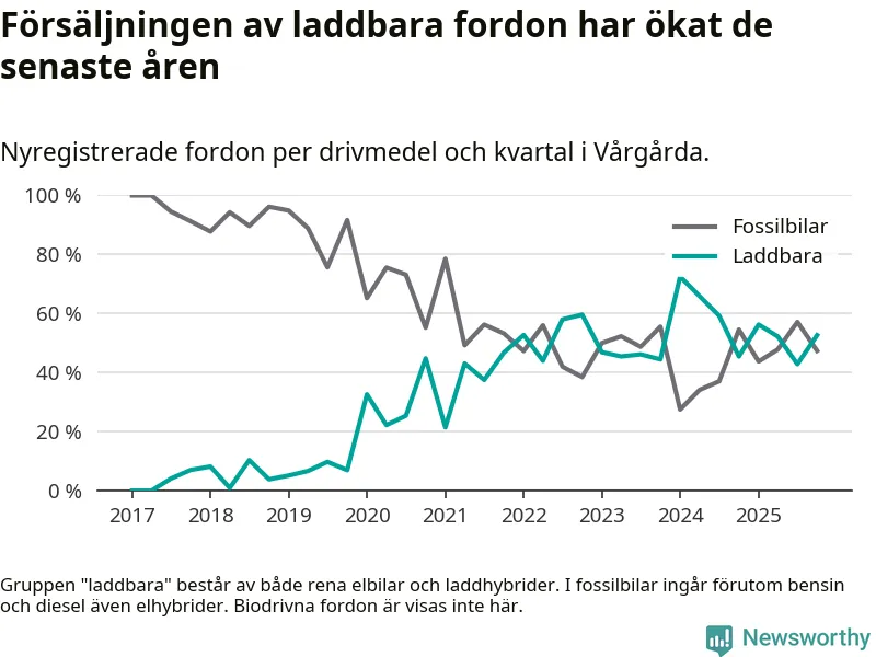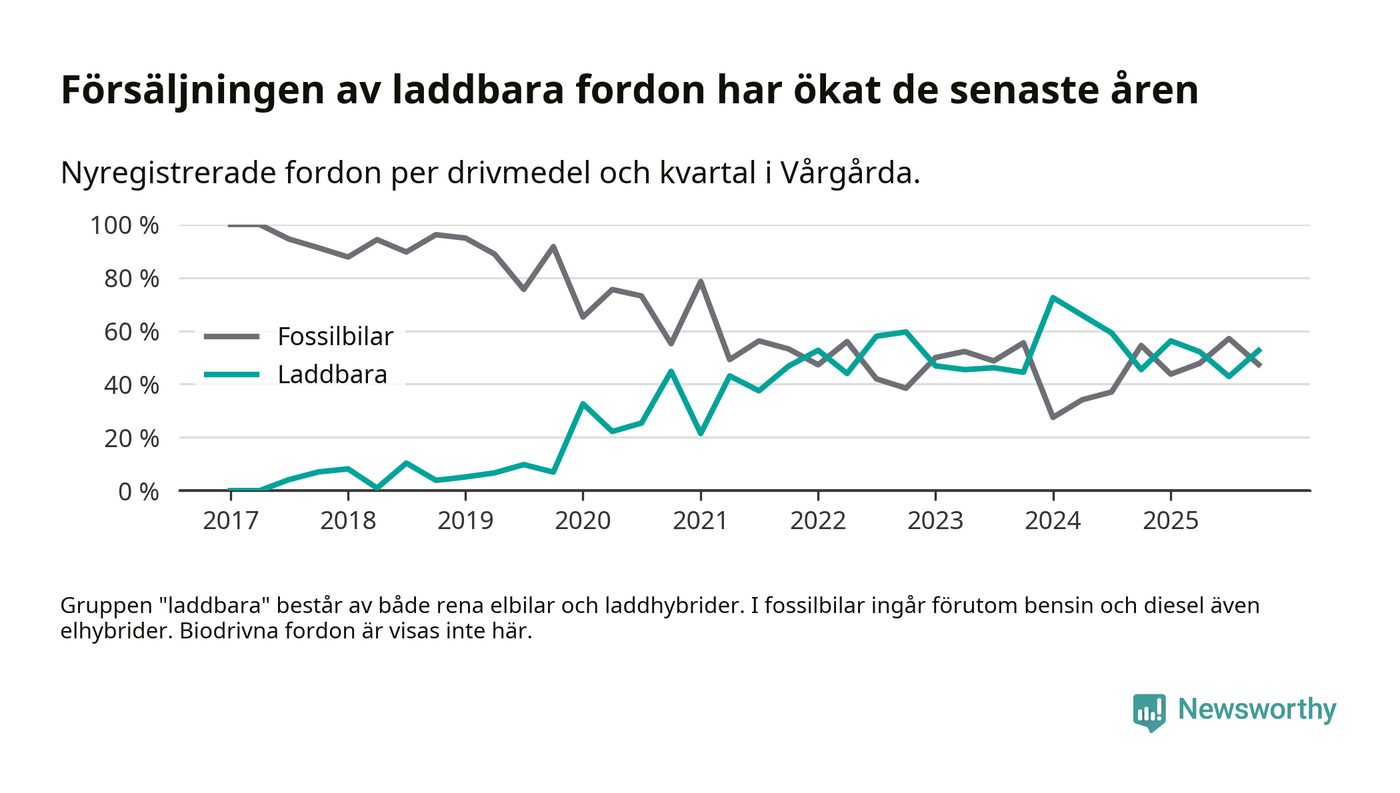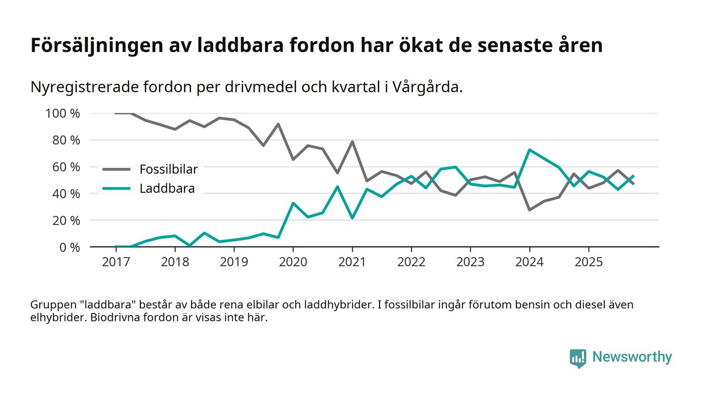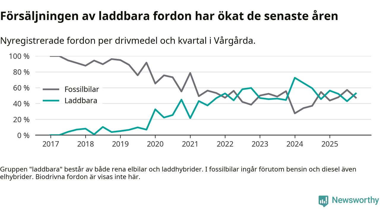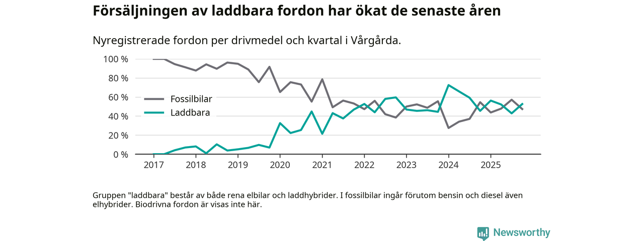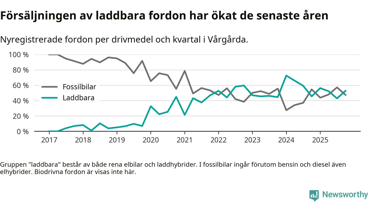 Under fjärde kvartalet 2025 var 53 procent av alla nyregistrerade personbilar i Vårgårda laddbara (sammanlagt registrerades 38 nya bilar). Merparten av de laddbara bilarna var rena elbilar (32 procent av alla).